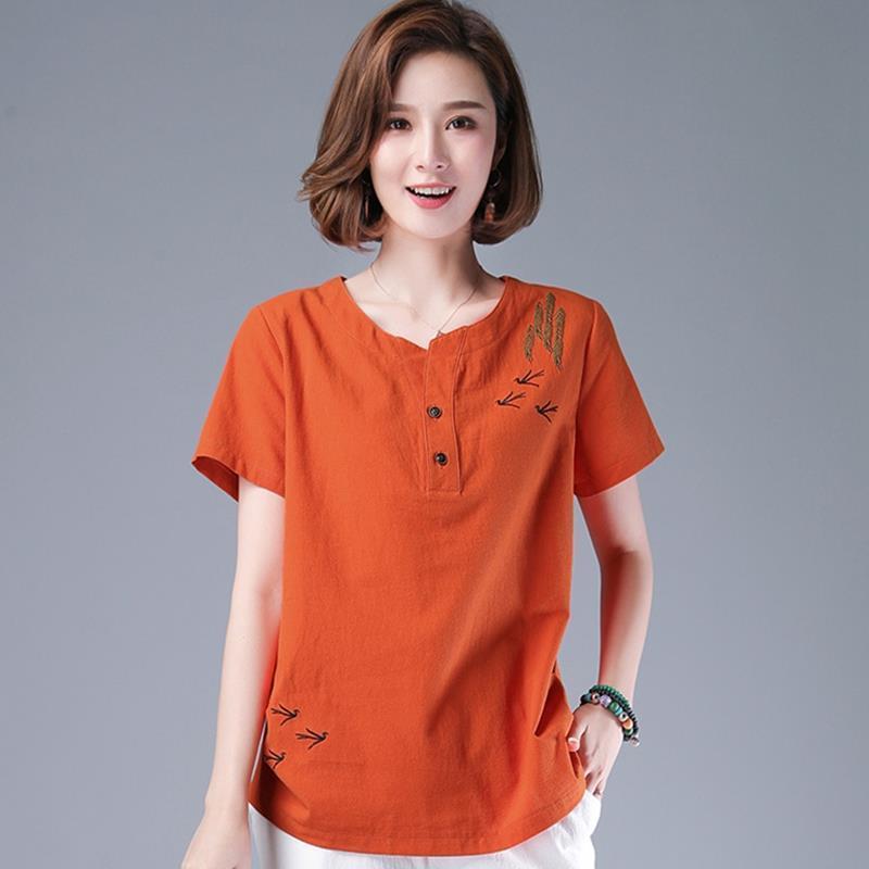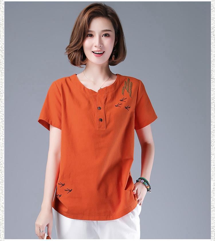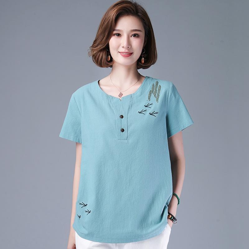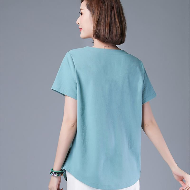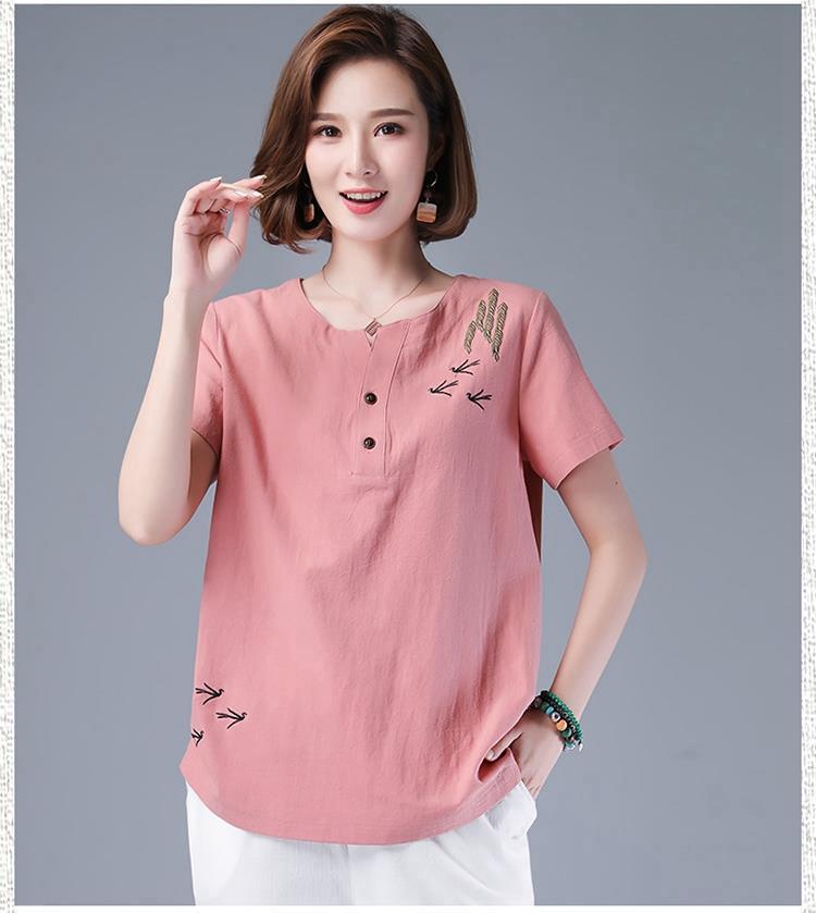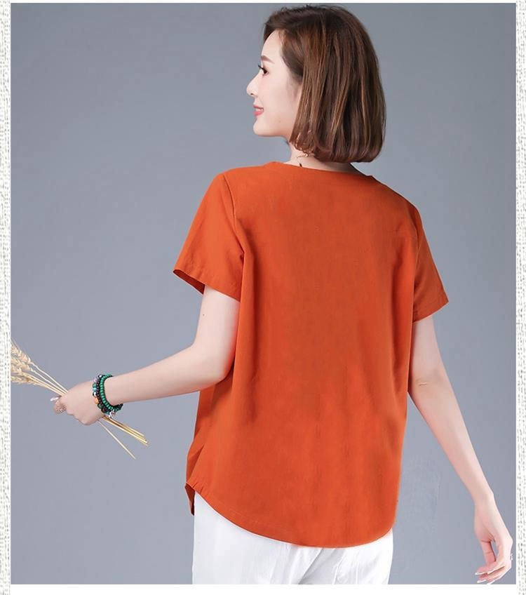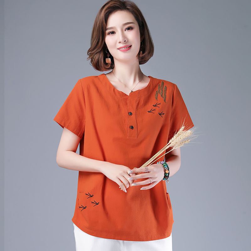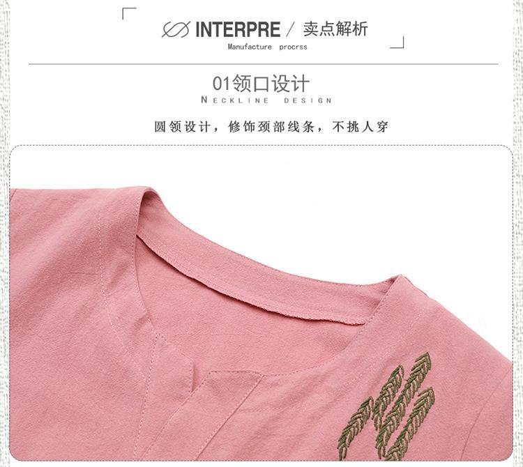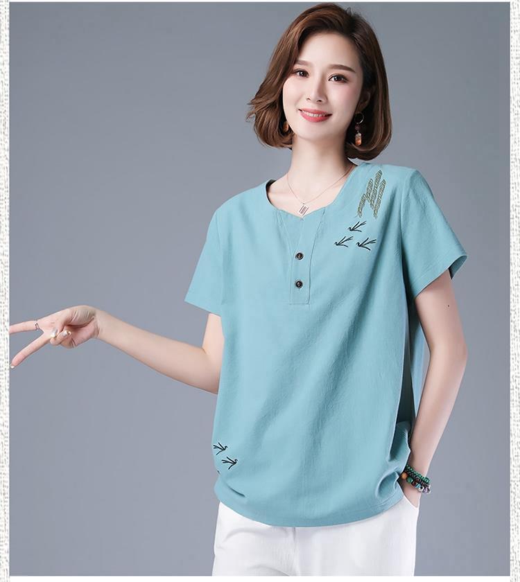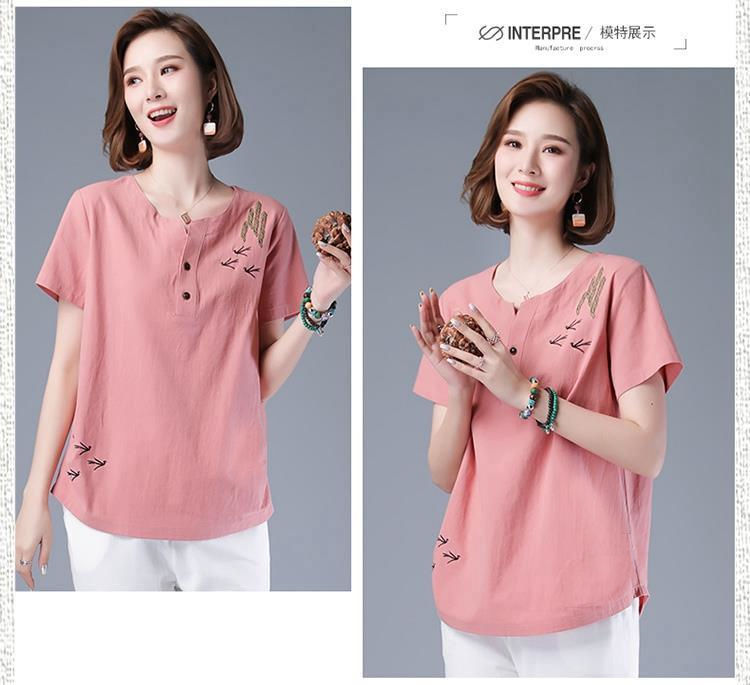 纯棉 文艺短袖T恤女宽松2022夏装新款印花大码中年妈妈装棉麻上衣