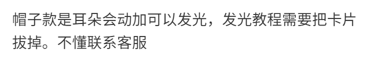 | the card in the hat shines only after being pulled out-contact customer service to send a tutorial(帽子里卡片拔掉才发光-联系客服发教程) | USD $2.77 | 999999 piece available |