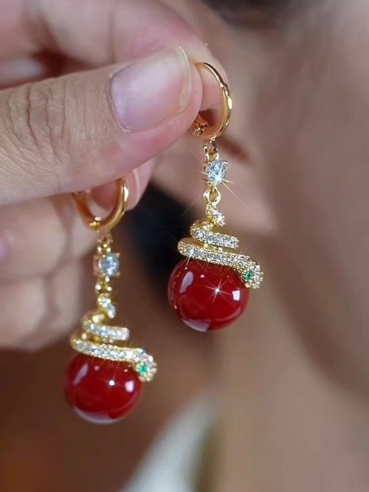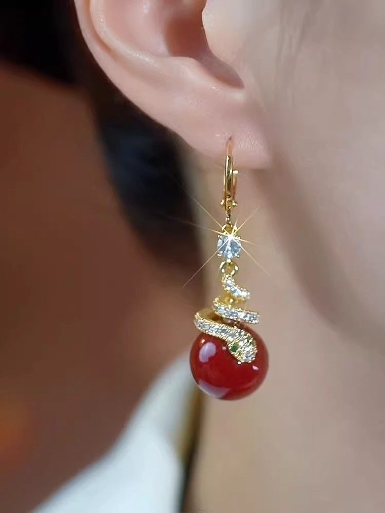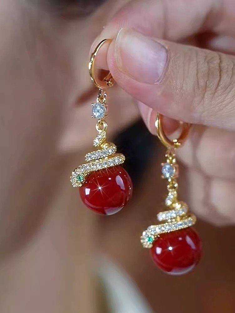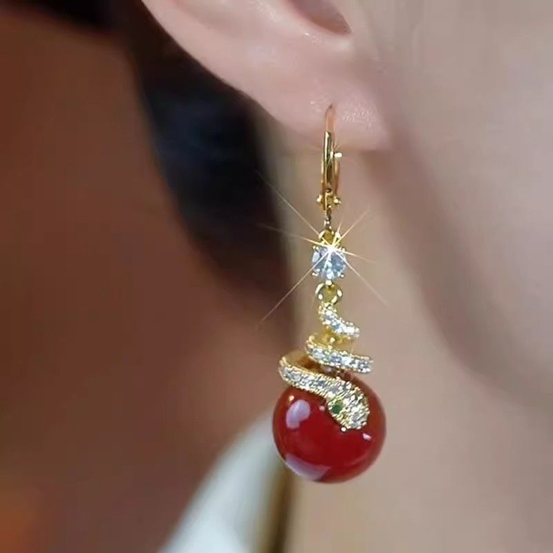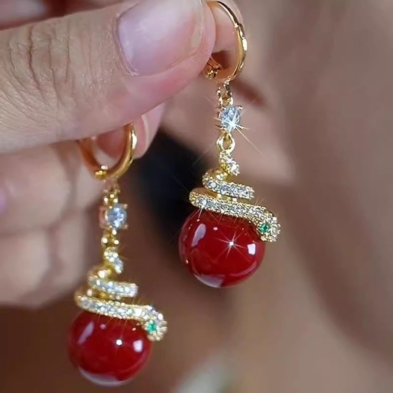 缠绕蛇形微镶红珠耳扣2025年新款本命年轻奢耳坠小众设计感耳饰女