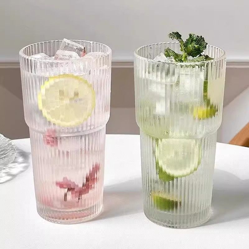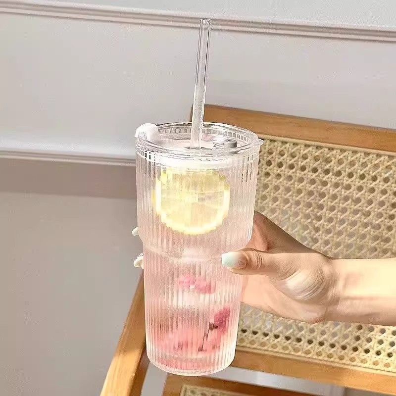 情侣对杯高颜值冷饮果汁咖啡杯带盖吸管大容量条纹玻璃杯水杯ins