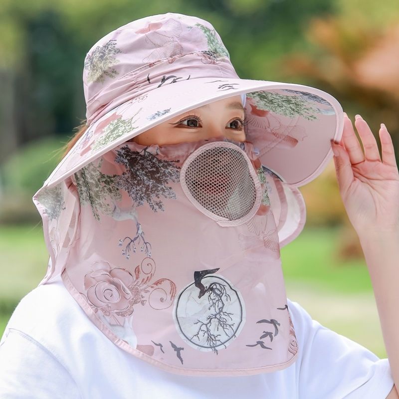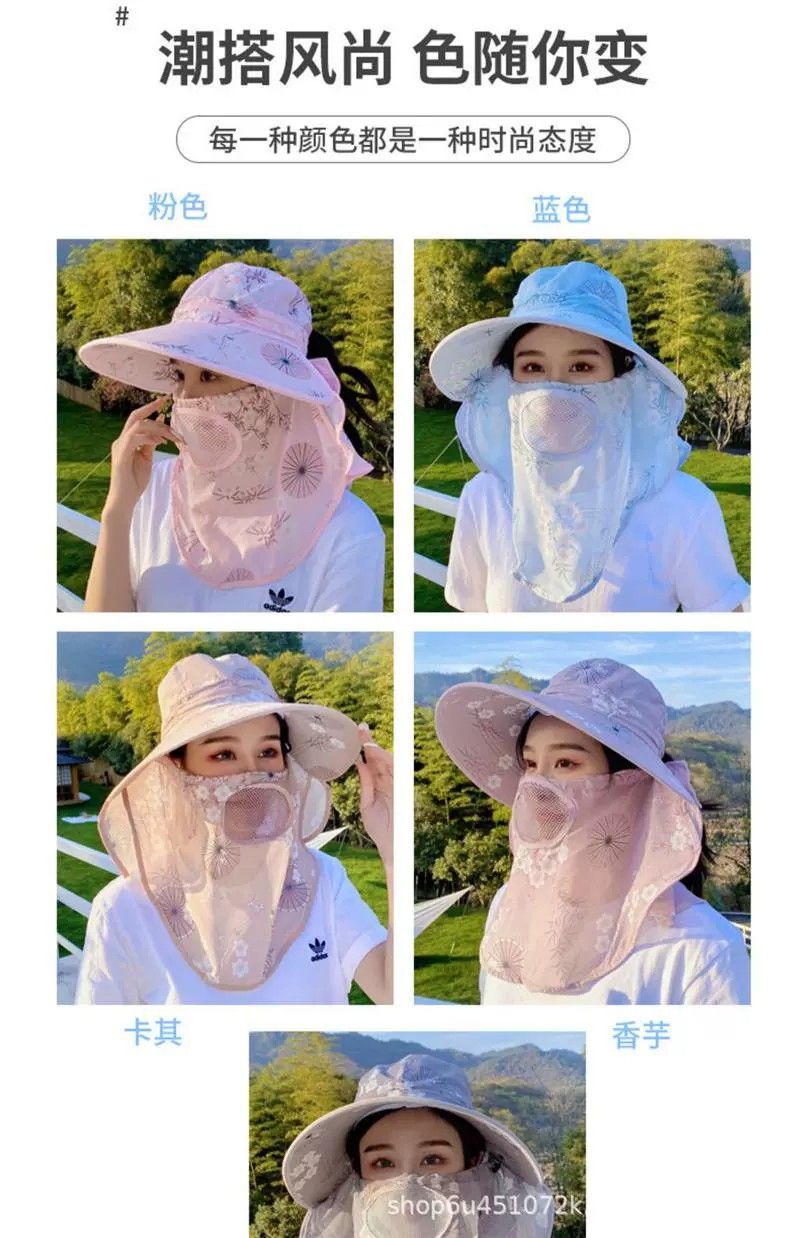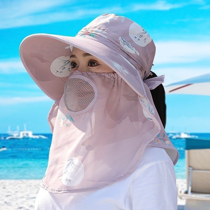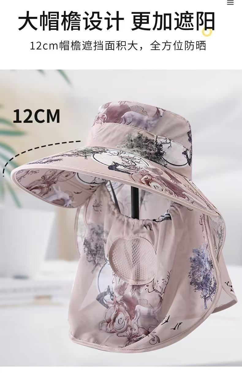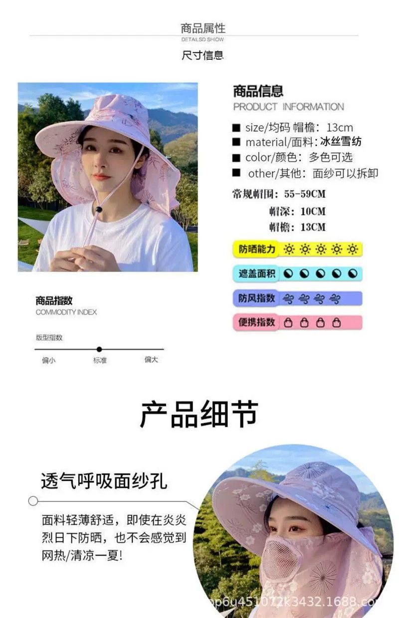 夏季面罩冰丝凉感防晒帽子遮脸太阳帽防紫外线百搭采茶防晒遮阳帽