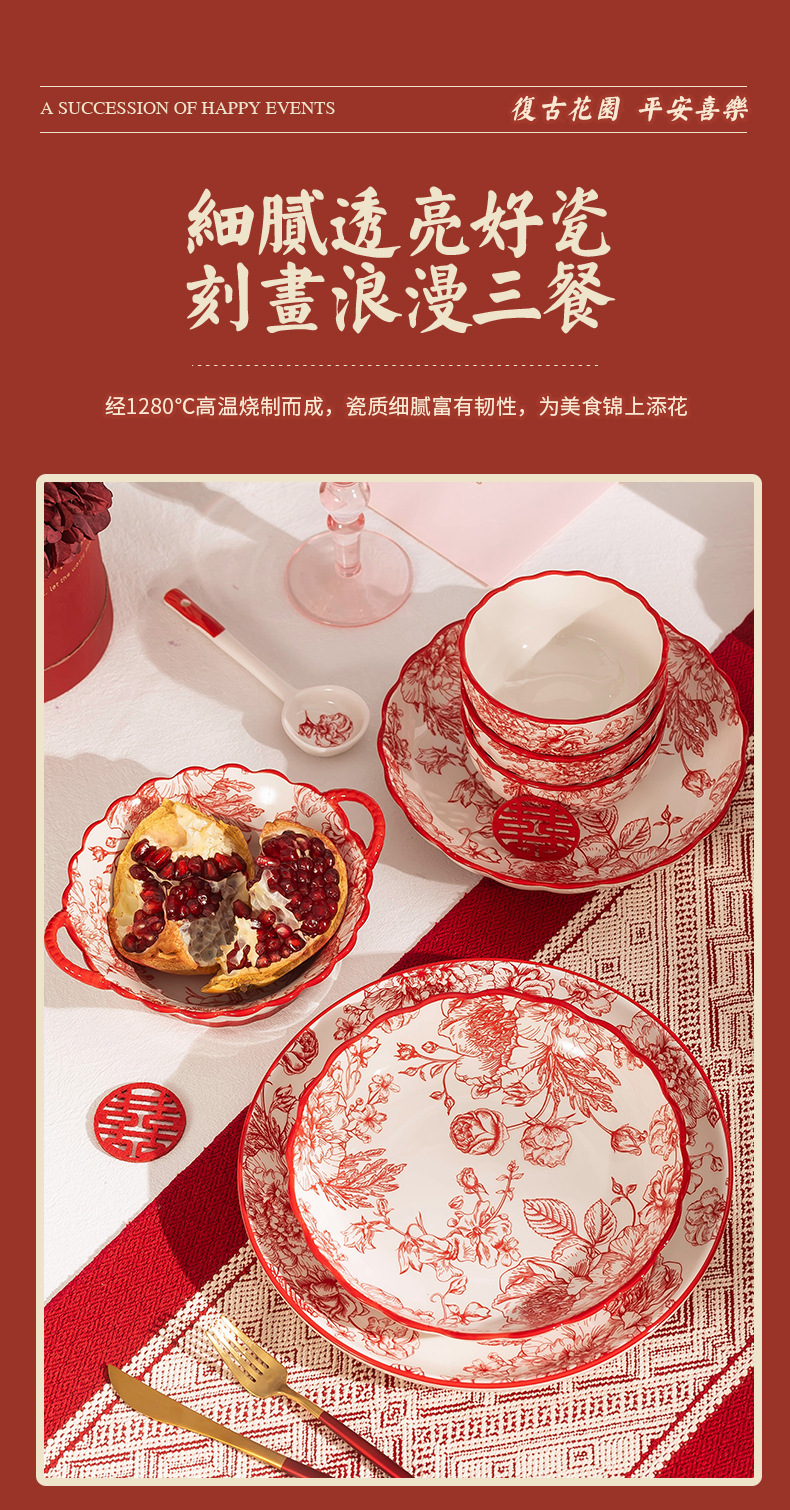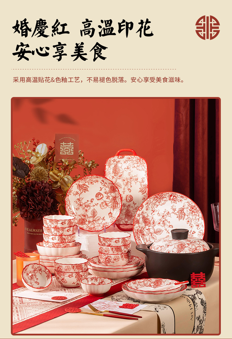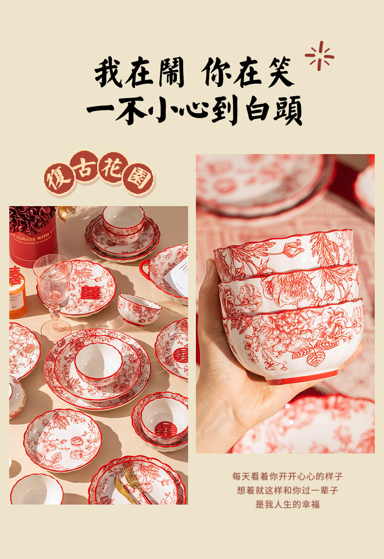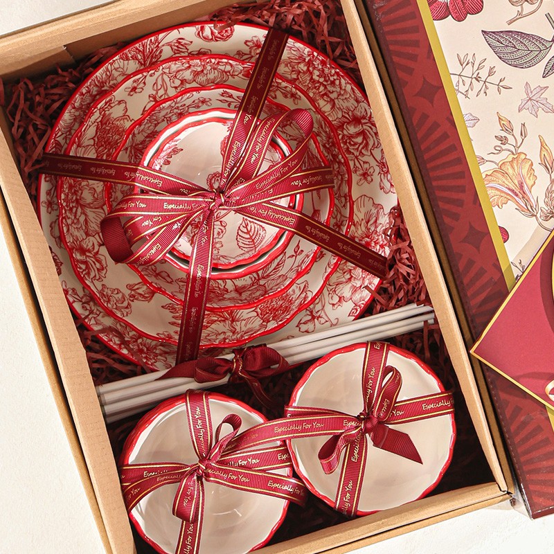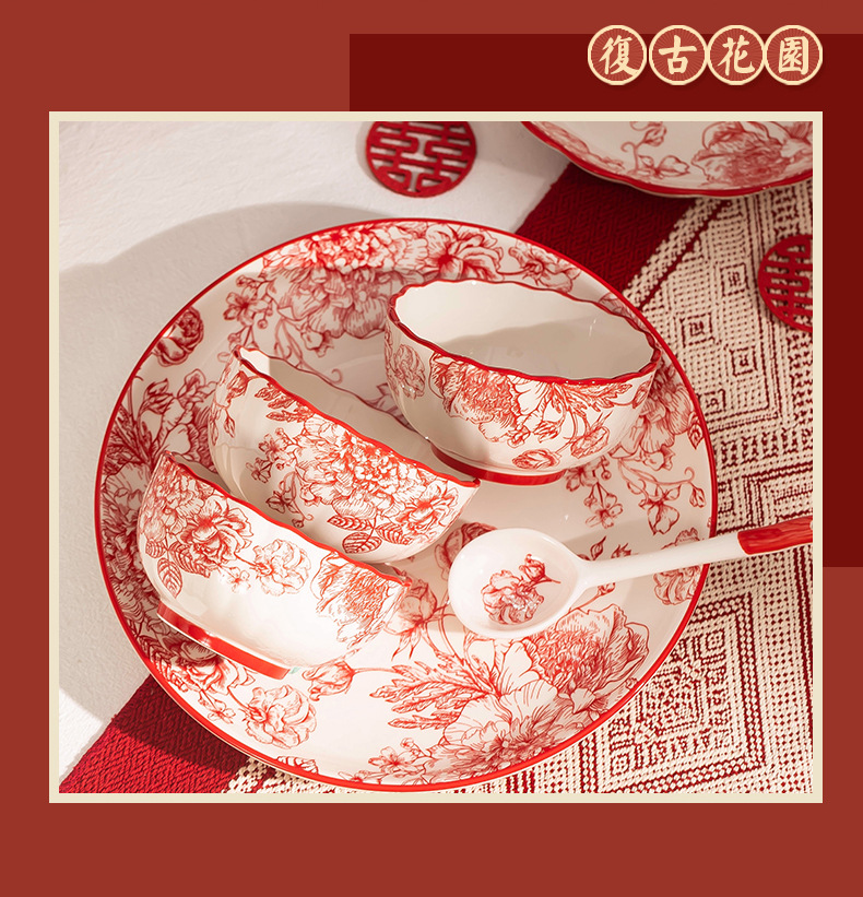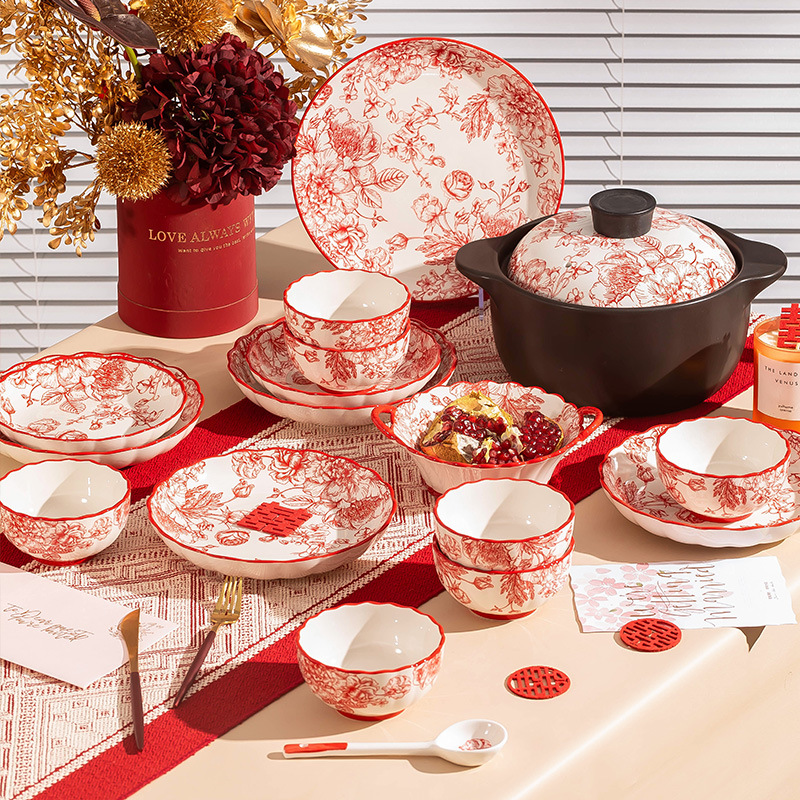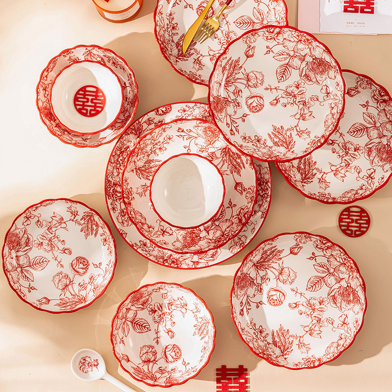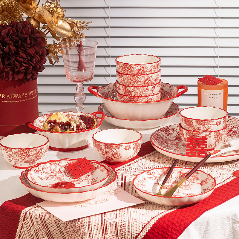 釉下彩结婚用陶瓷餐具碗碟盘套装新婚礼品红色喜庆花卉礼盒送人