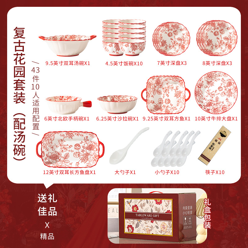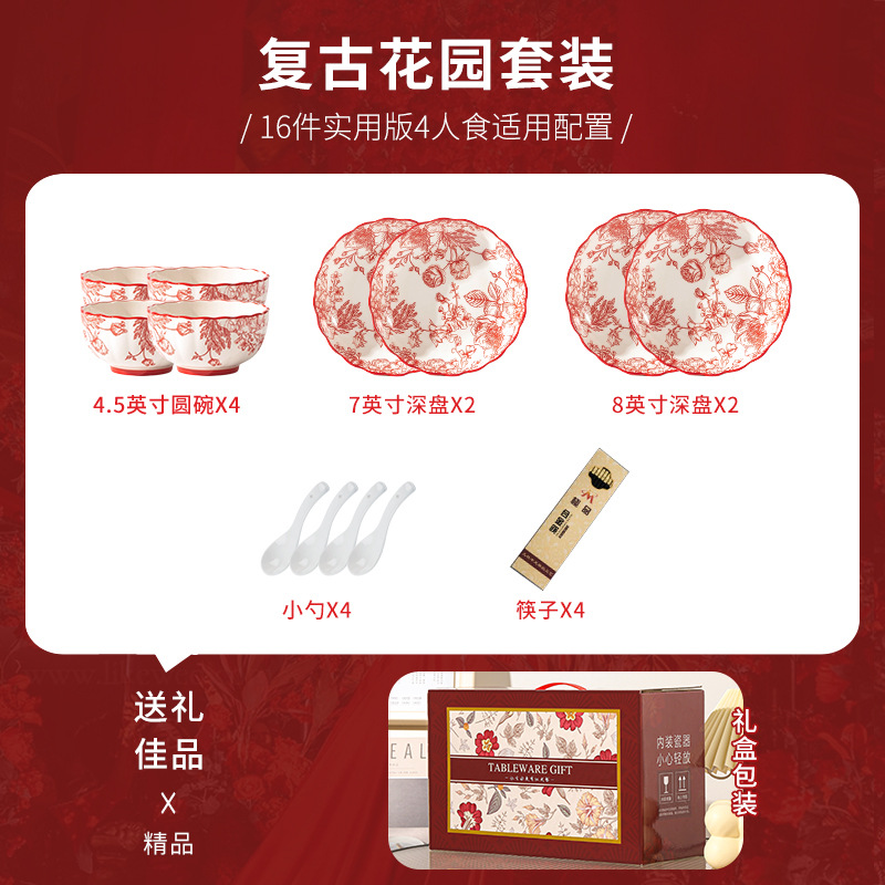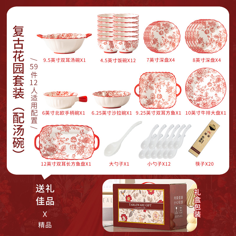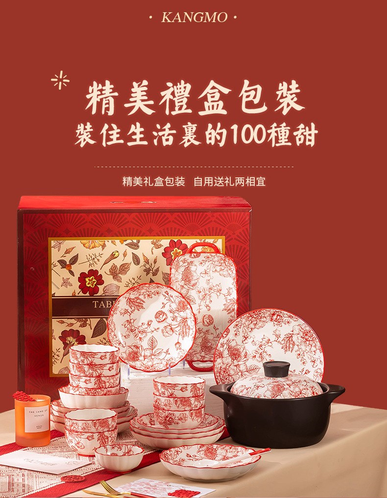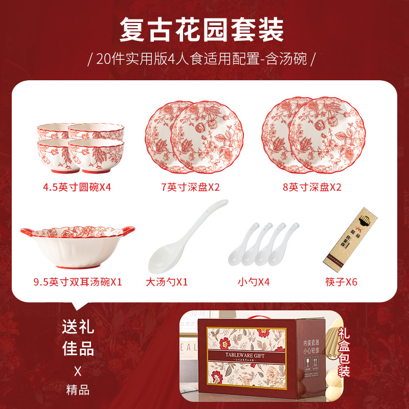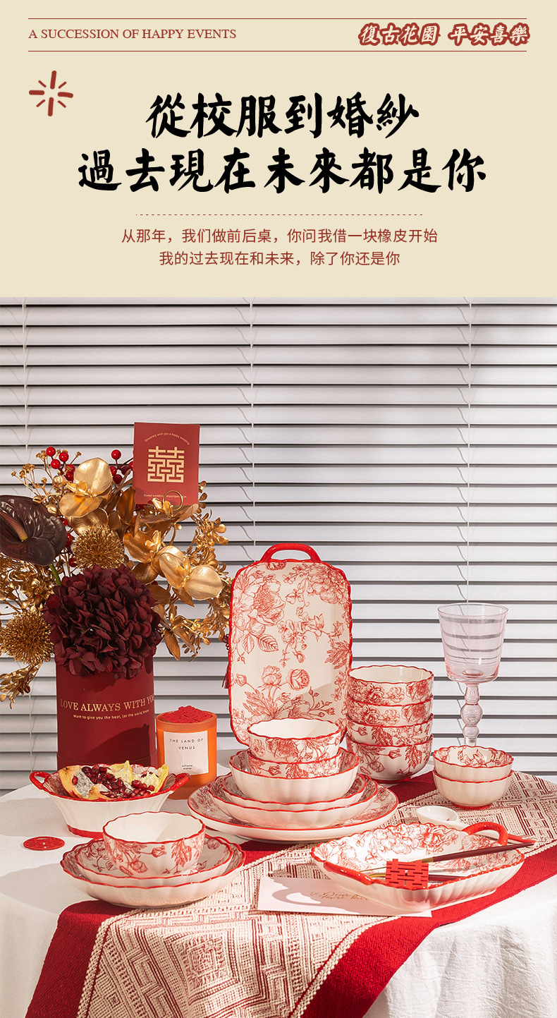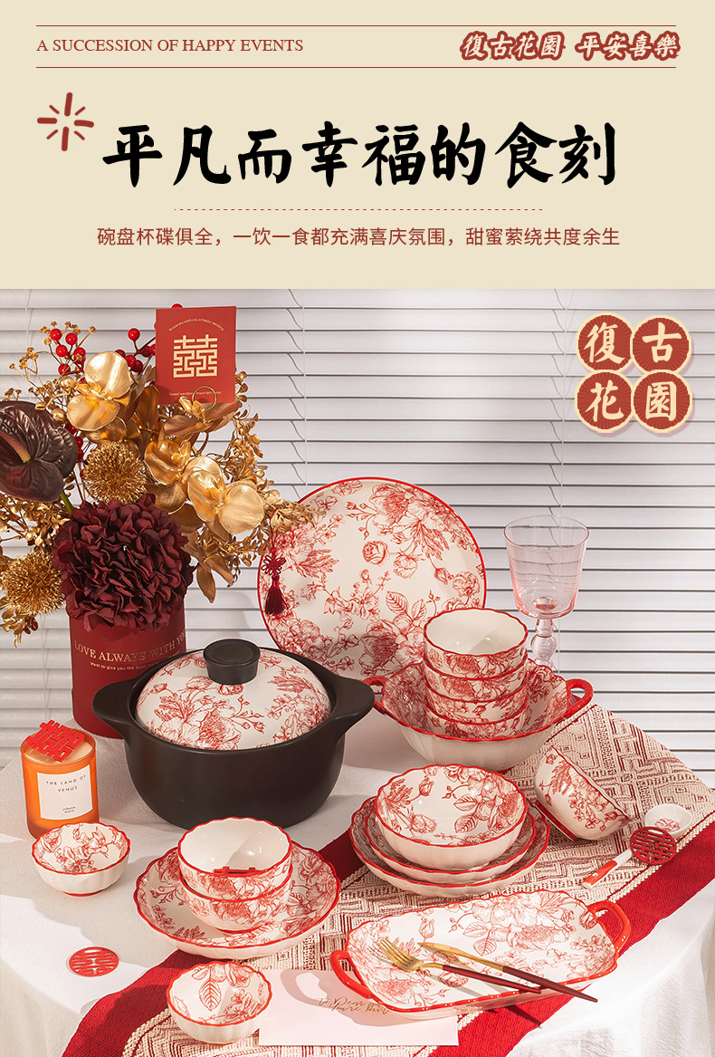釉下彩结婚用陶瓷餐具碗碟盘套装新婚礼品红色喜庆花卉礼盒送人