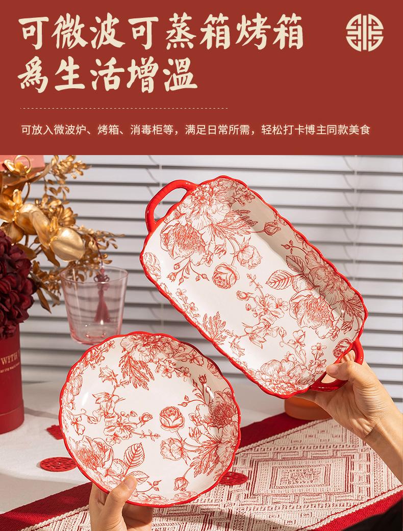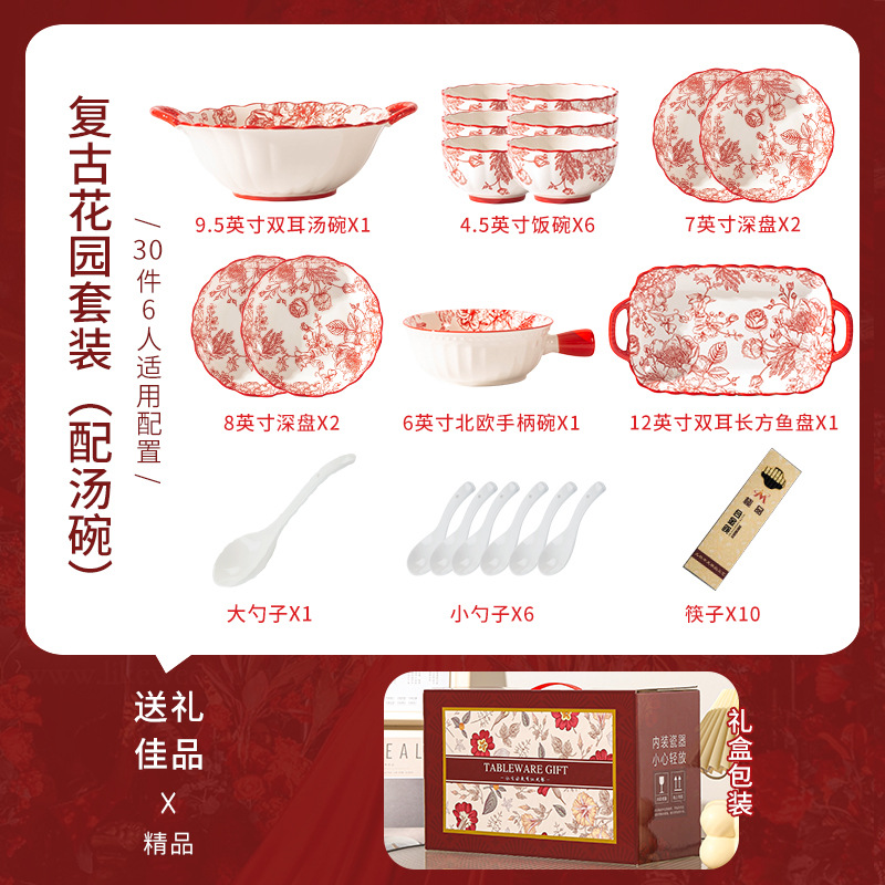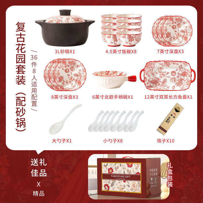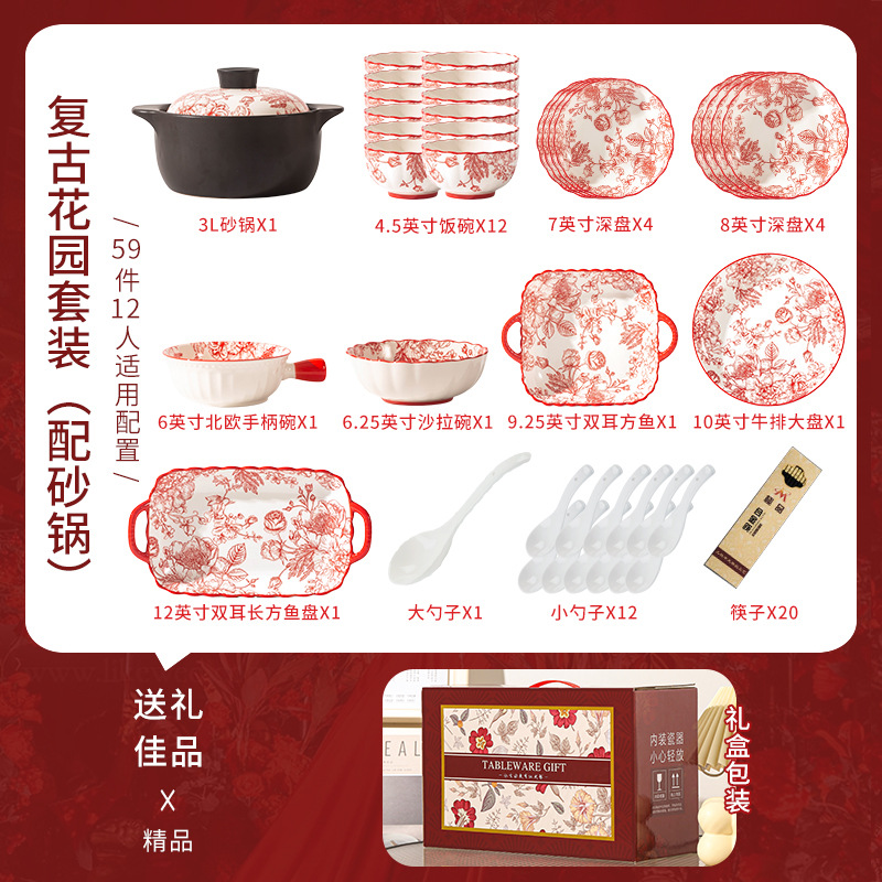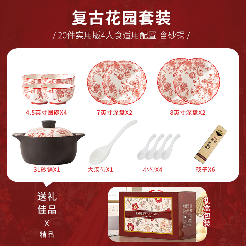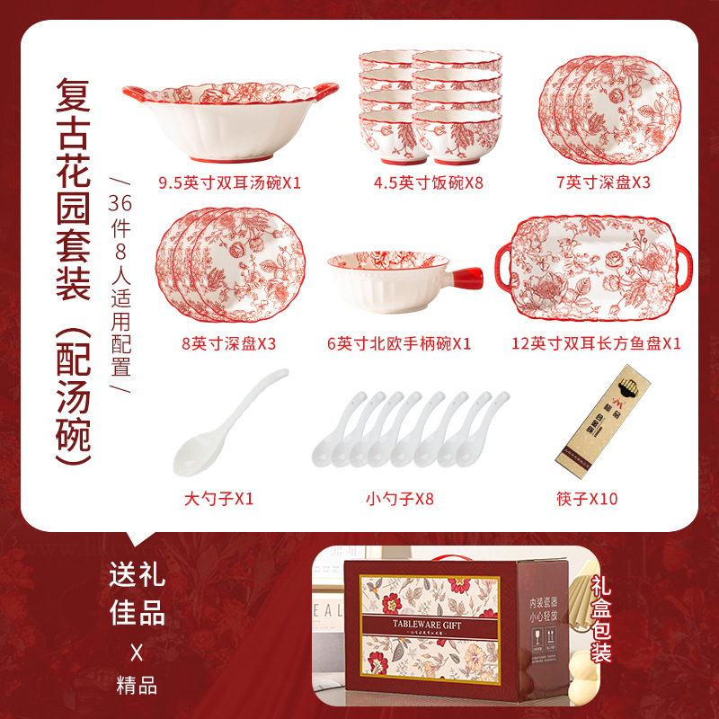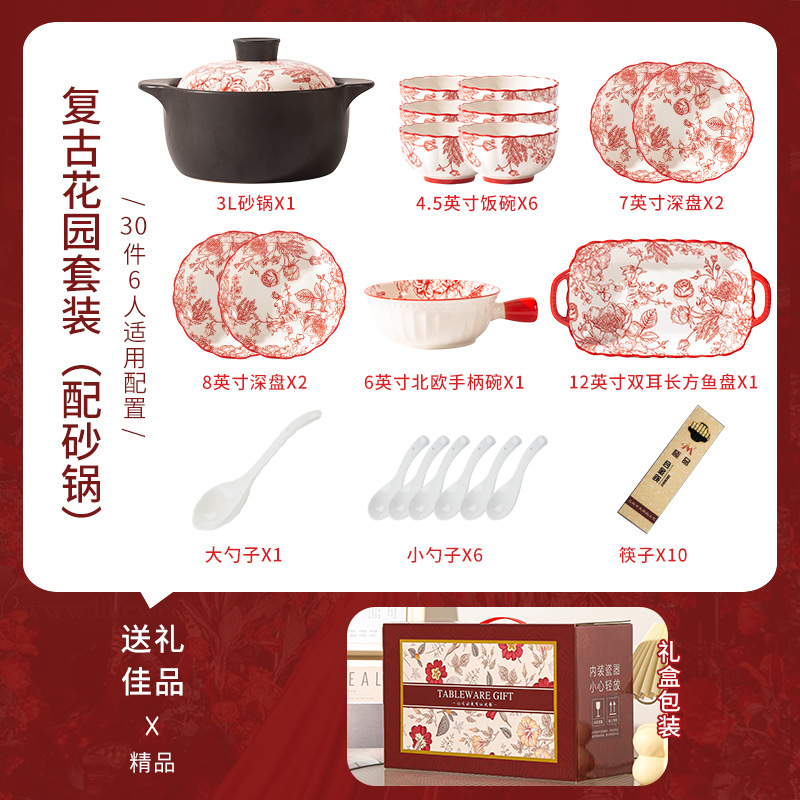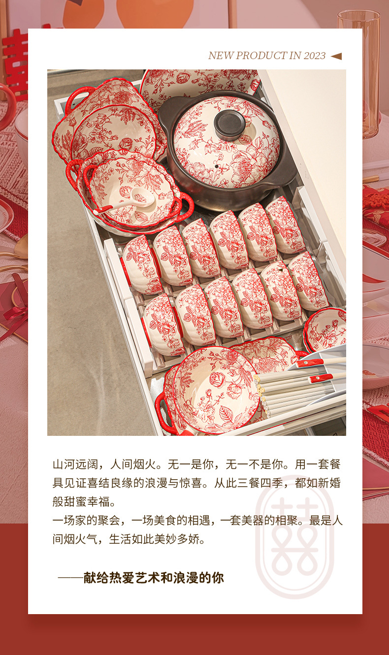 釉下彩结婚用陶瓷餐具碗碟盘套装新婚礼品红色喜庆花卉礼盒送人