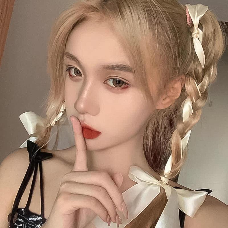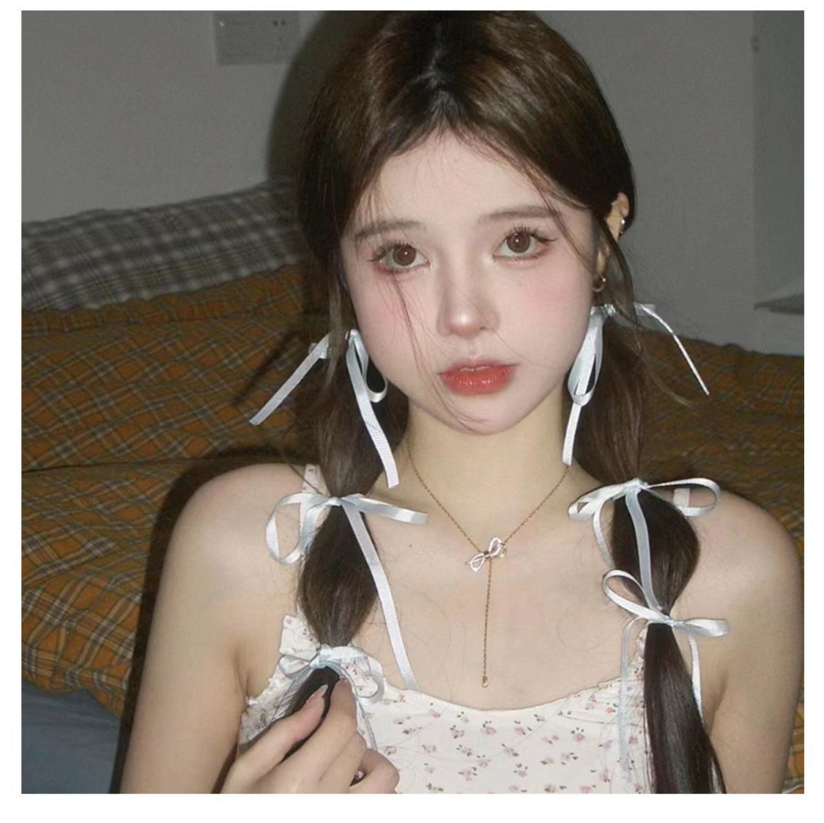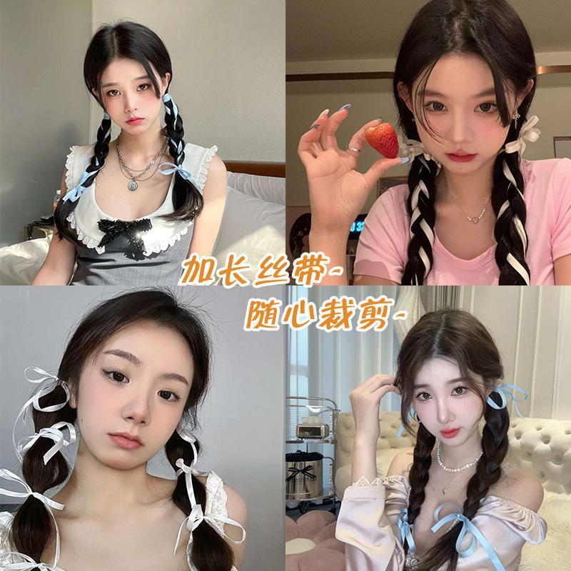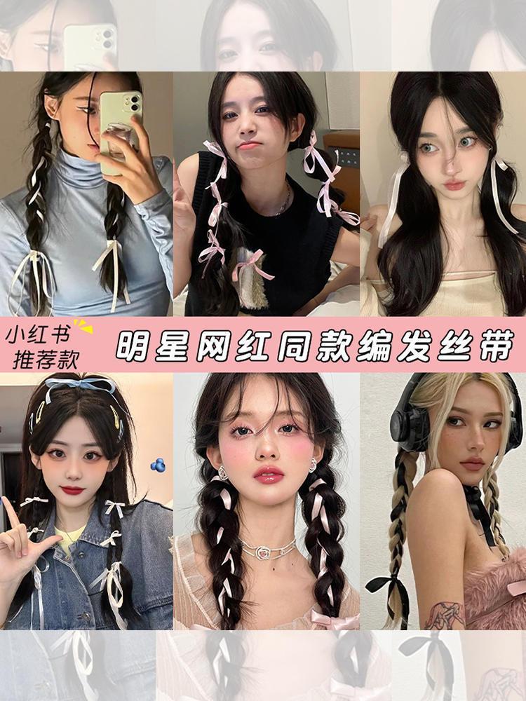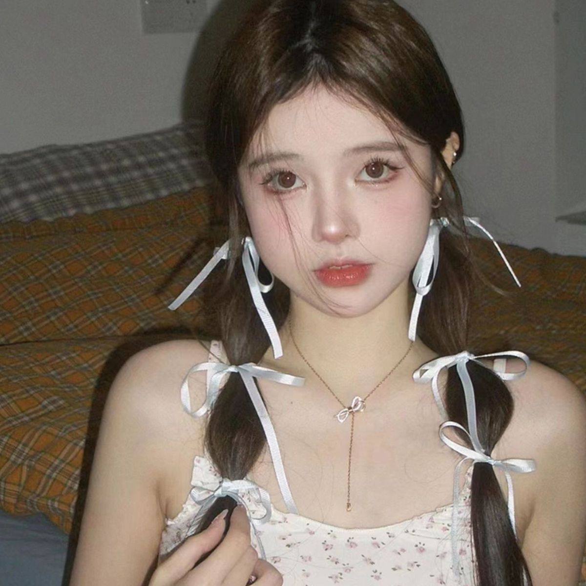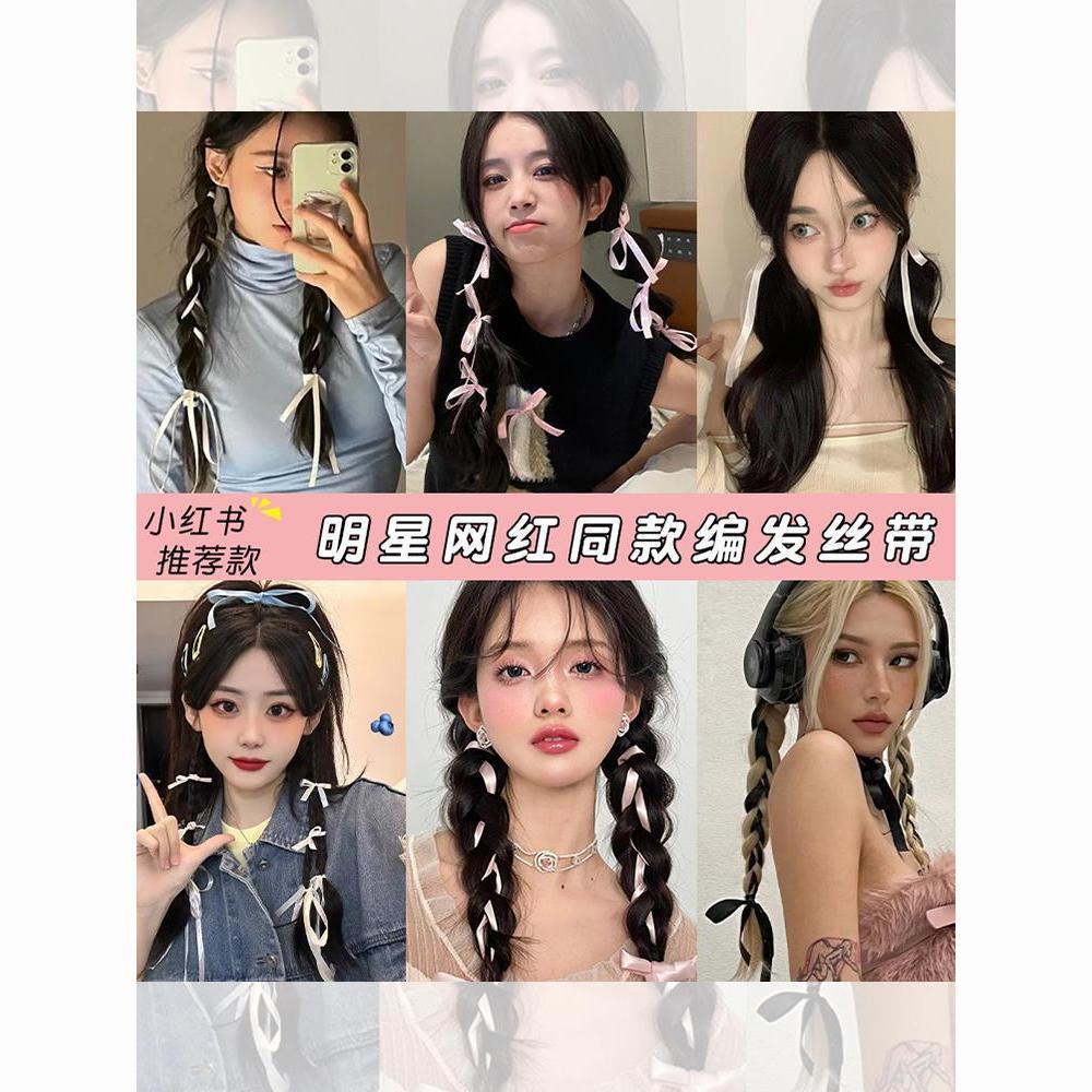 粉色少女双马尾绑头发丝带头饰白色绑带扎头绳蝴蝶结飘带编发发绳