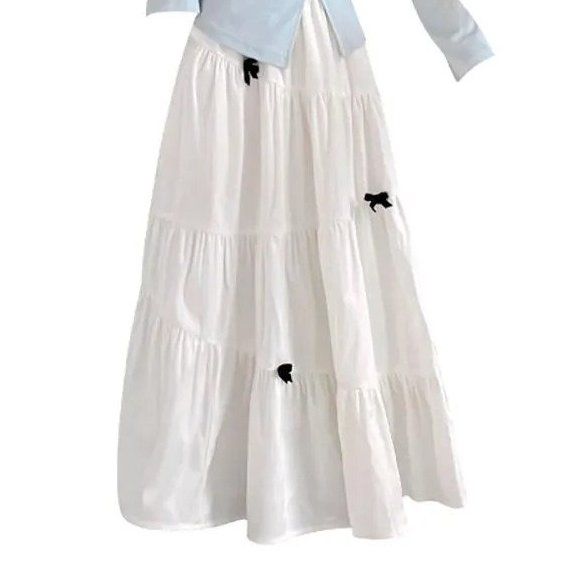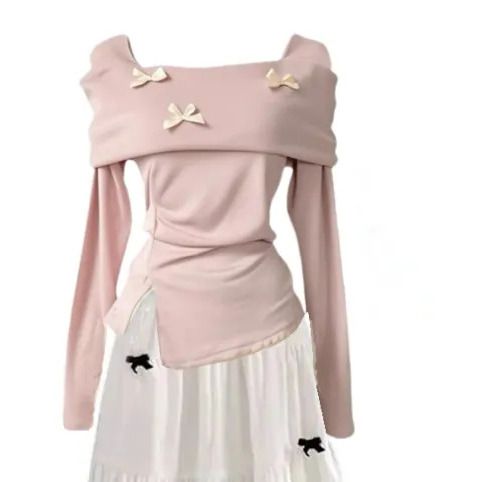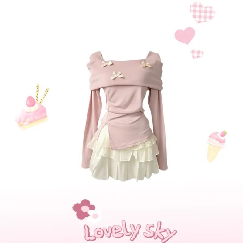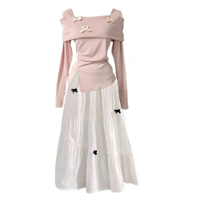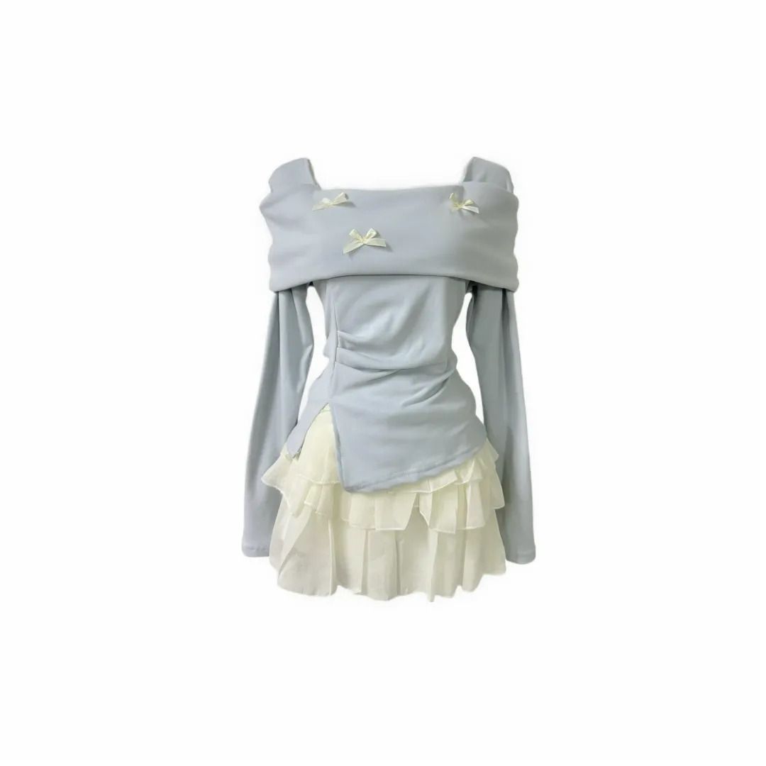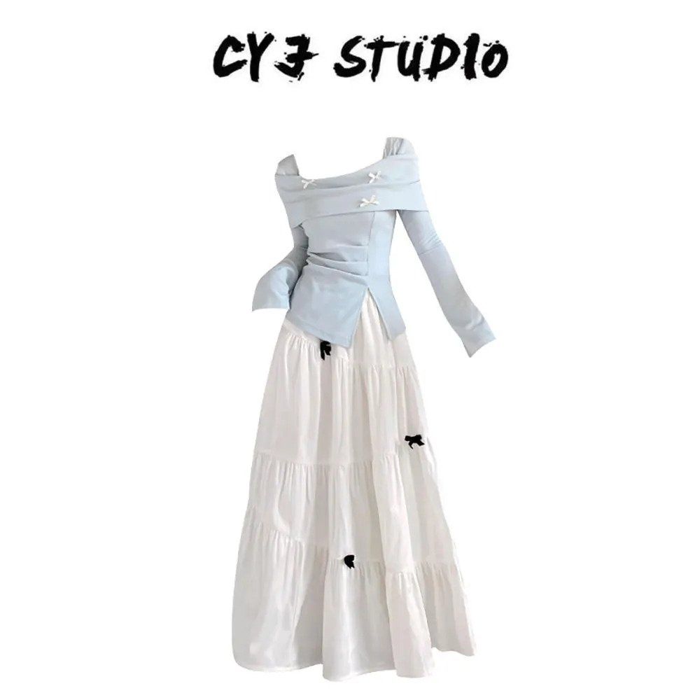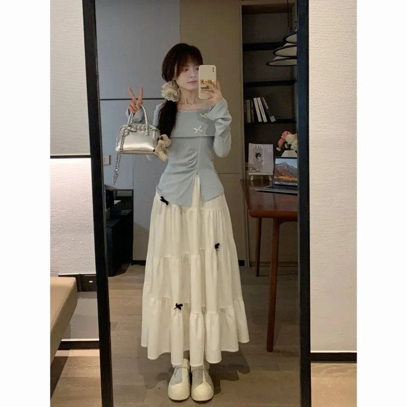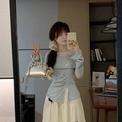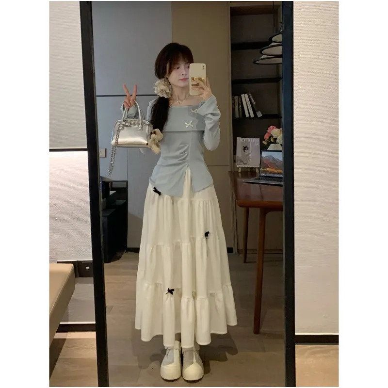 法式温柔风蝴蝶结设计感秋季蓝色开叉长袖上衣高腰修身半身裙套装