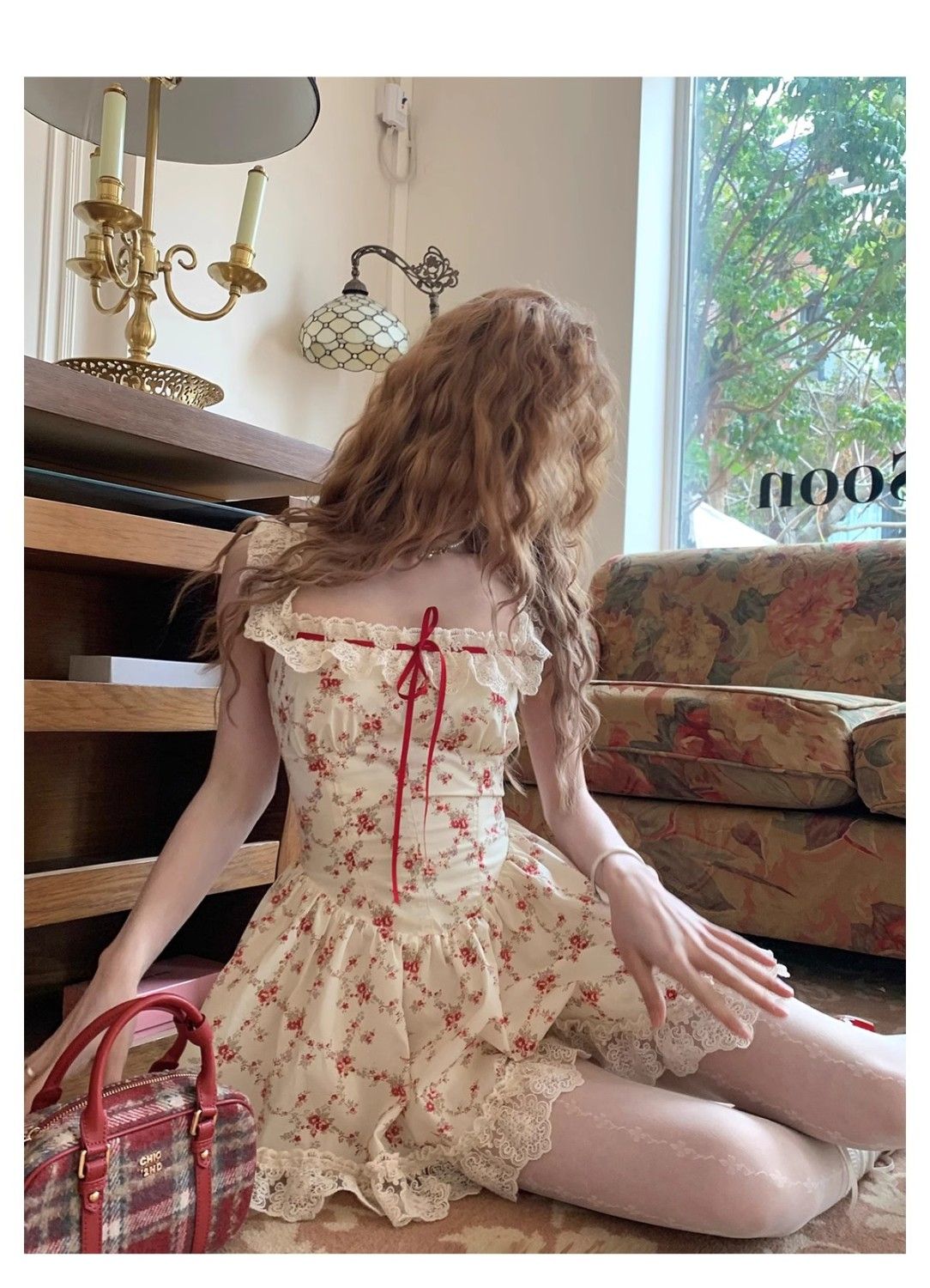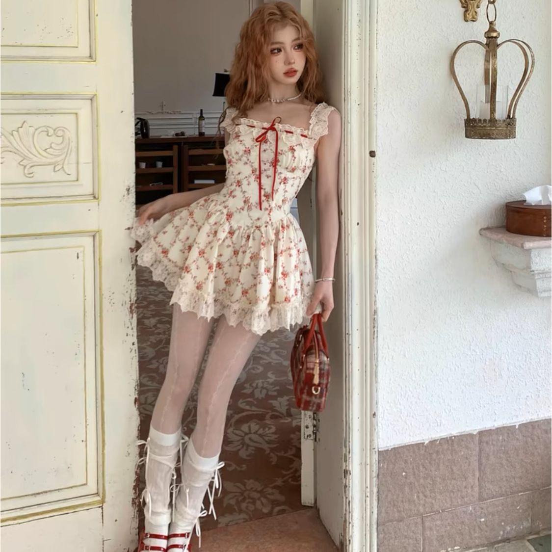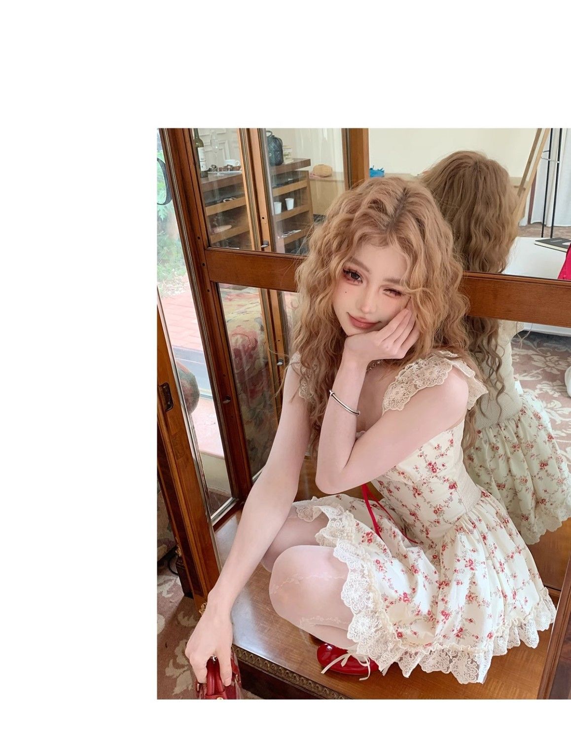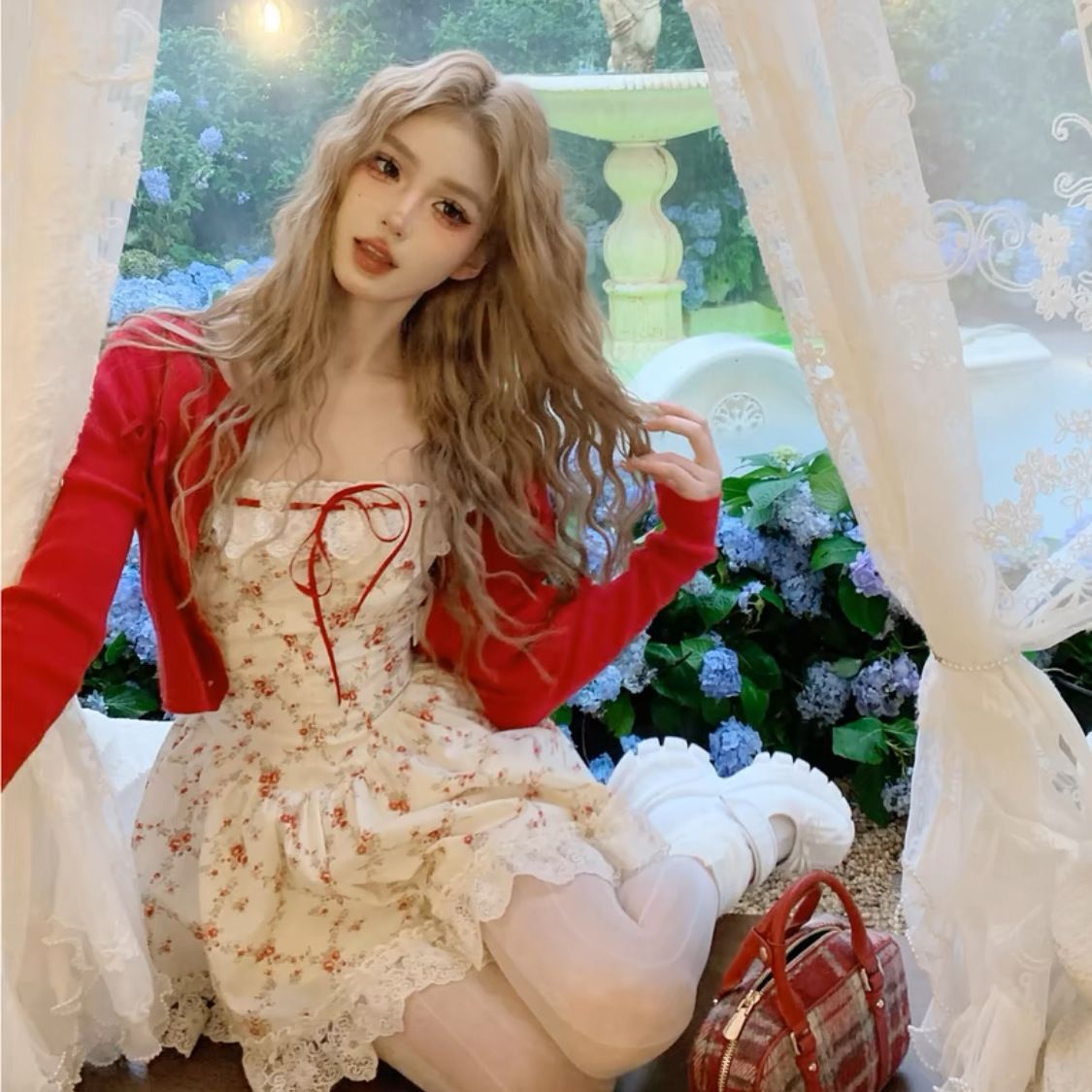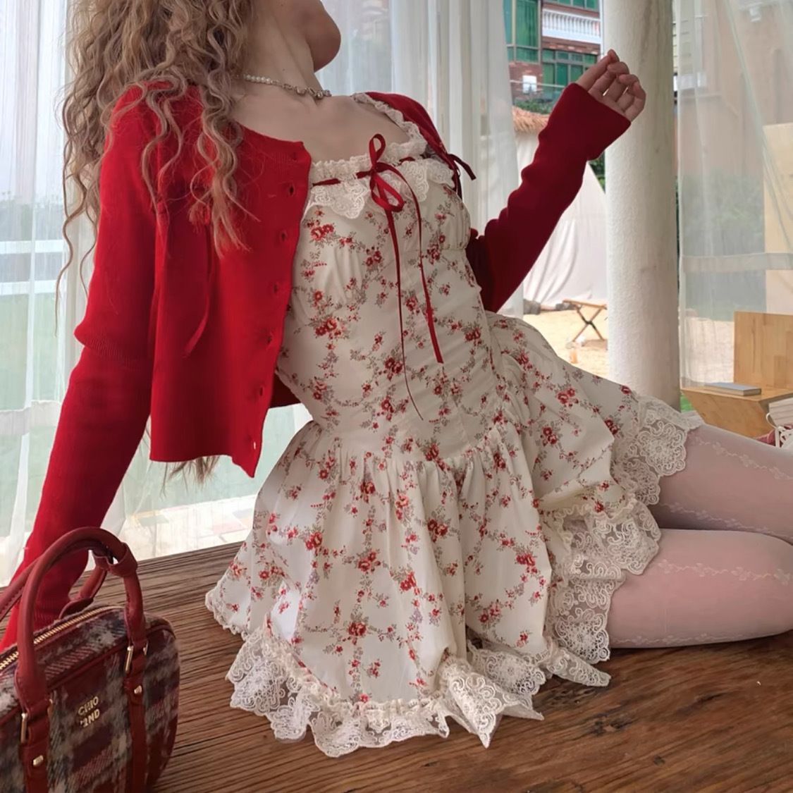 富养玫瑰 杏色田园风小碎花法式蕾丝吊带连衣裙春夏小外套