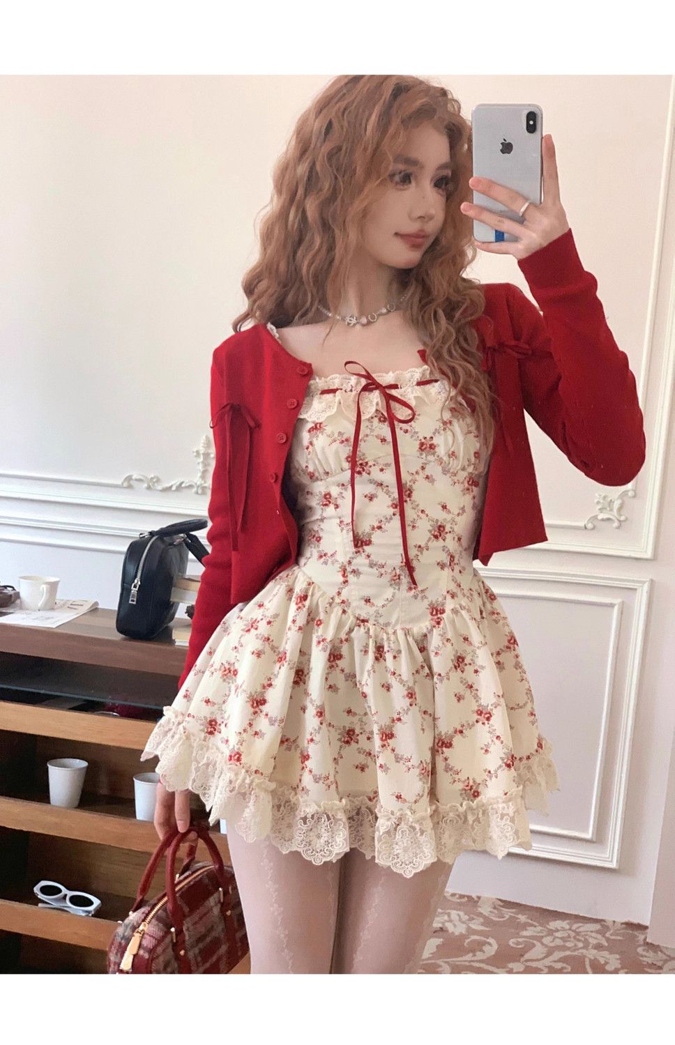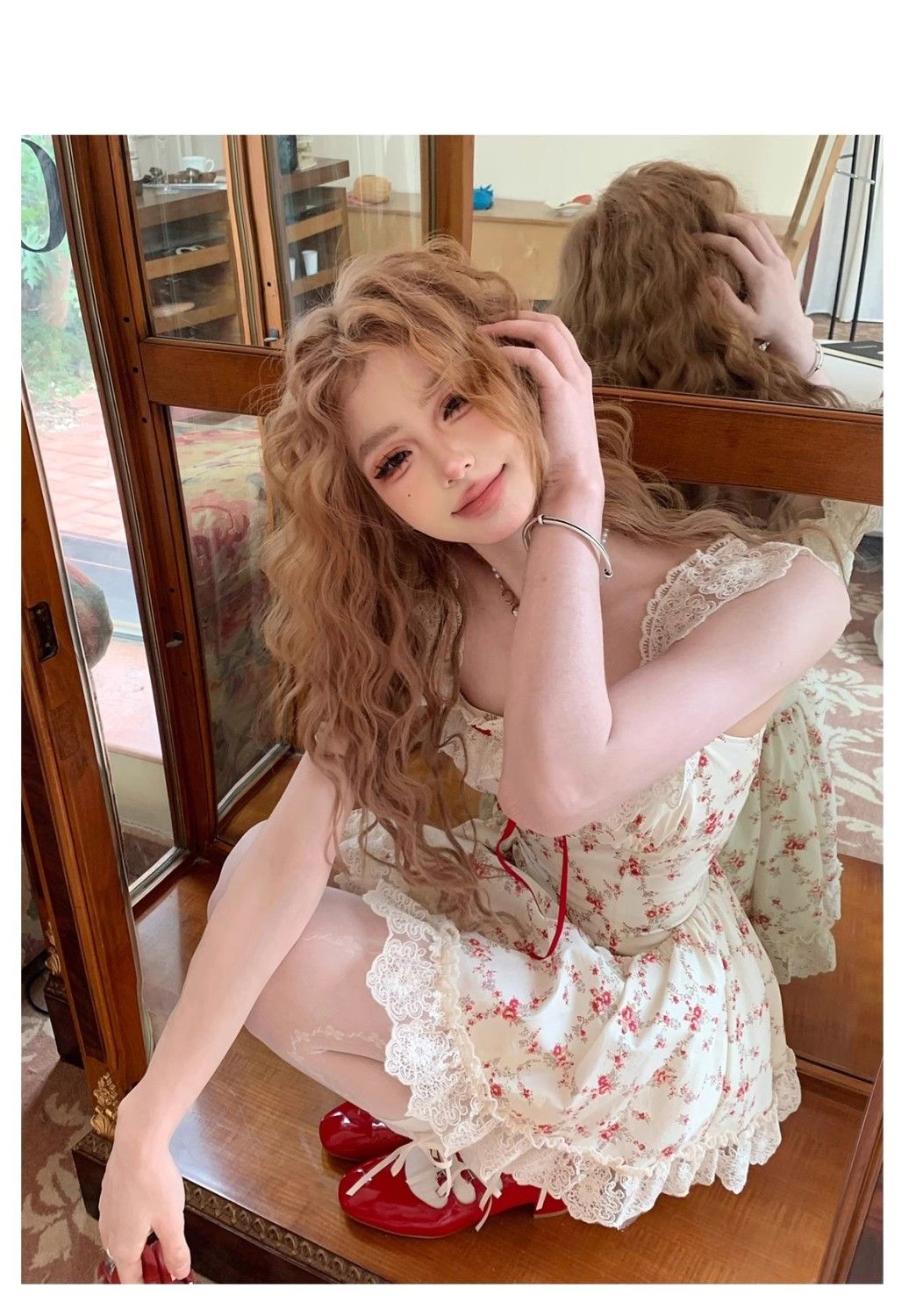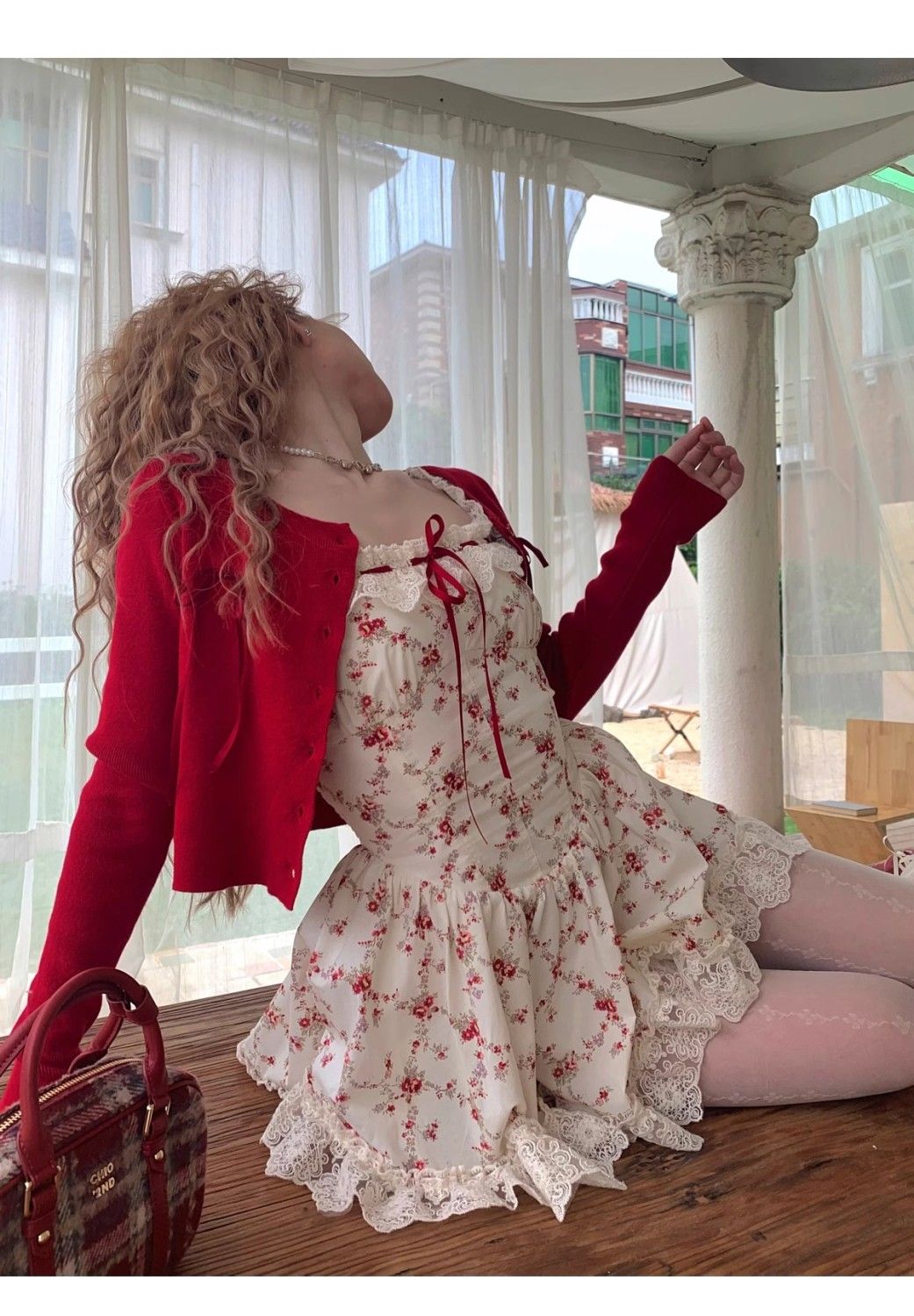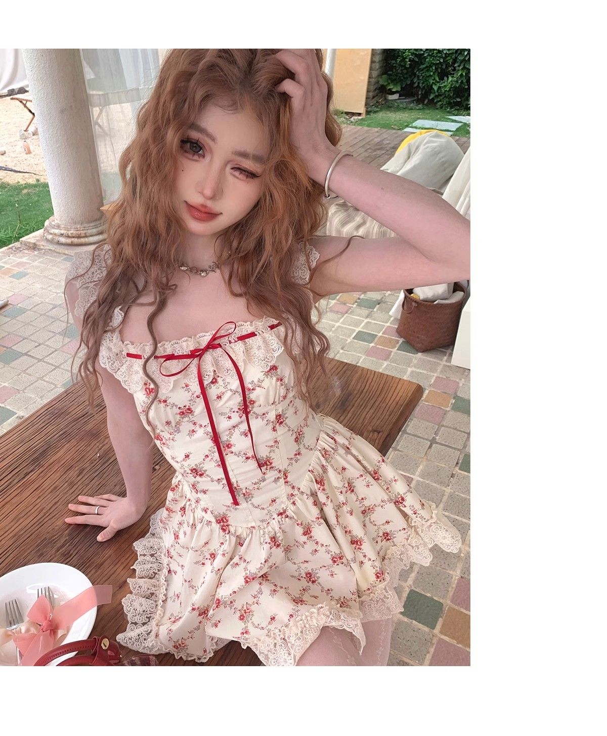 富养玫瑰 杏色田园风小碎花法式蕾丝吊带连衣裙春夏小外套
