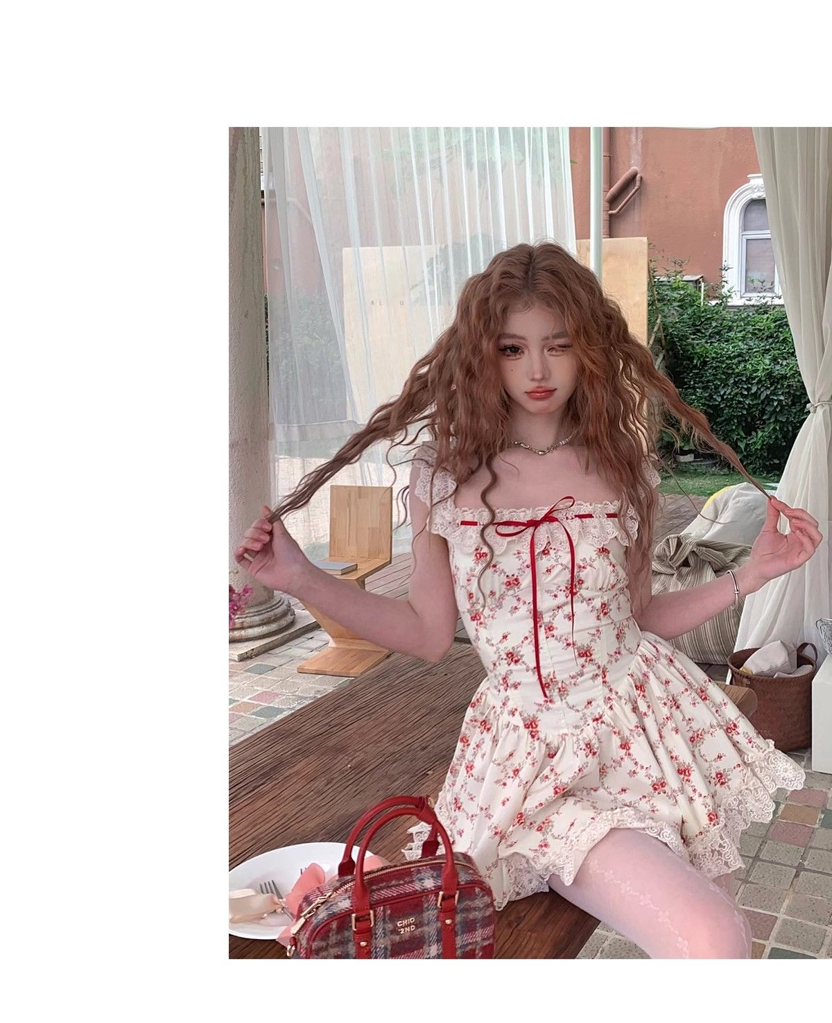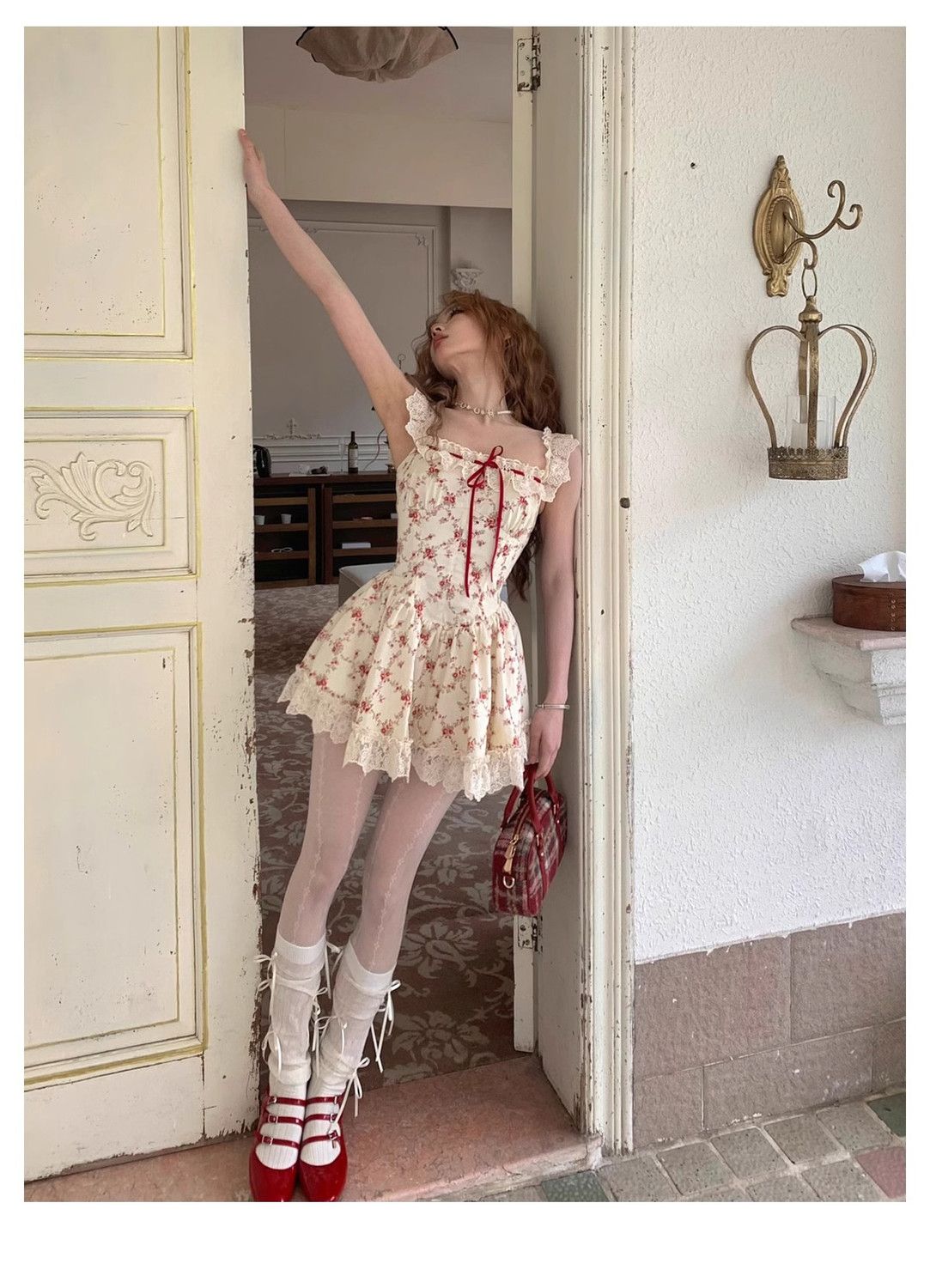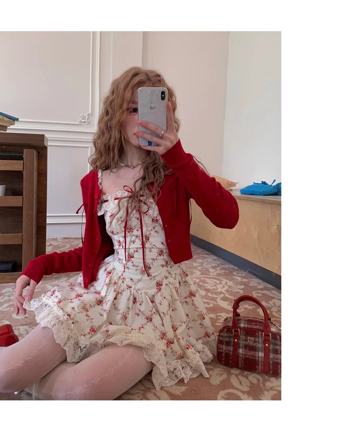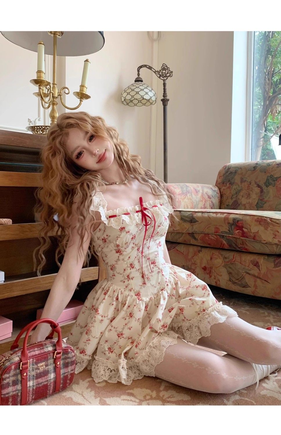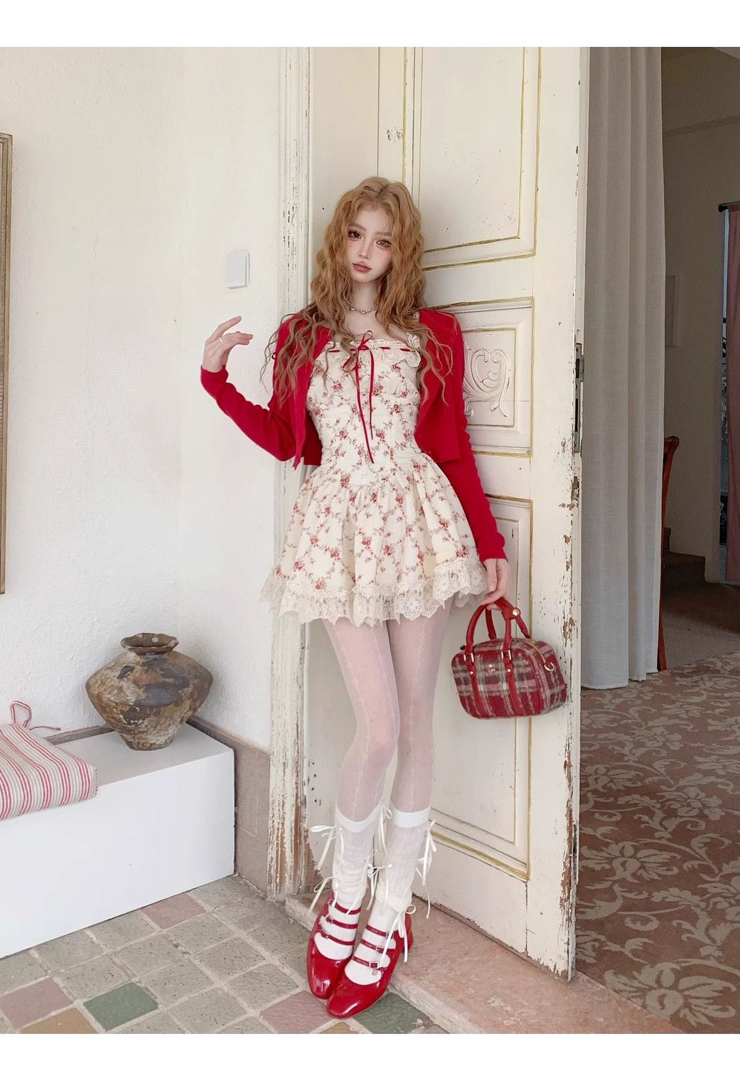 富养玫瑰 杏色田园风小碎花法式蕾丝吊带连衣裙春夏小外套