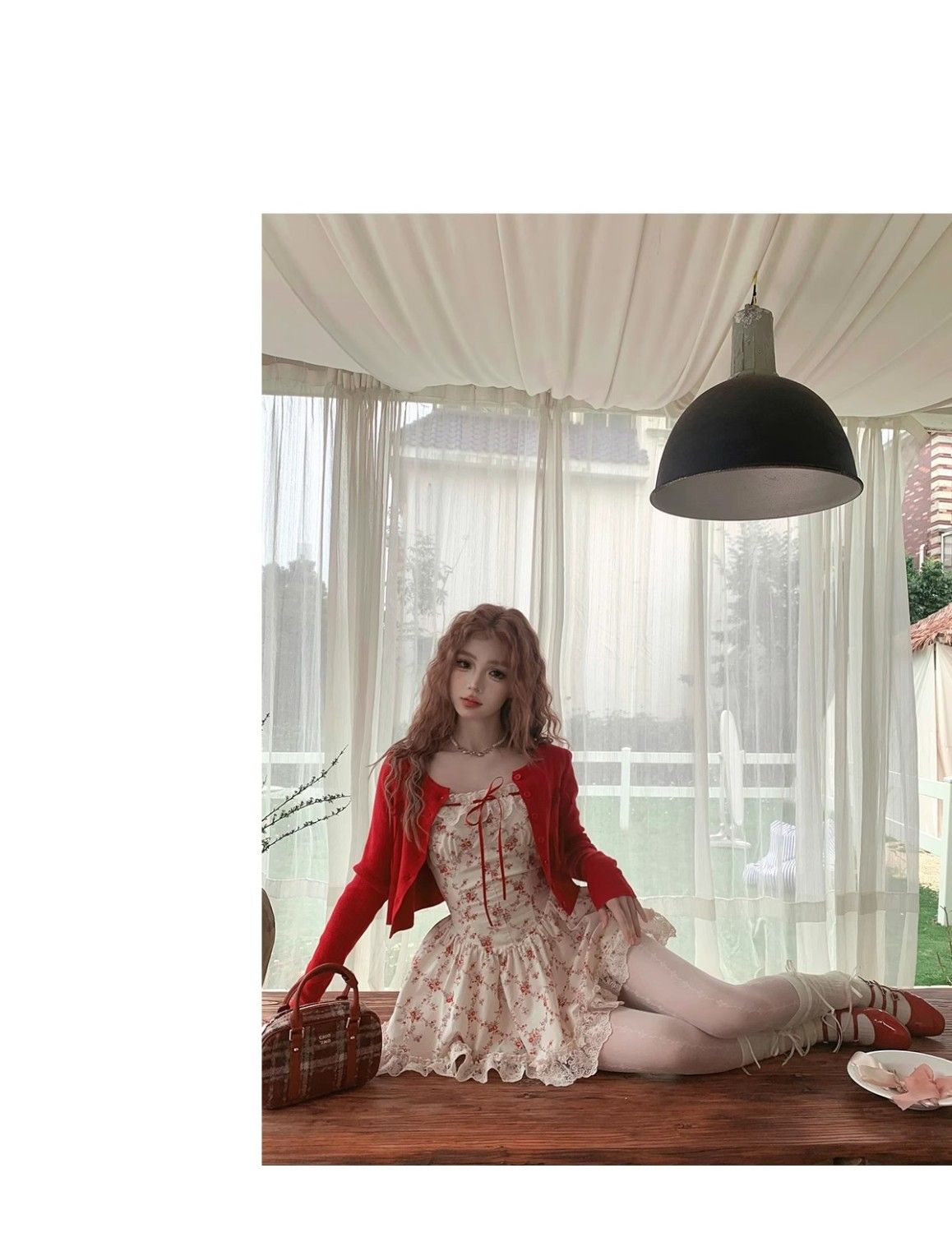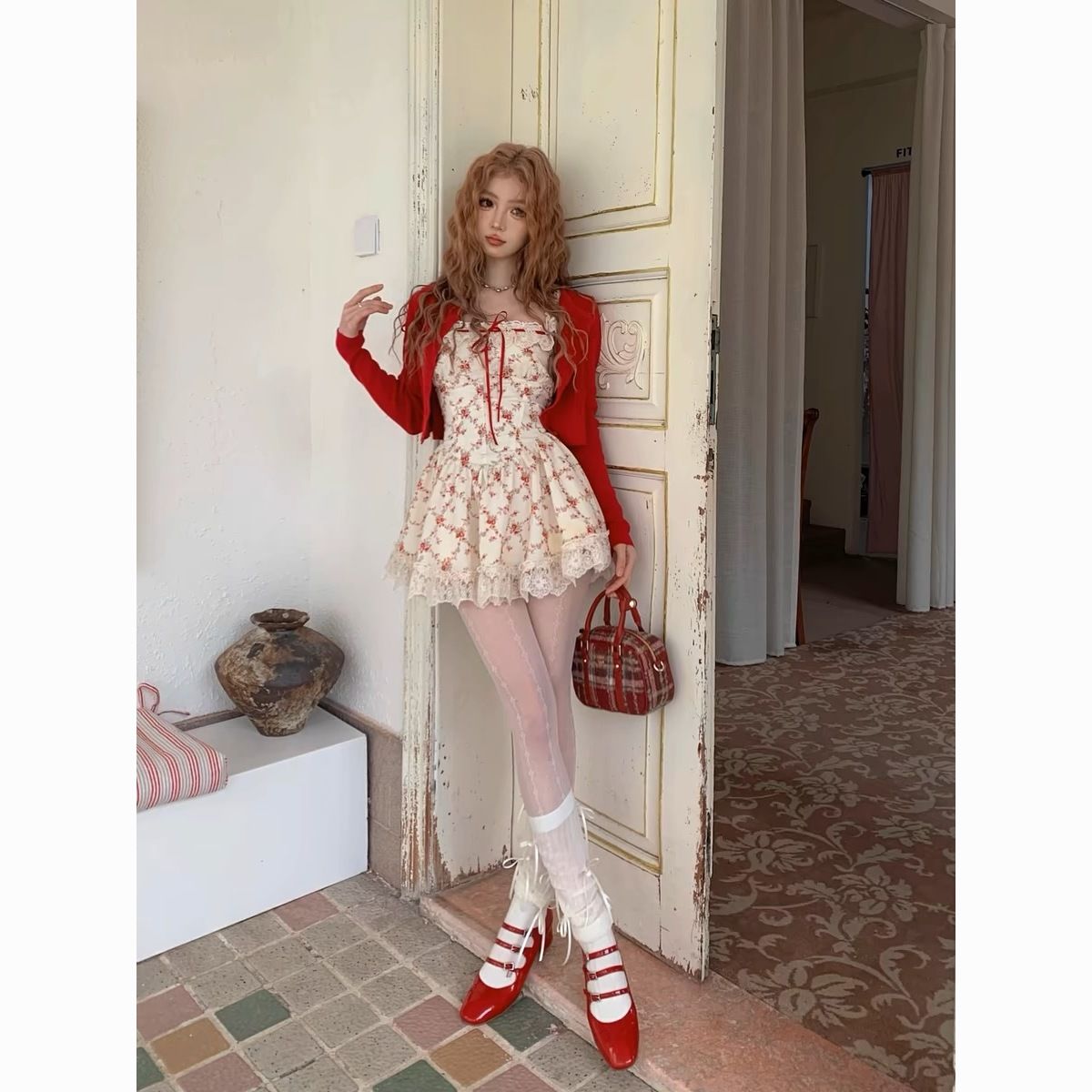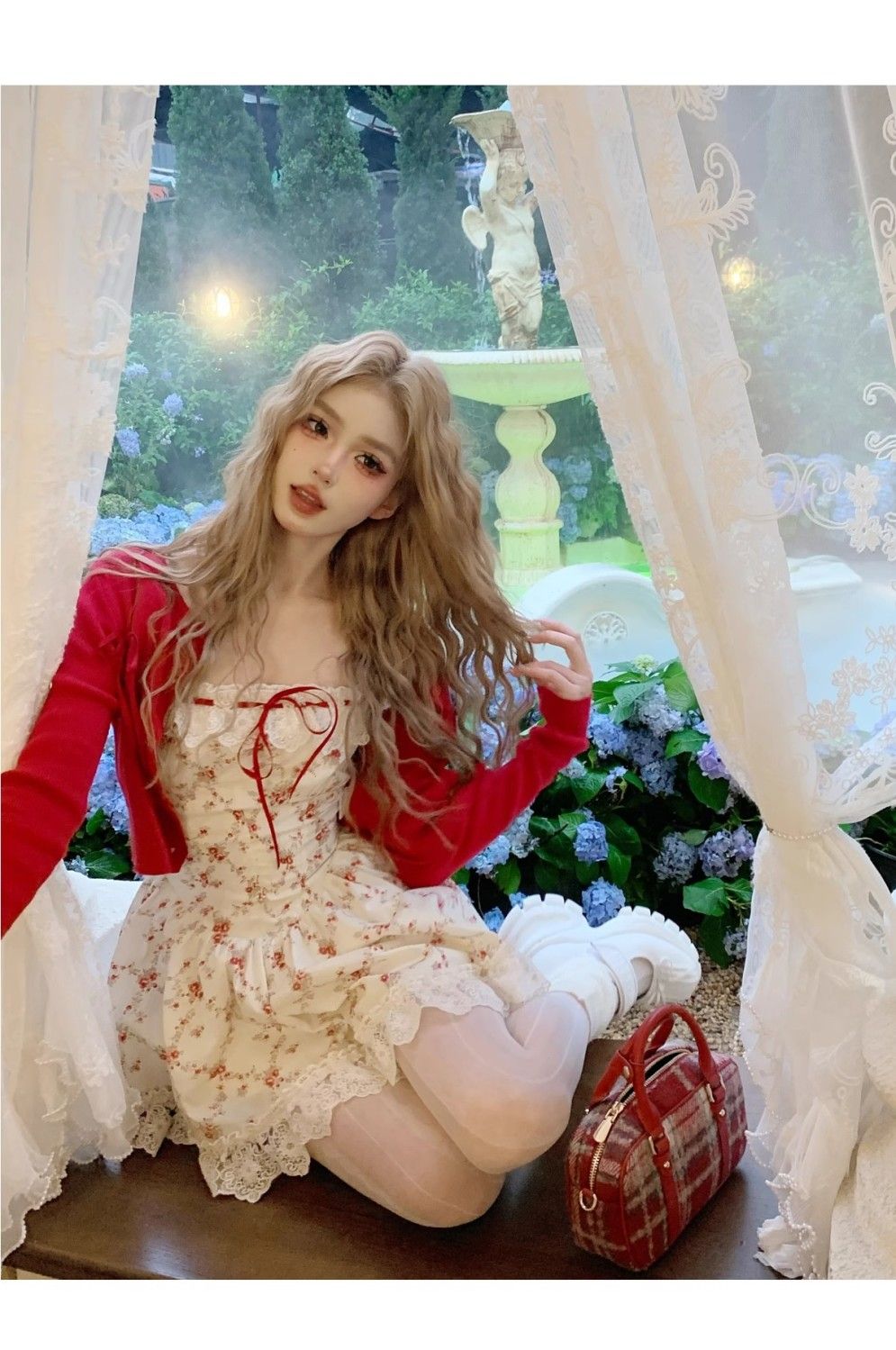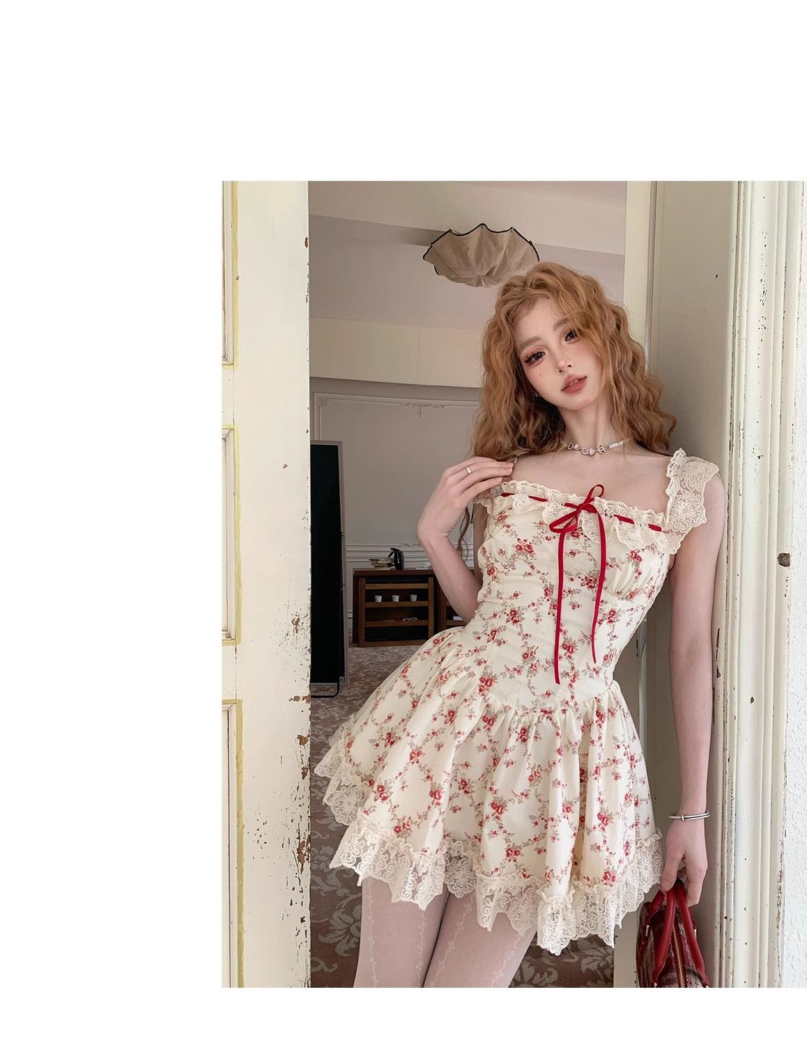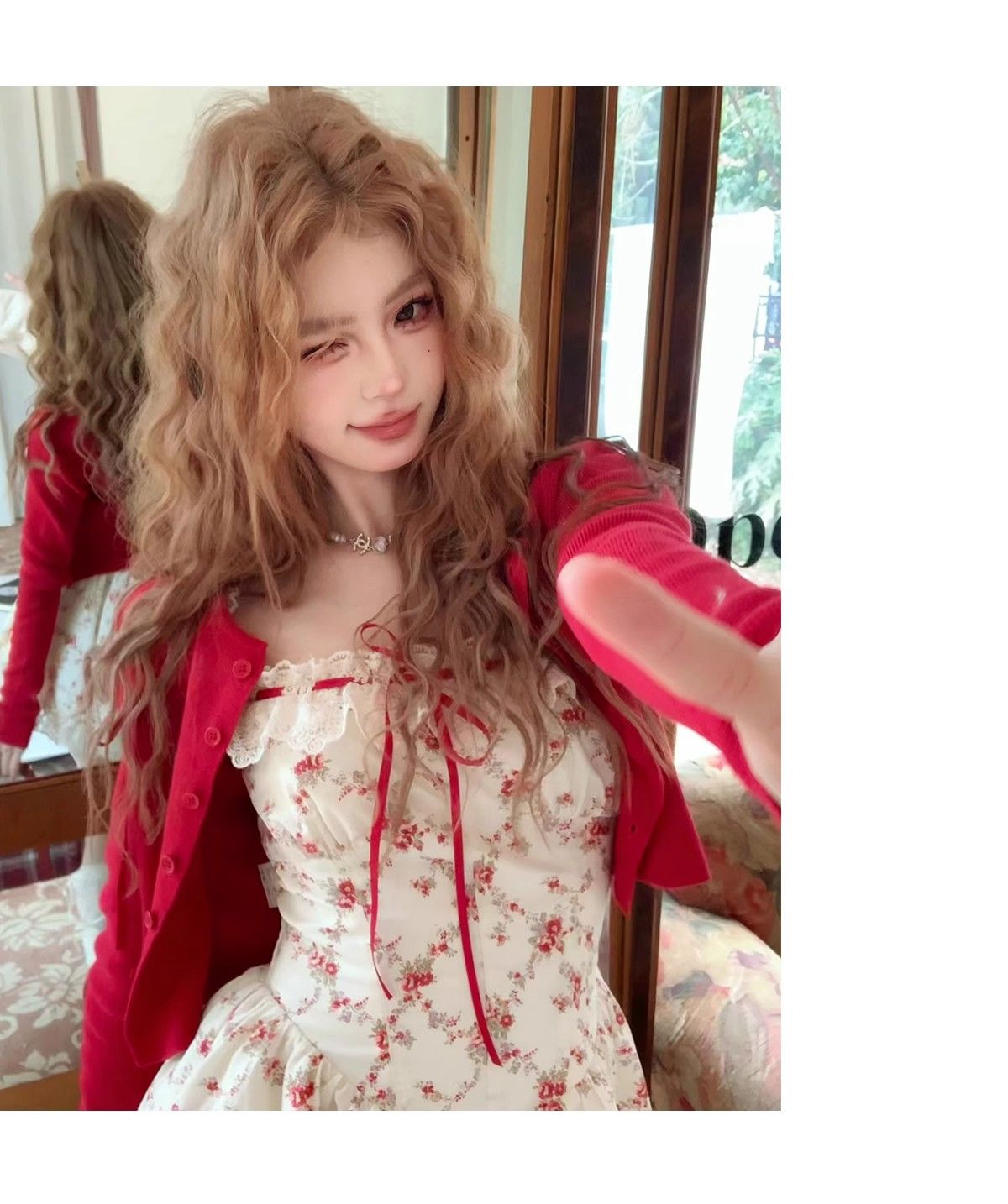 富养玫瑰 杏色田园风小碎花法式蕾丝吊带连衣裙春夏小外套