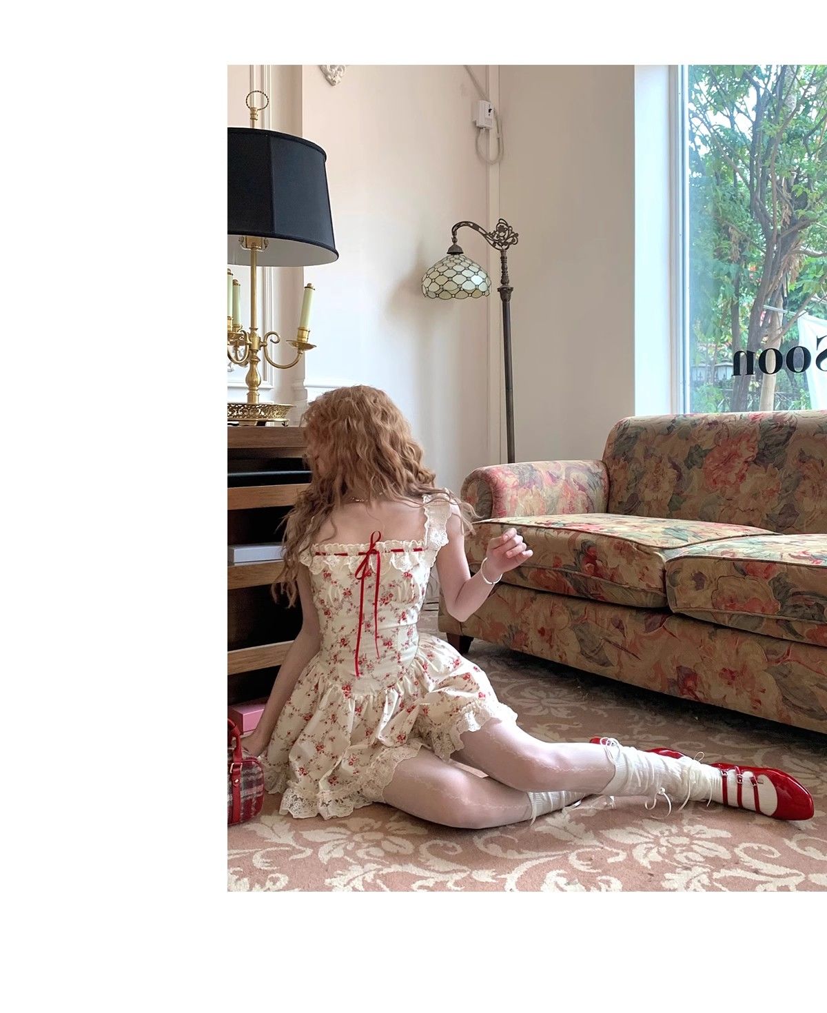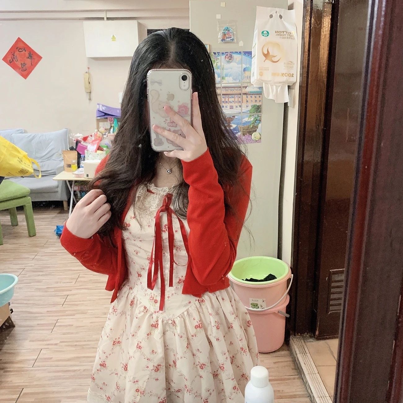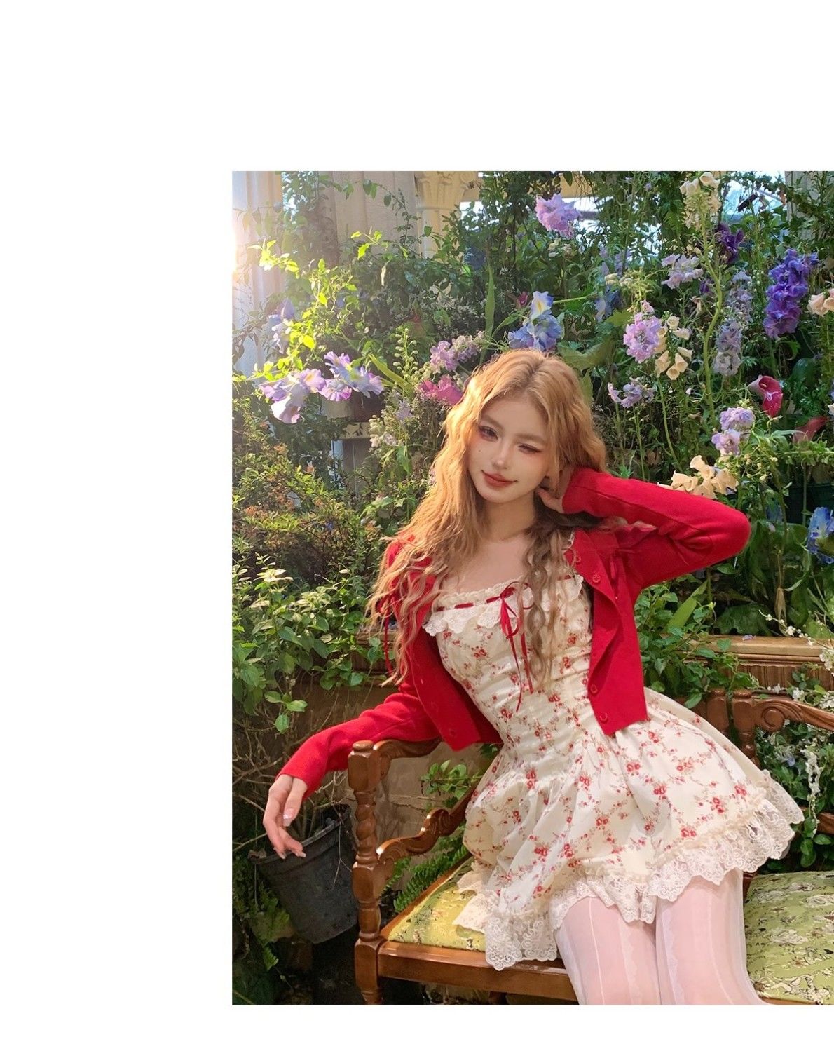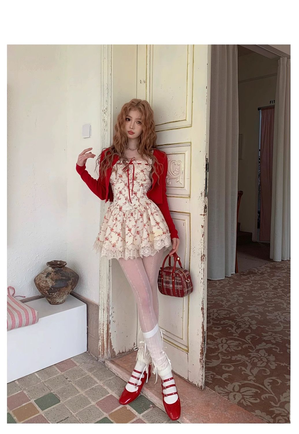富养玫瑰 杏色田园风小碎花法式蕾丝吊带连衣裙春夏小外套
