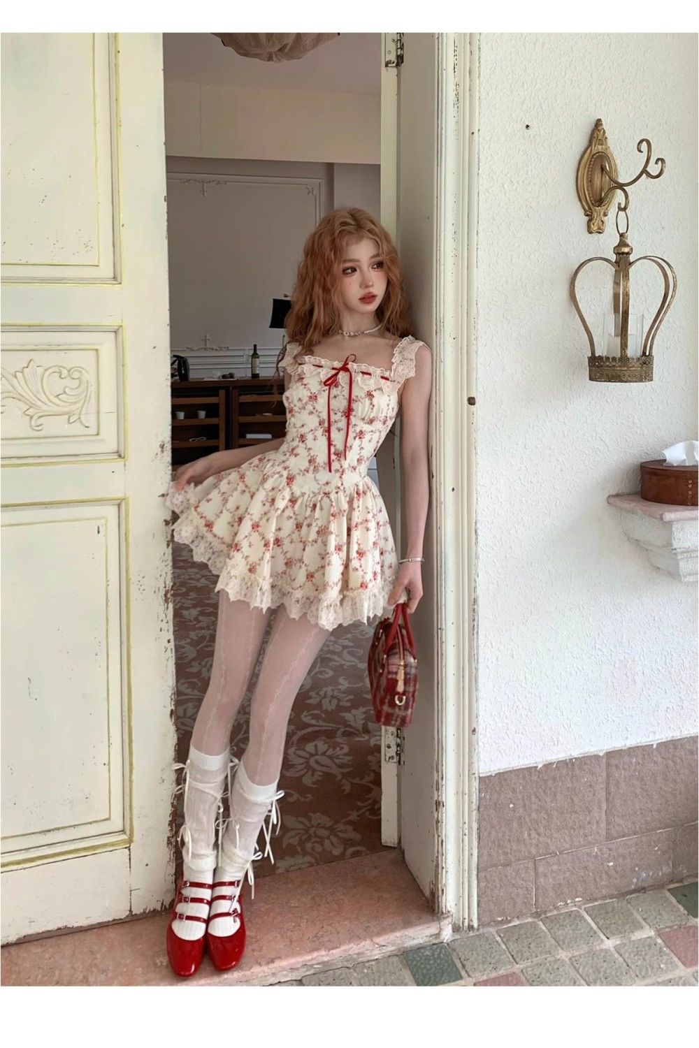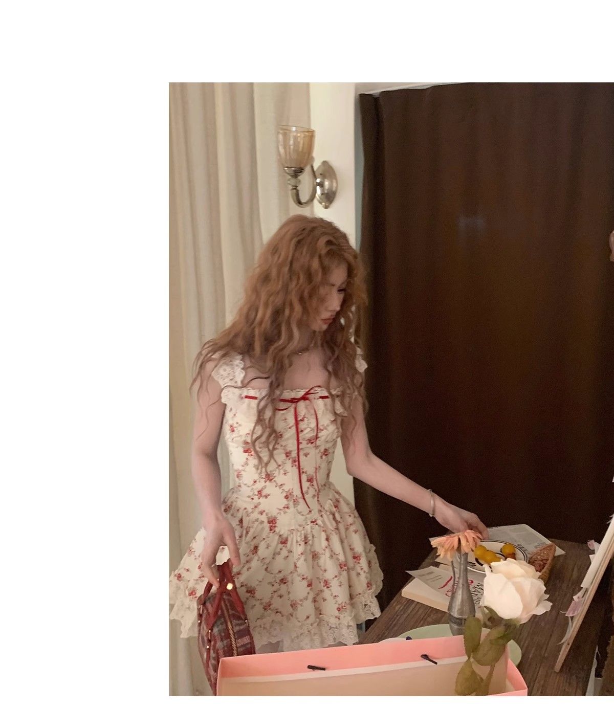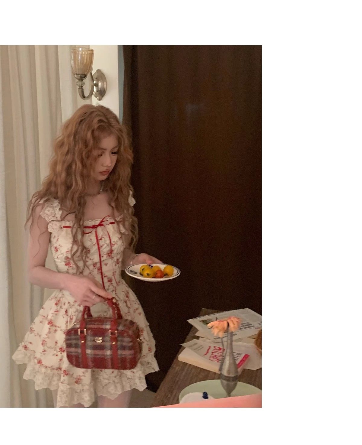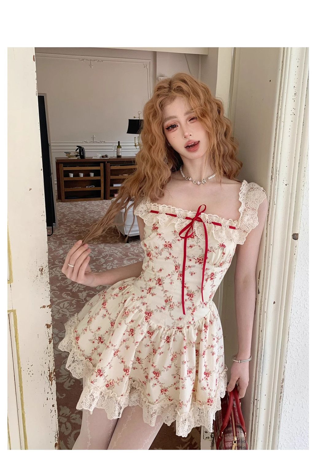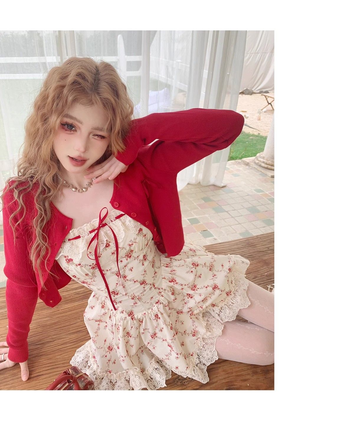 富养玫瑰 杏色田园风小碎花法式蕾丝吊带连衣裙春夏小外套