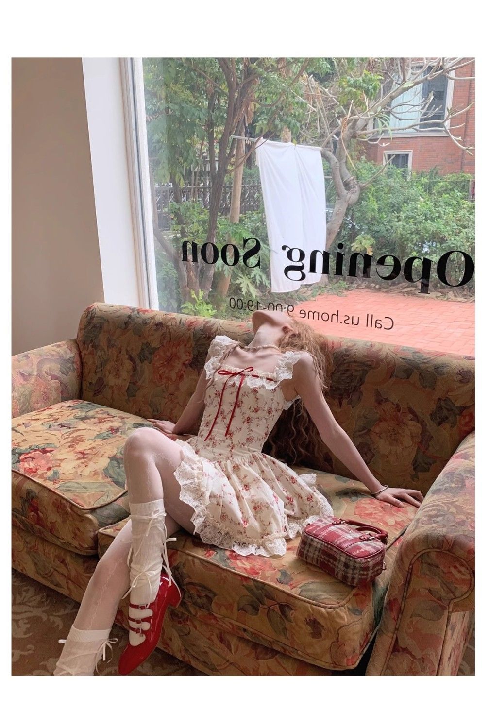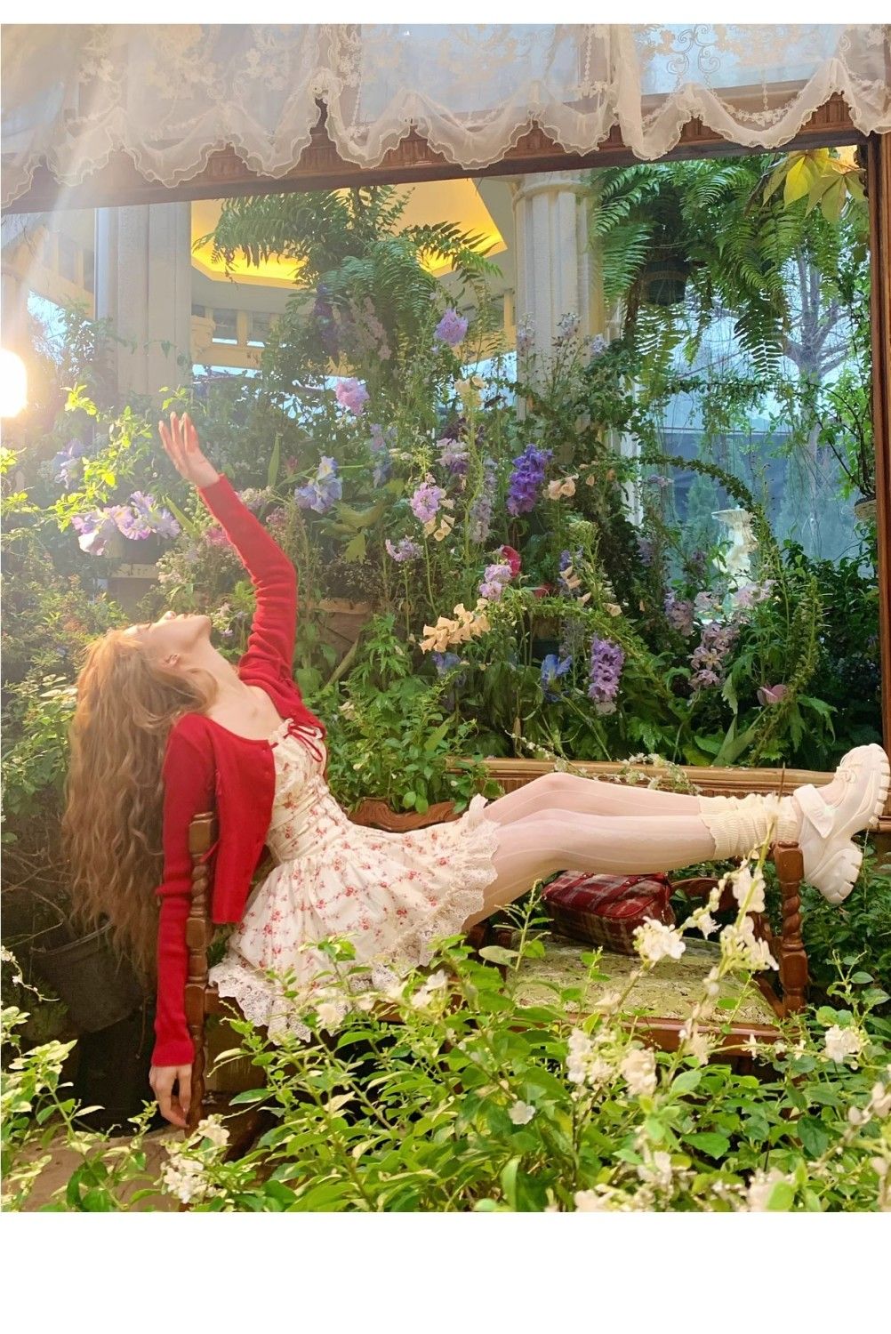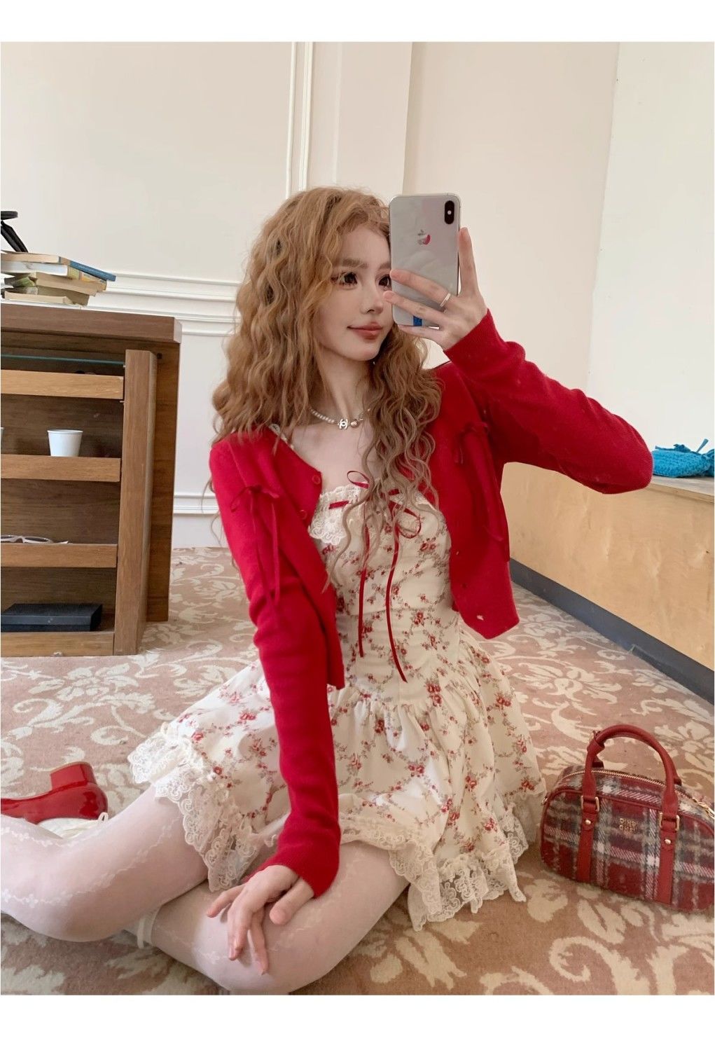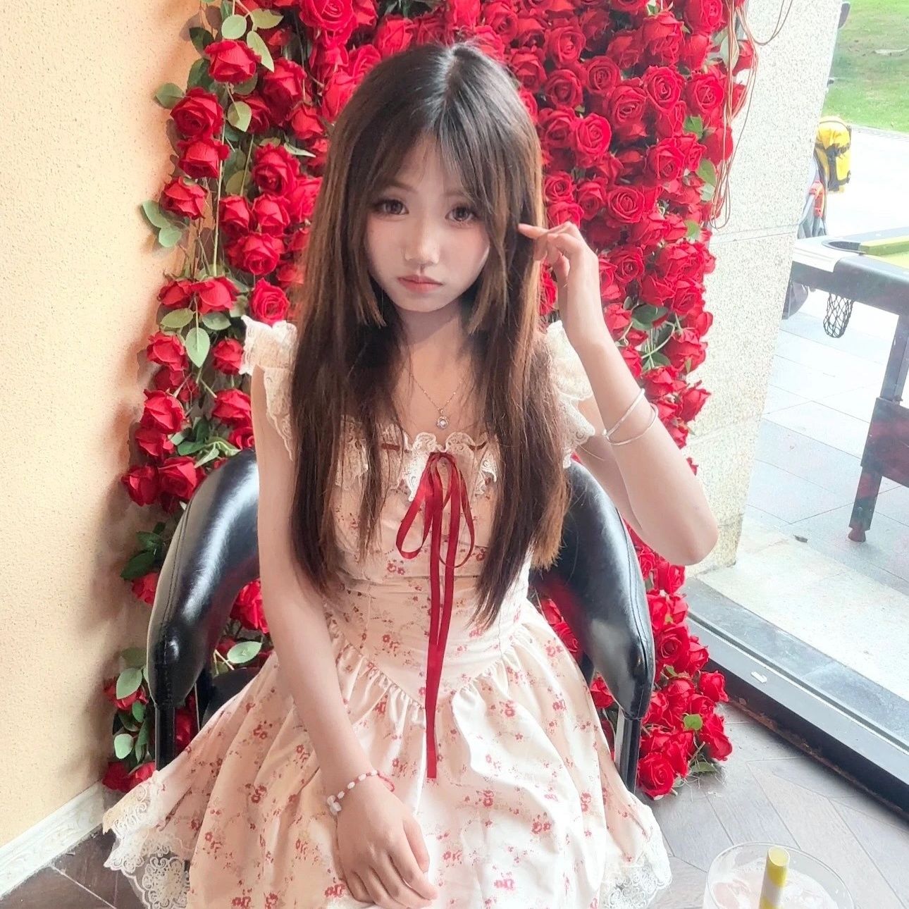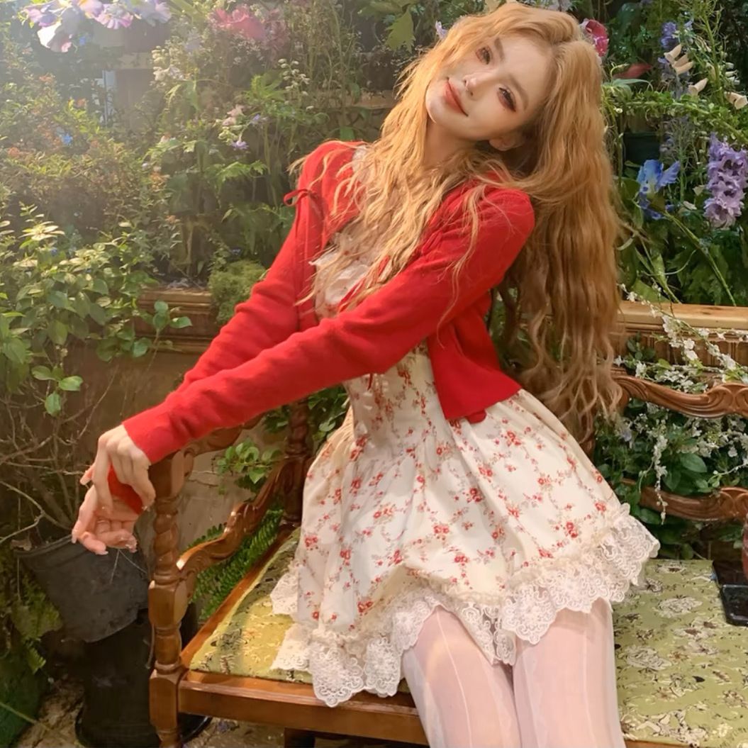 富养玫瑰 杏色田园风小碎花法式蕾丝吊带连衣裙春夏小外套