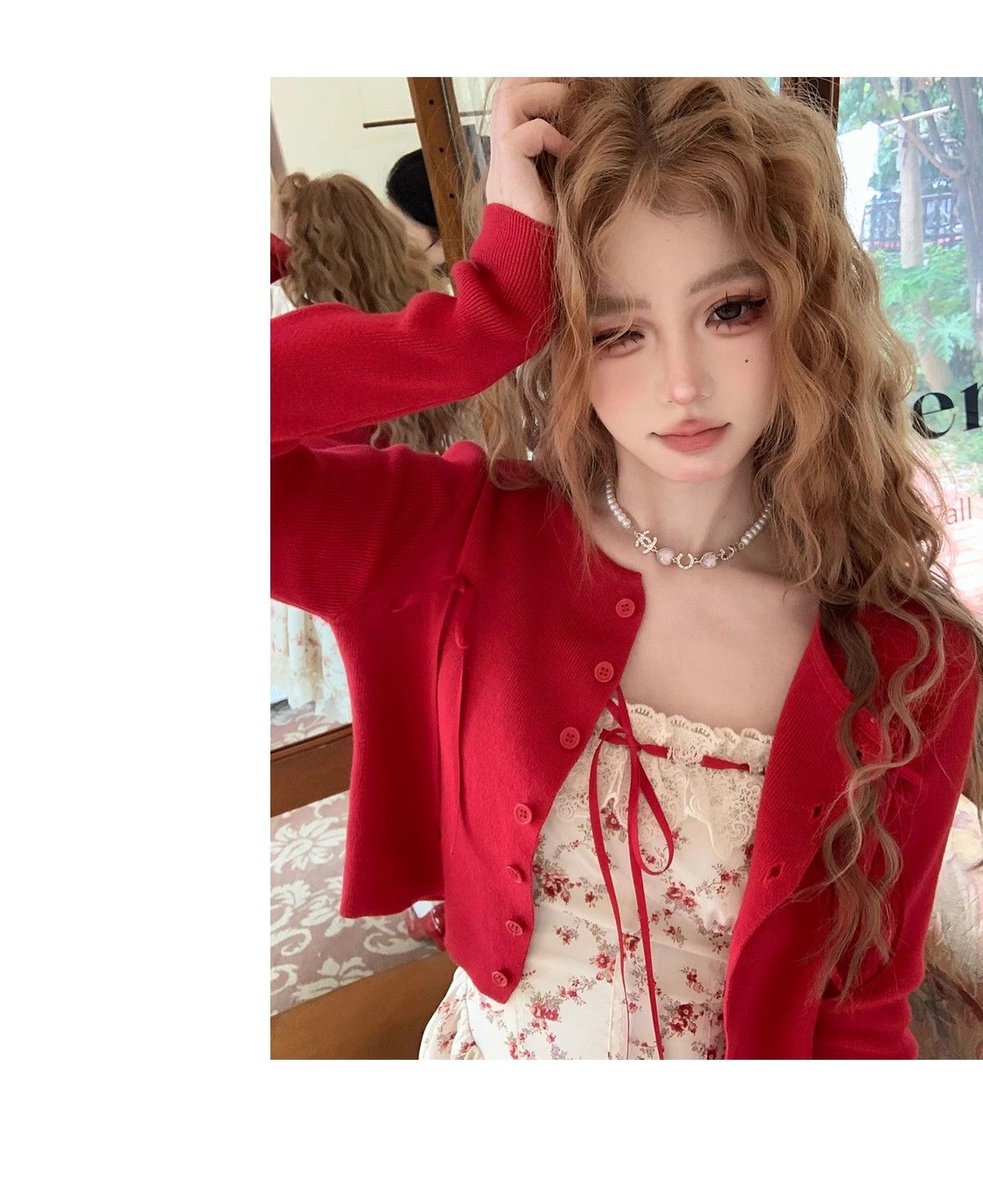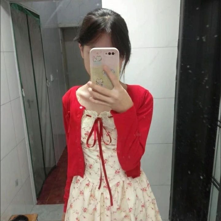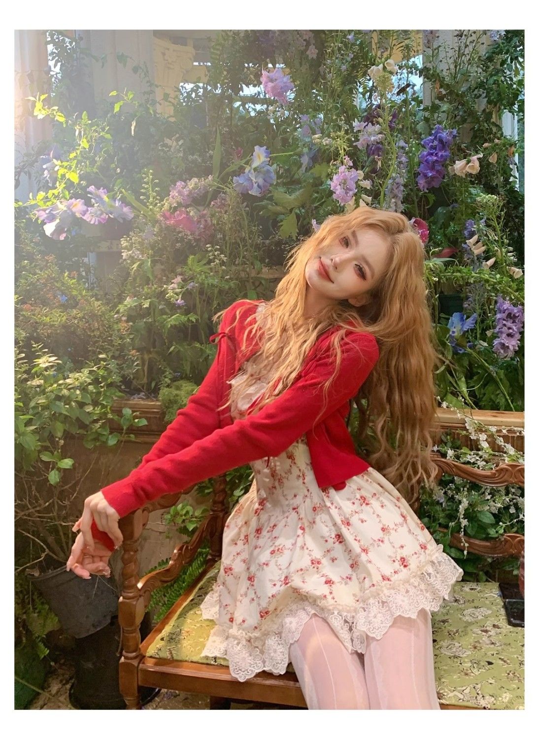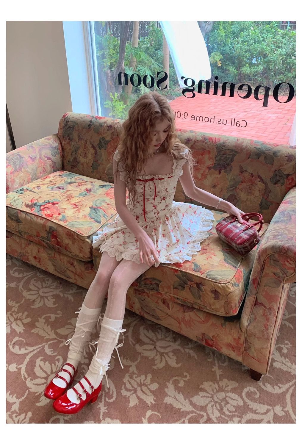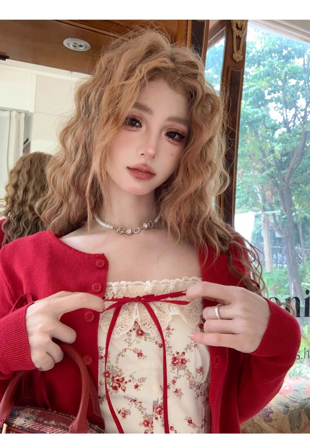 富养玫瑰 杏色田园风小碎花法式蕾丝吊带连衣裙春夏小外套