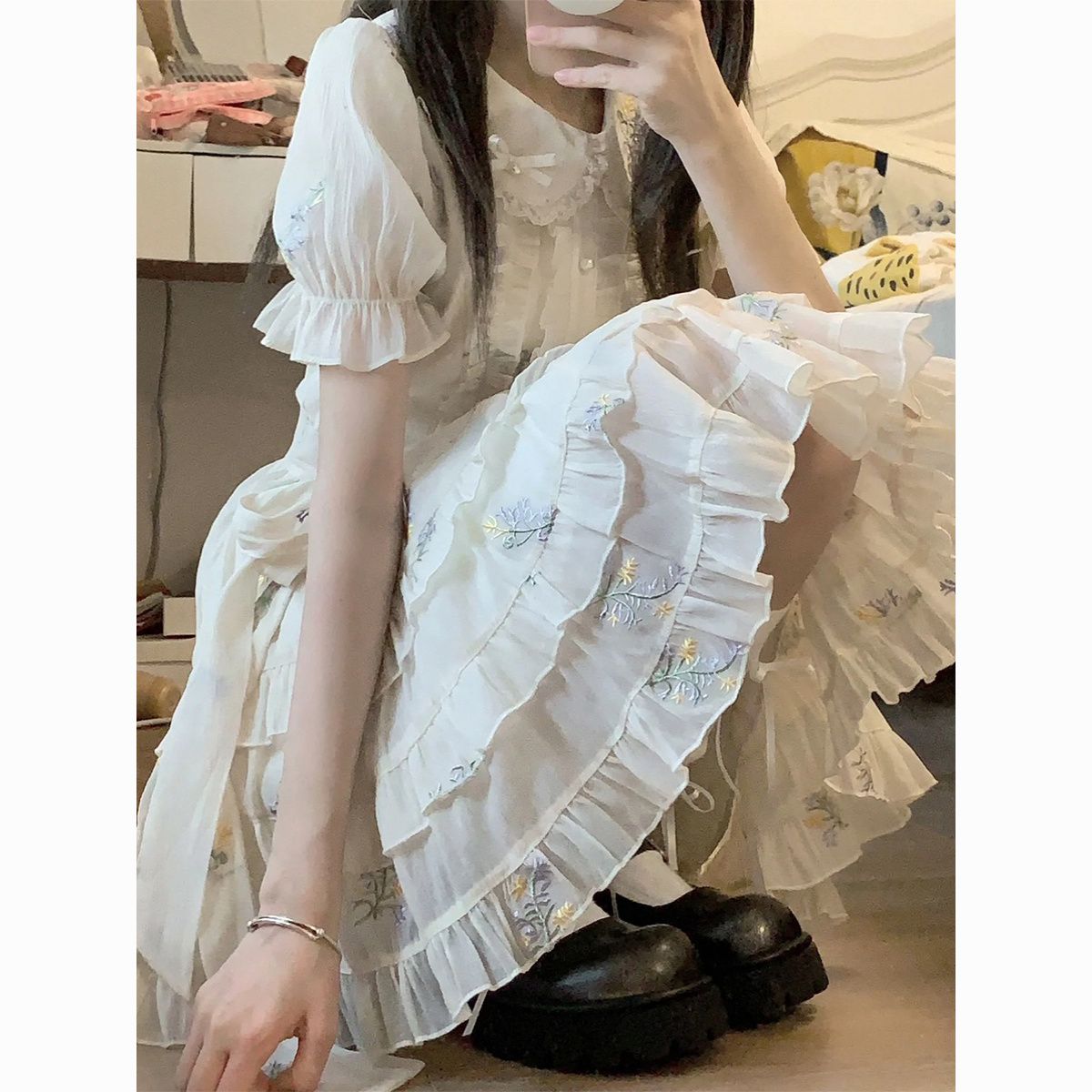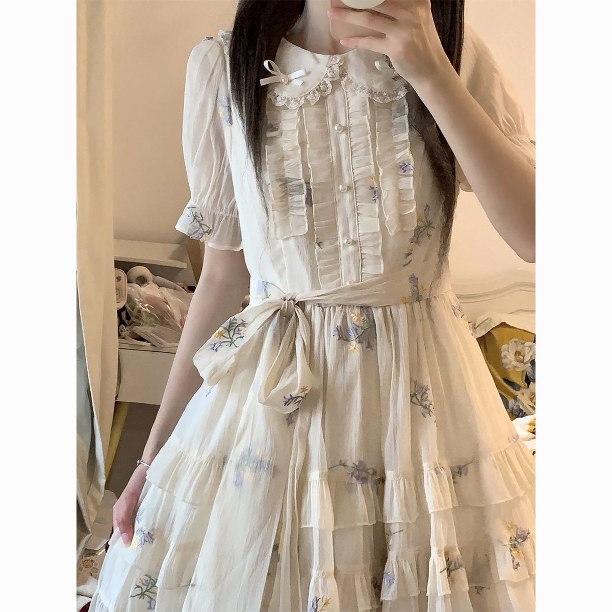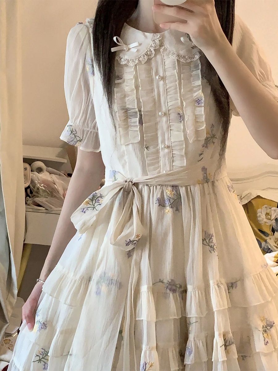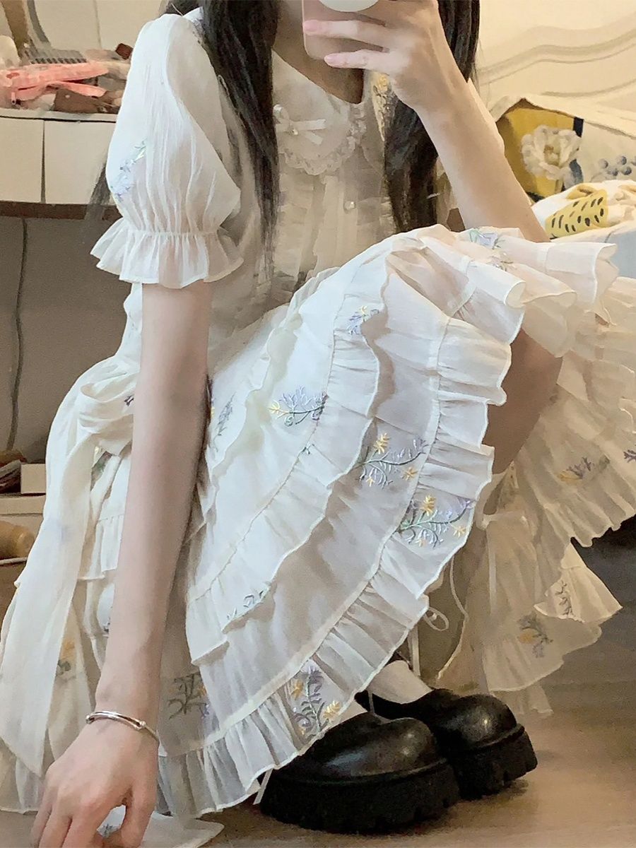 Blovelan花翎来信 可爱甜美减龄娃娃领绣花网纱连衣裙夏