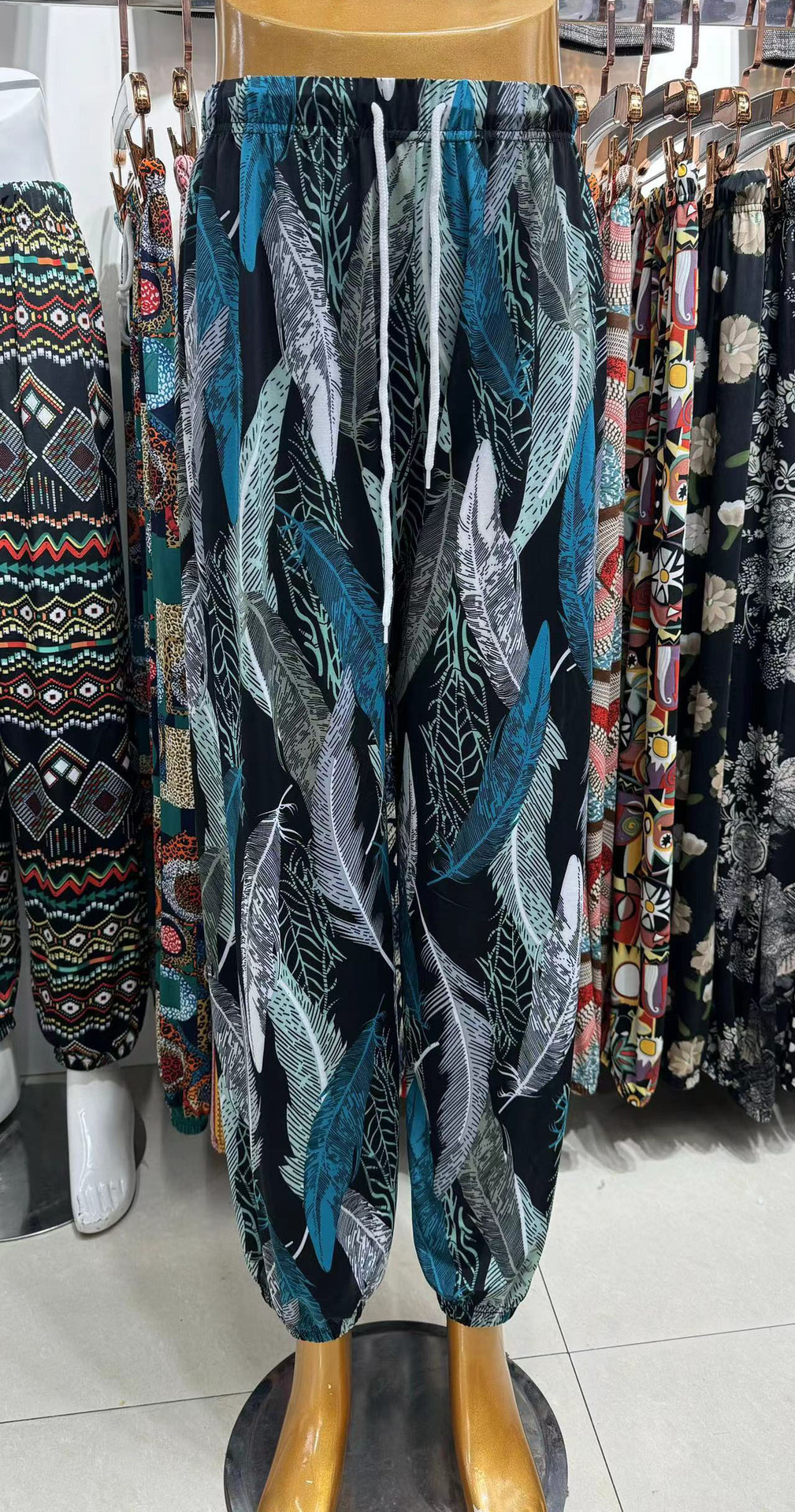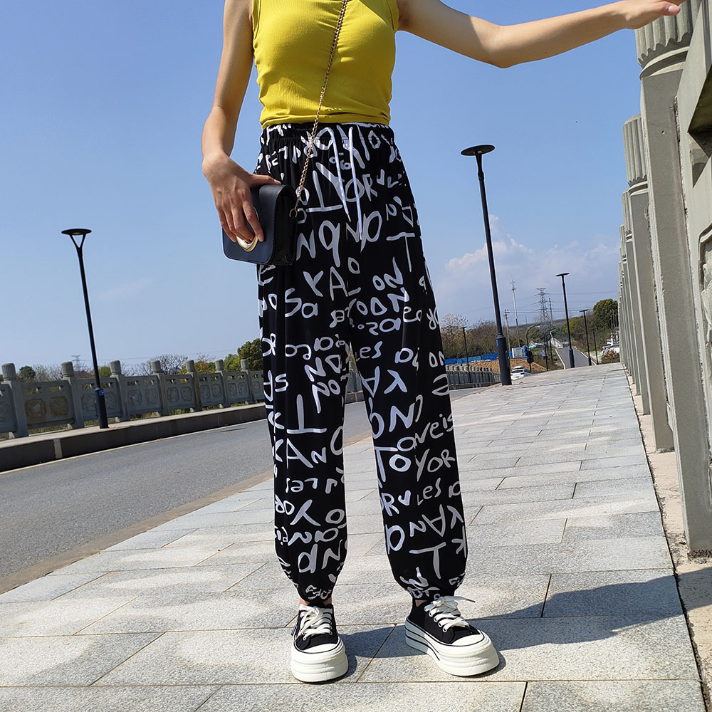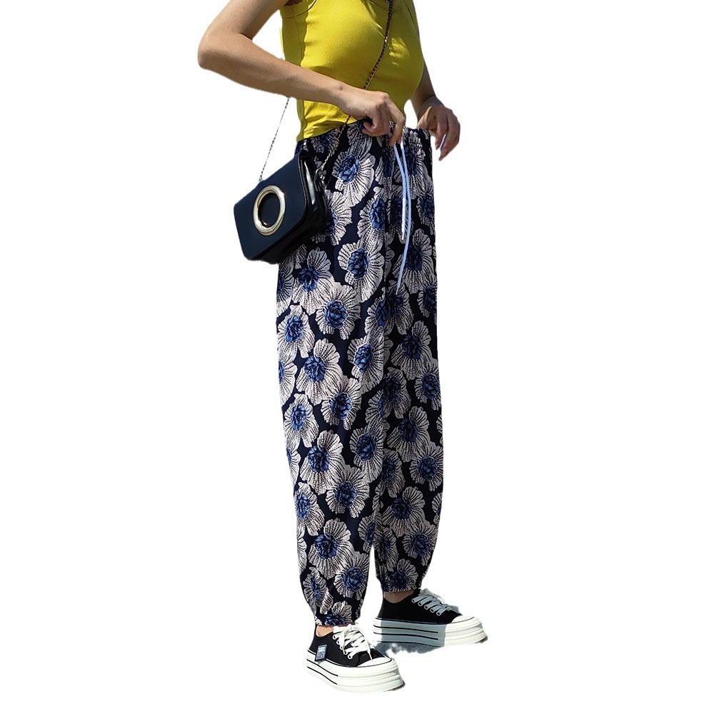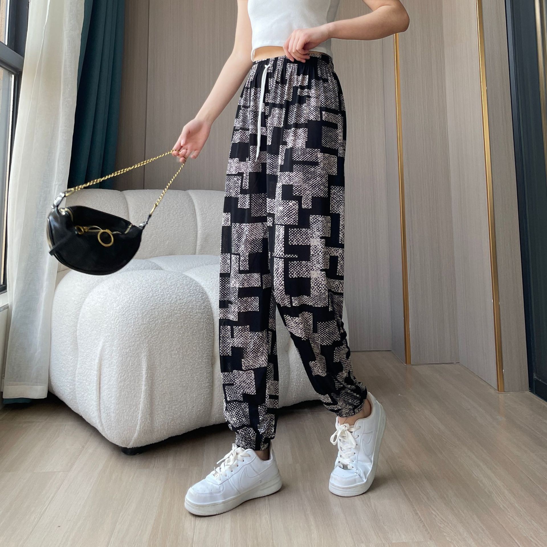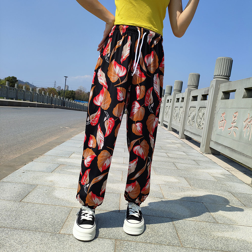 冰丝印花休闲裤女夏爆高腰宽松束脚九分灯笼裤紧口裤凉凉花裤防蚊