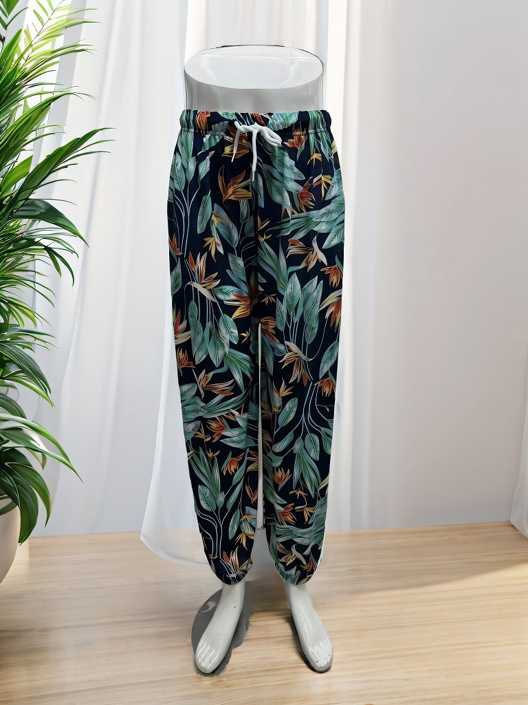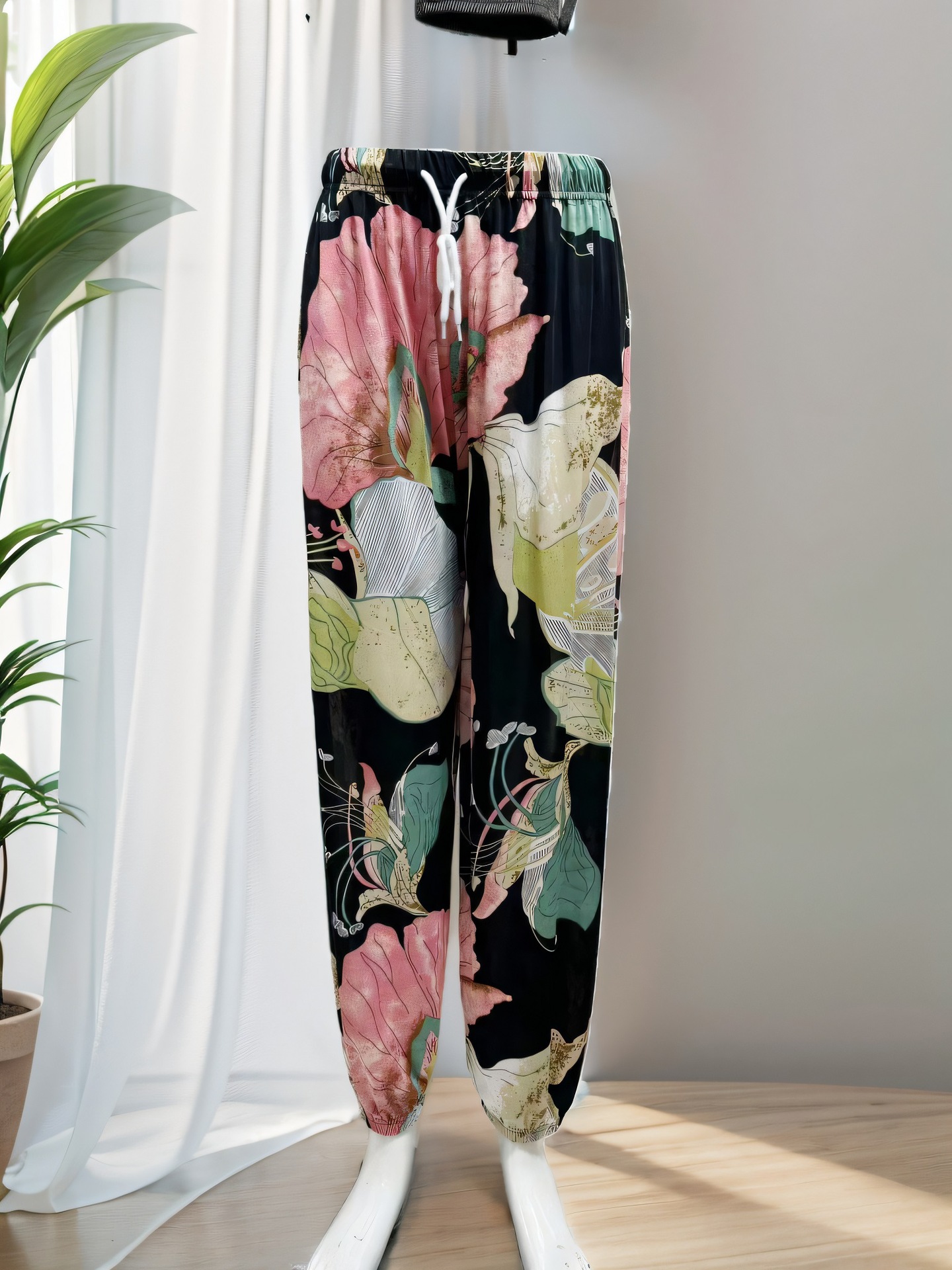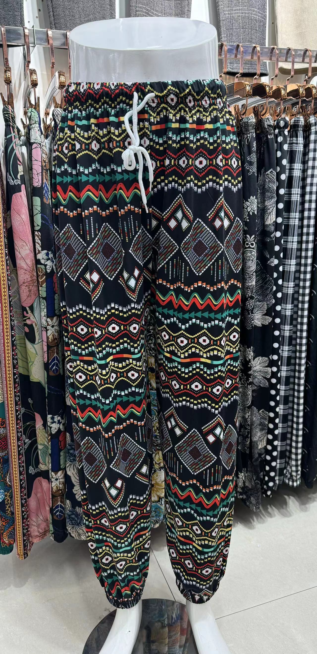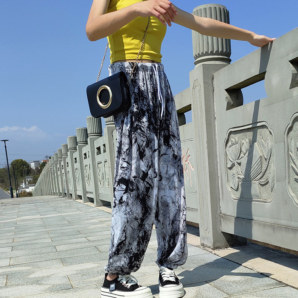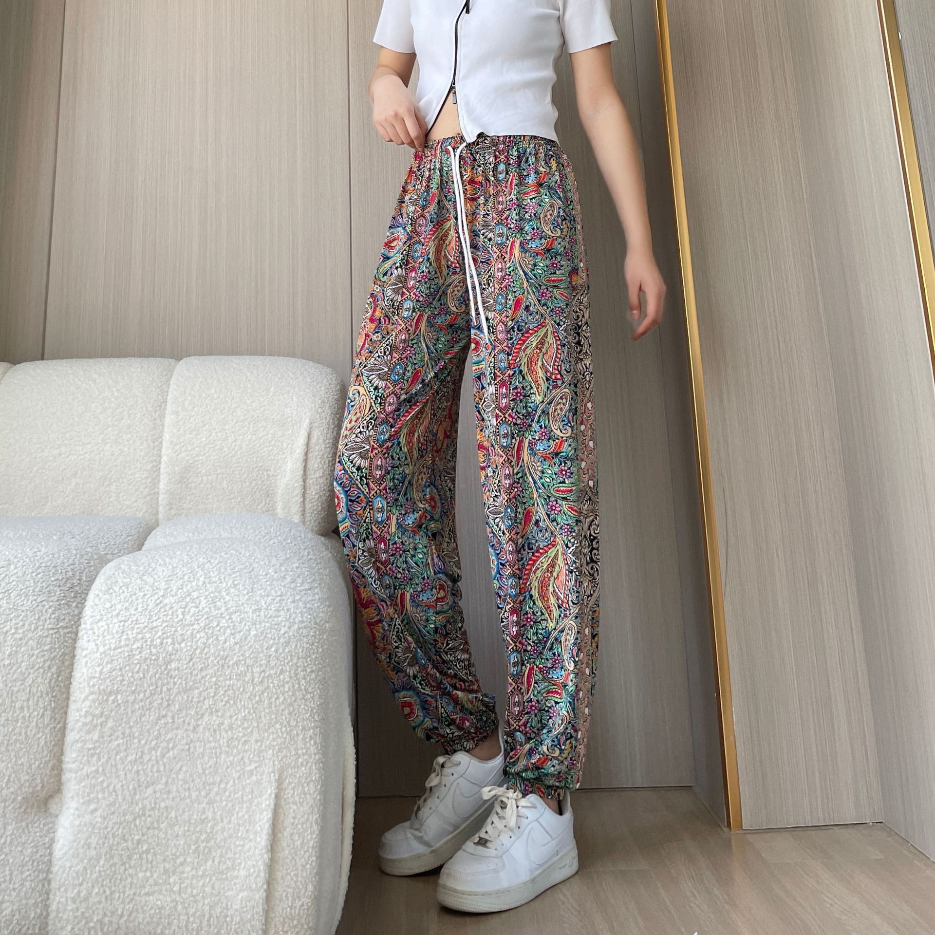 冰丝印花休闲裤女夏爆高腰宽松束脚九分灯笼裤紧口裤凉凉花裤防蚊