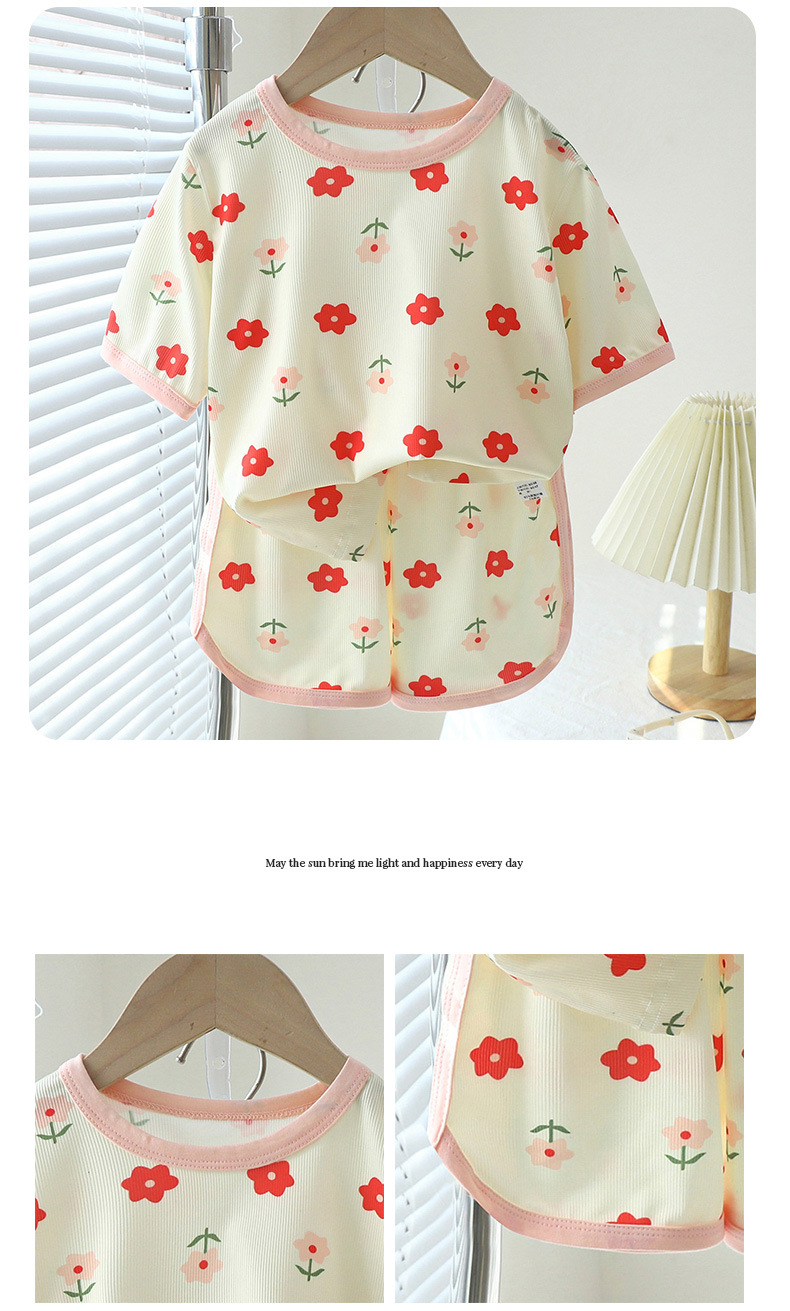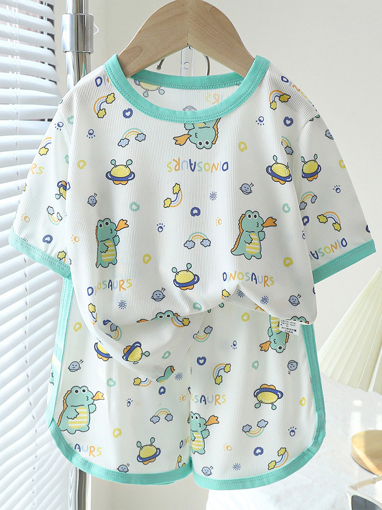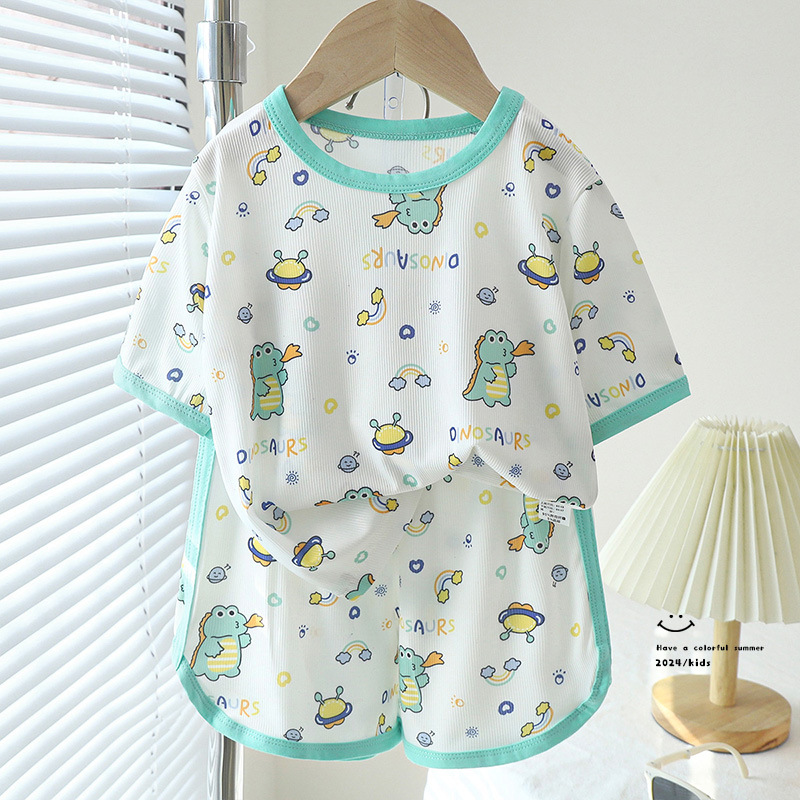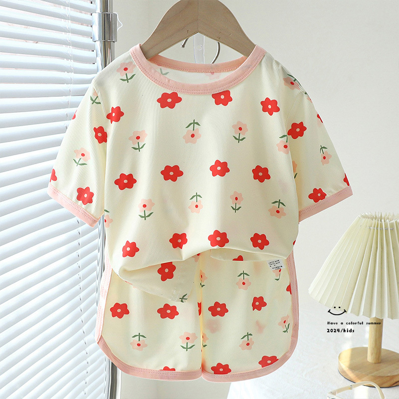 儿童短袖短裤套装女童夏季冰丝小碎花印花家居服男宝宝卡通短袖T