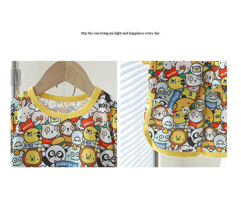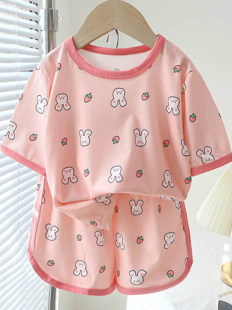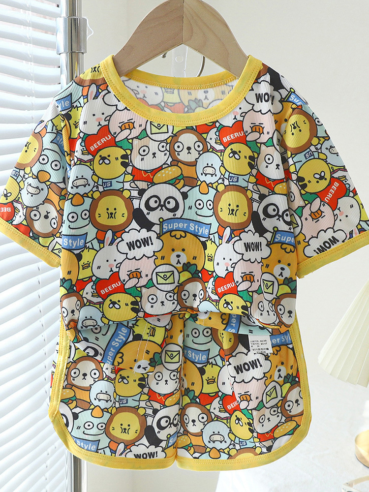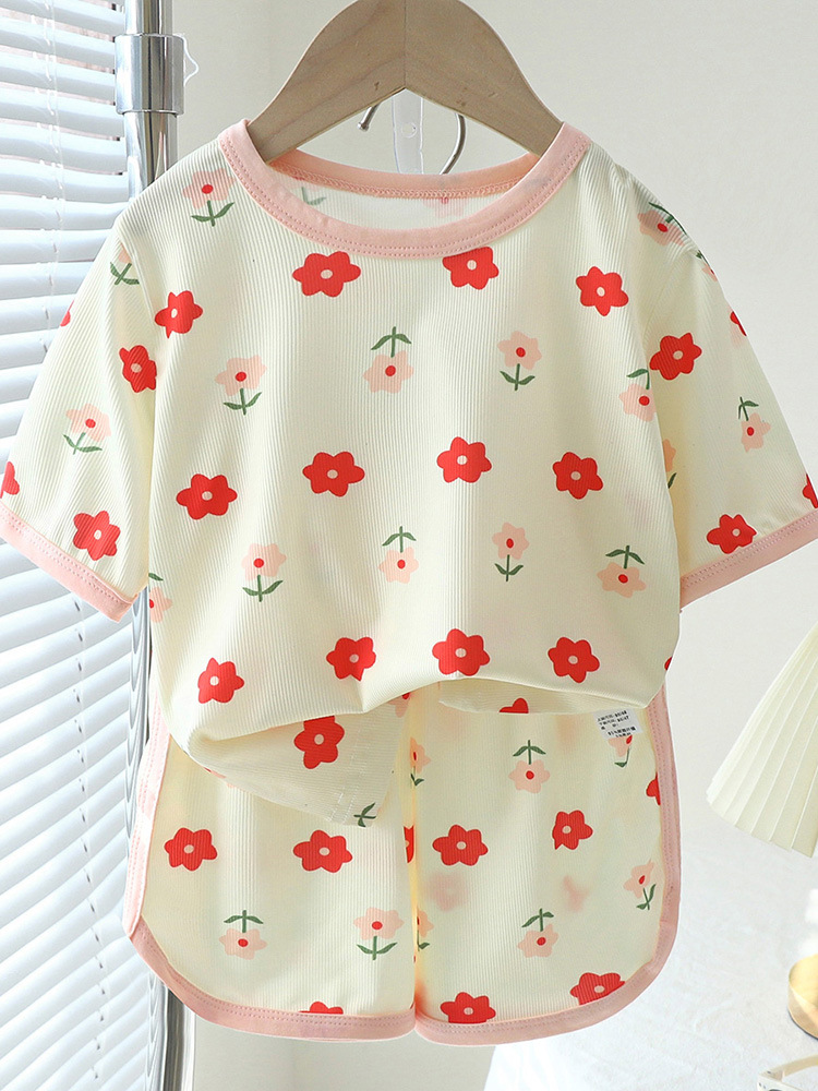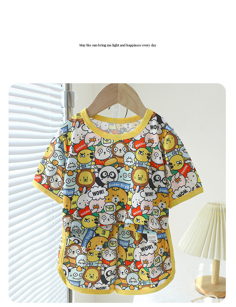 儿童短袖短裤套装女童夏季冰丝小碎花印花家居服男宝宝卡通短袖T