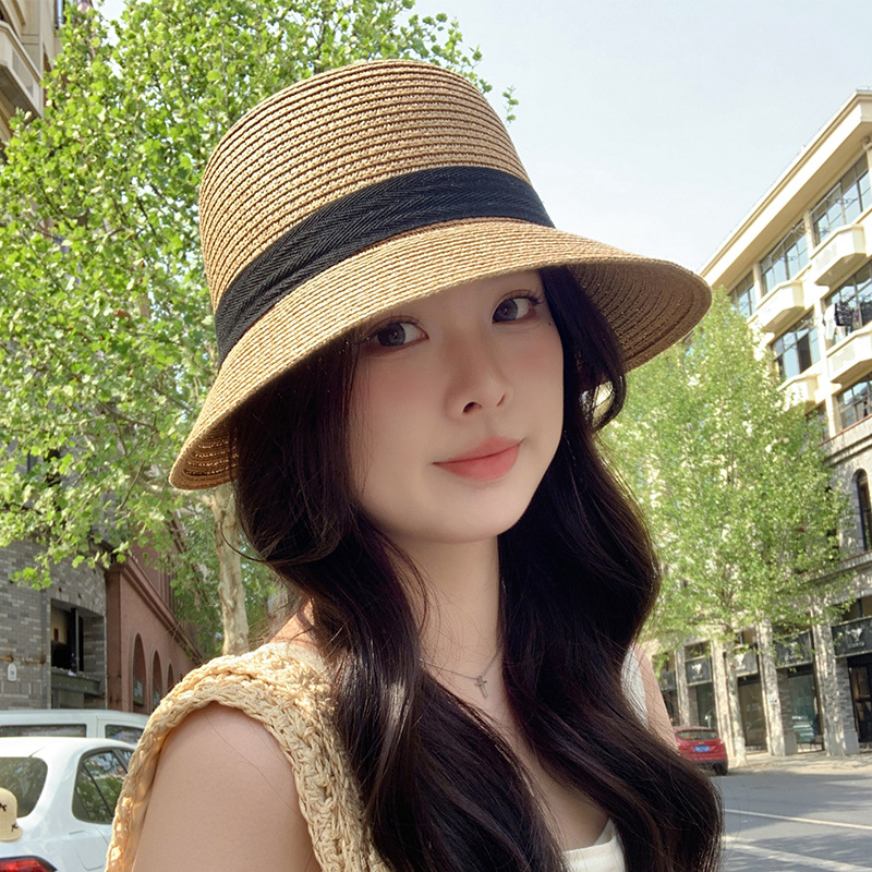 防晒草编帽子女夏季平顶草帽大帽檐遮阳帽英伦礼帽海边度假沙滩帽