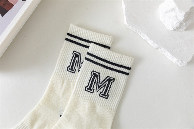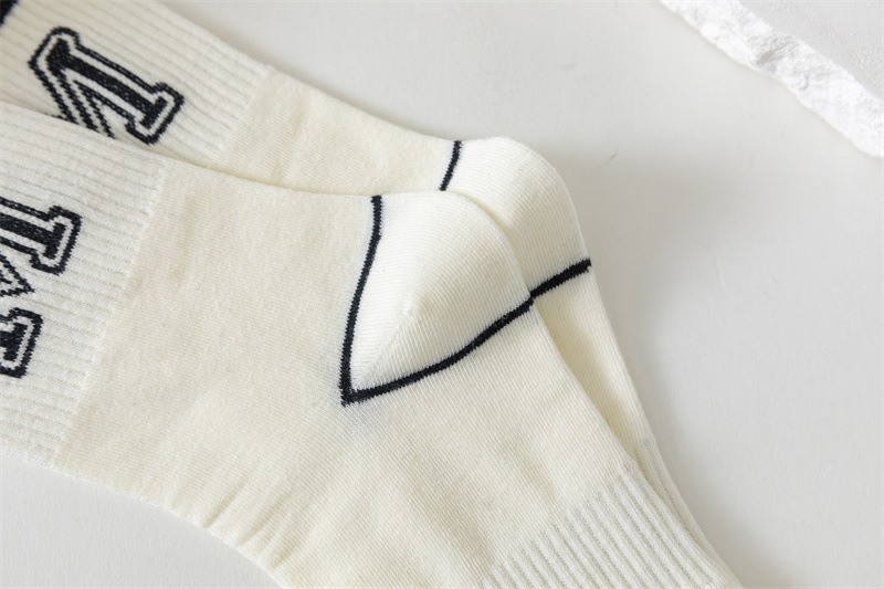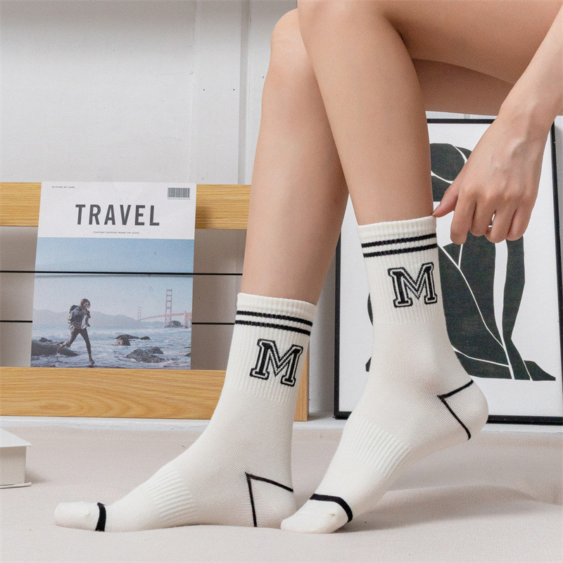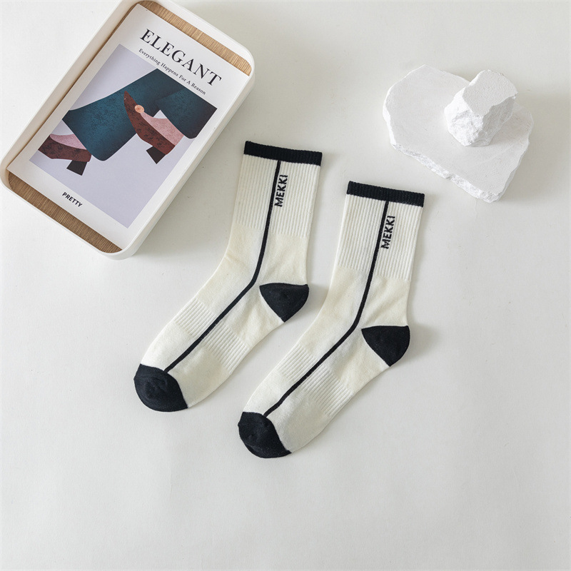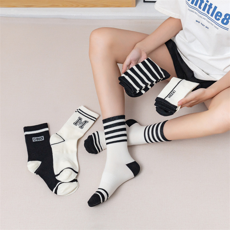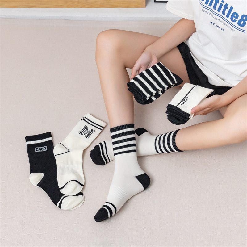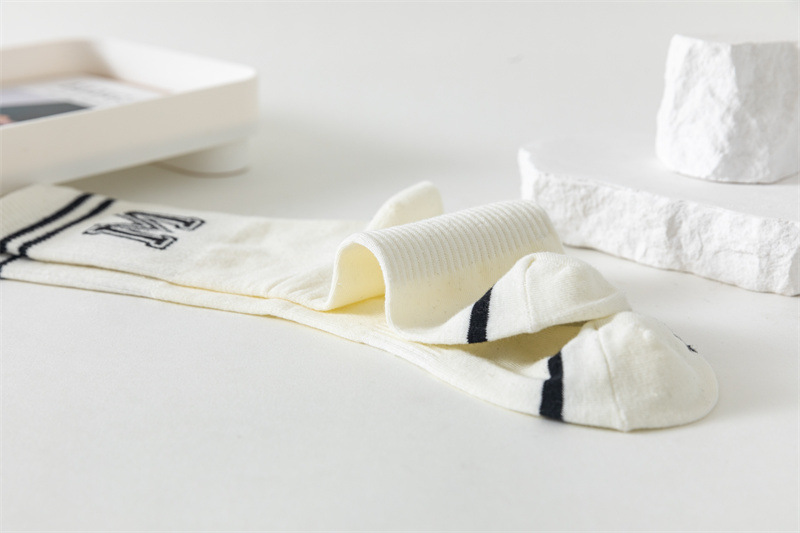 白色运动瑜伽袜休闲棉袜 黑色条纹字母堆堆袜ins学院风中筒袜女袜