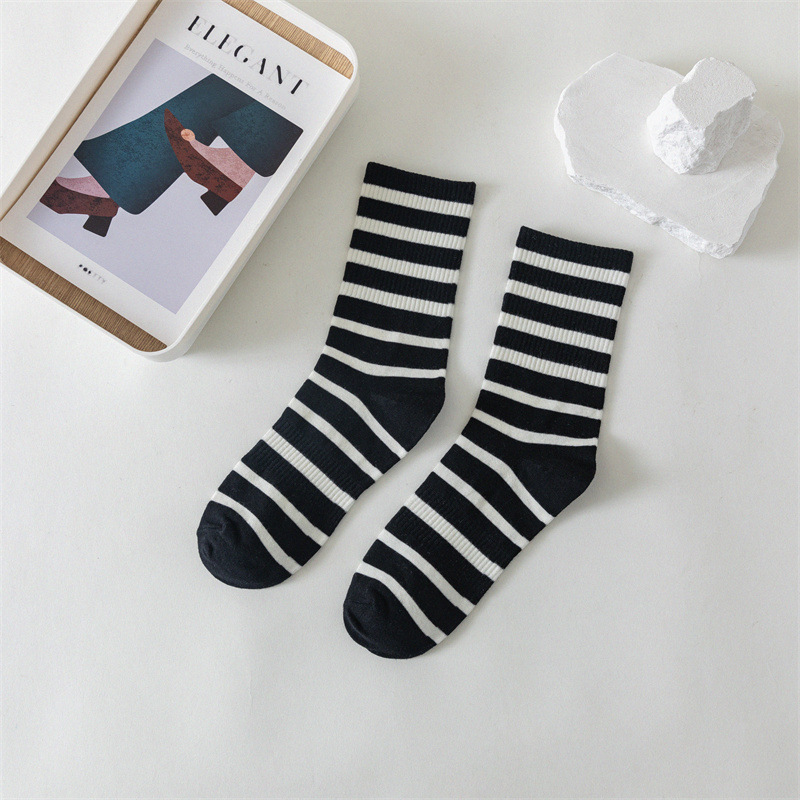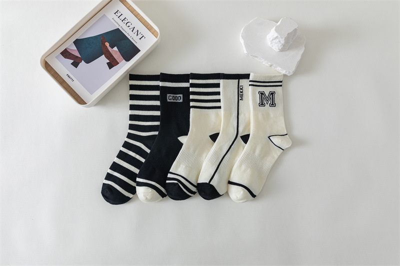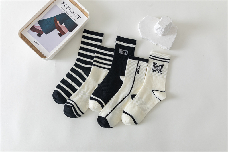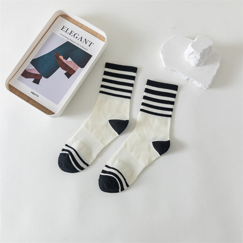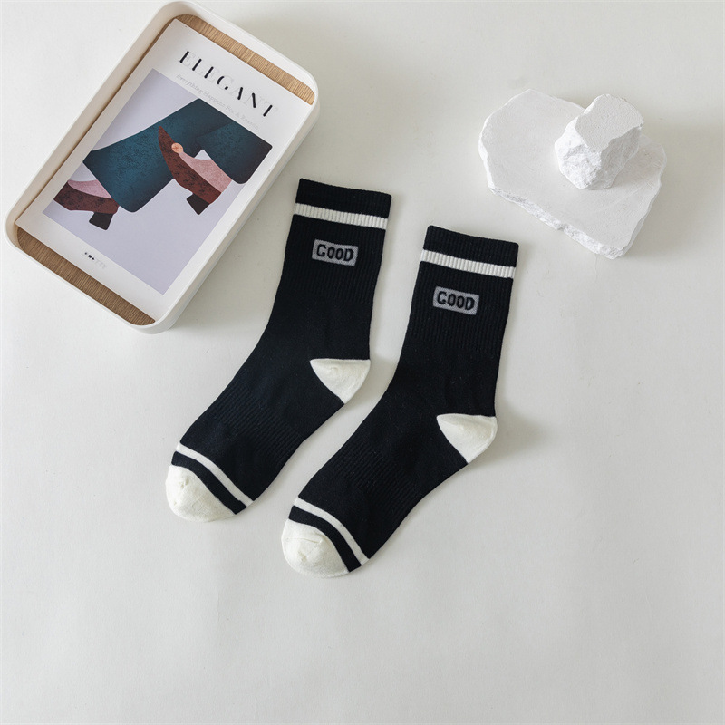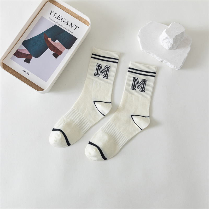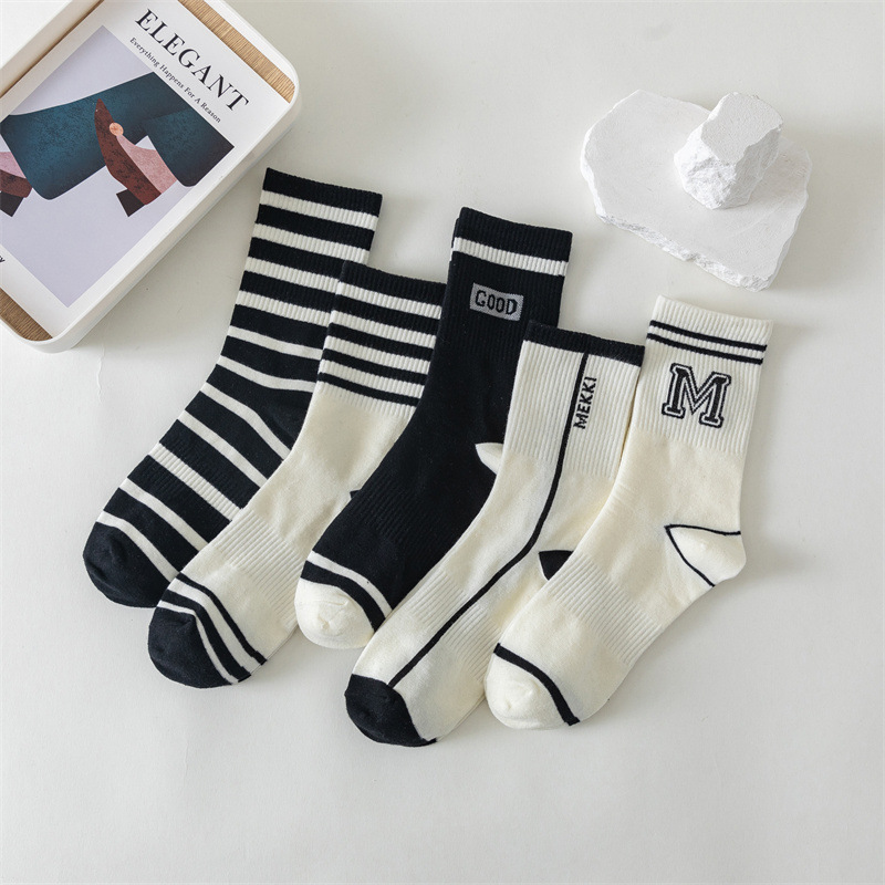 白色运动瑜伽袜休闲棉袜 黑色条纹字母堆堆袜ins学院风中筒袜女袜