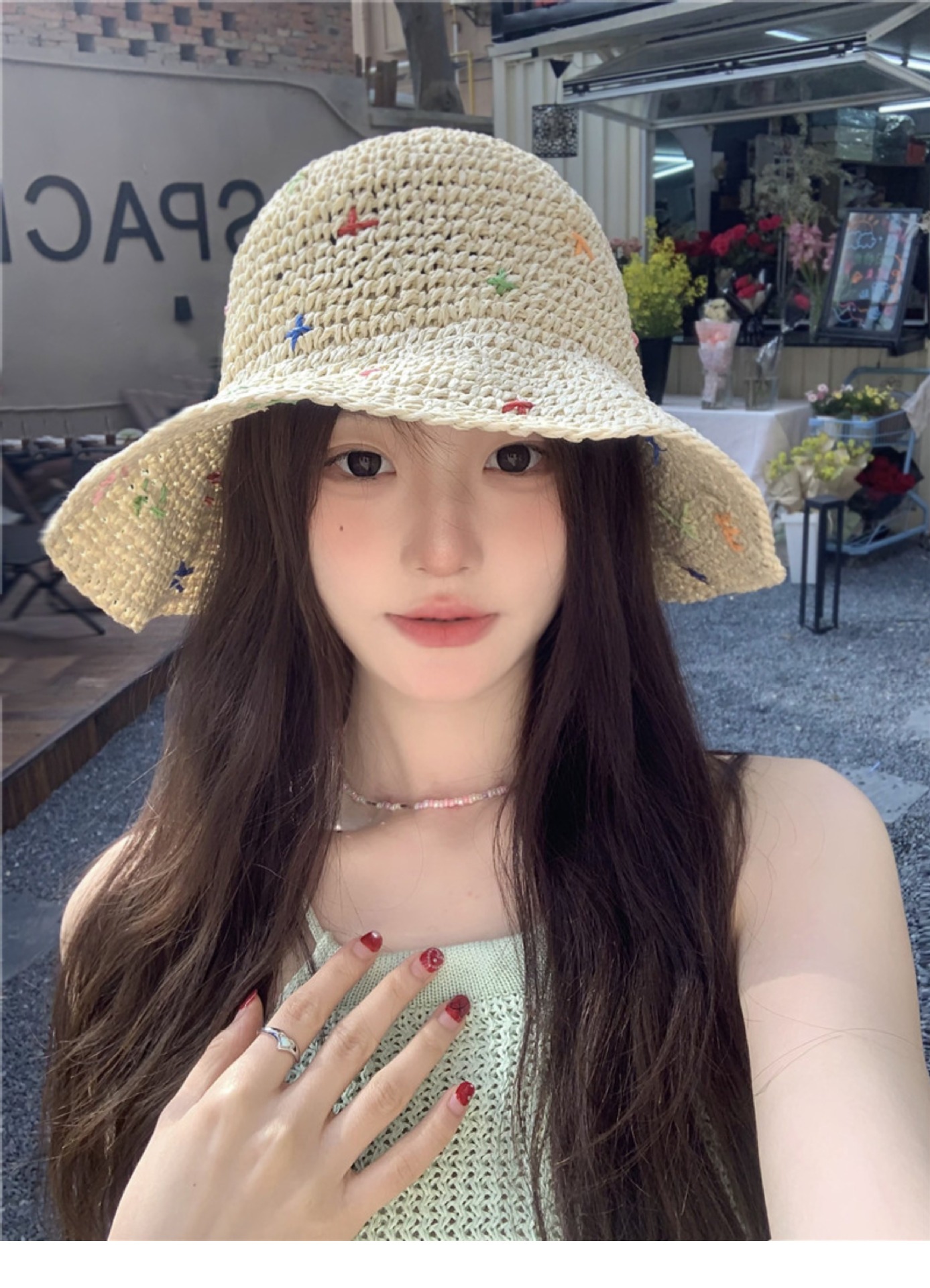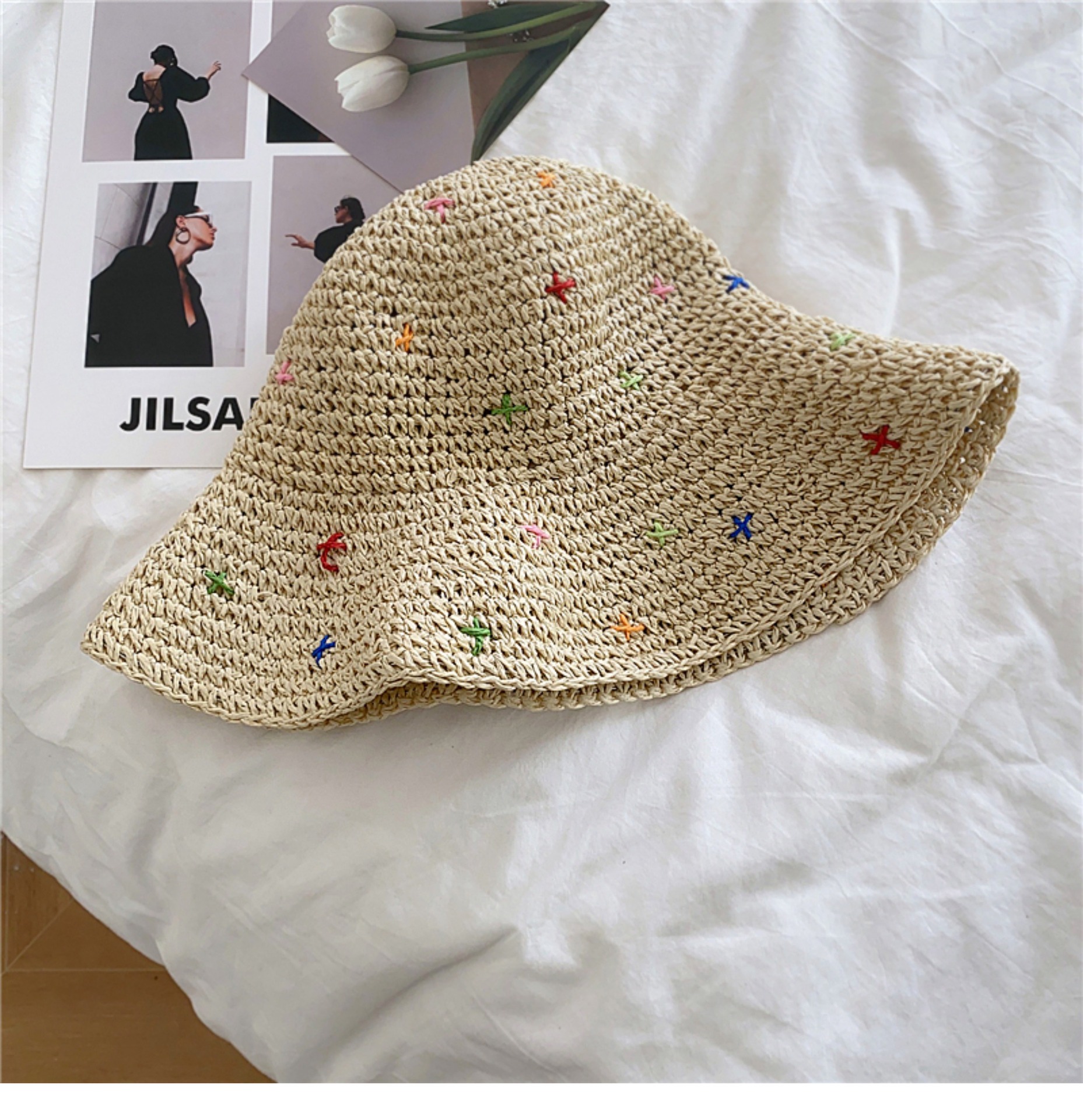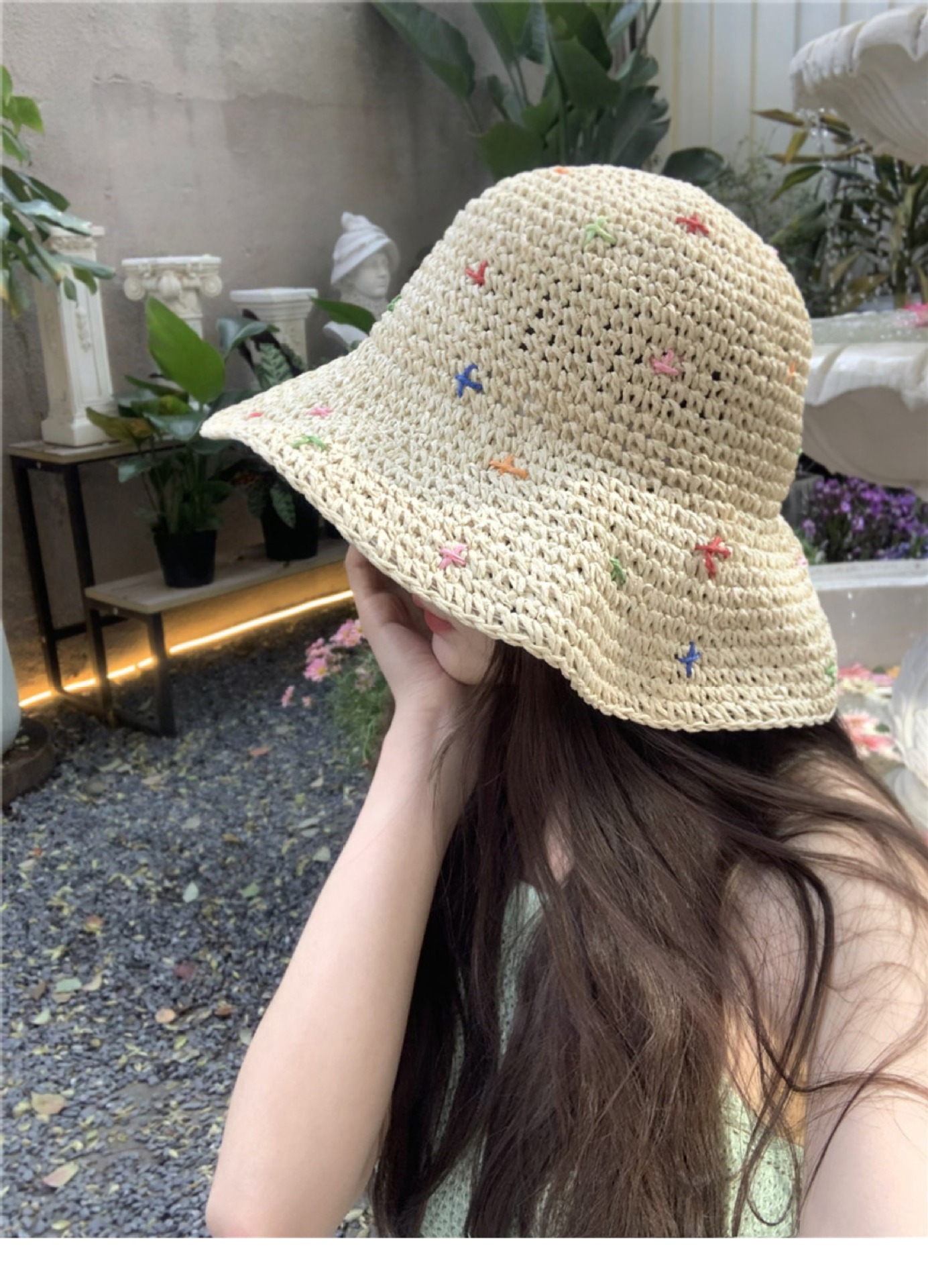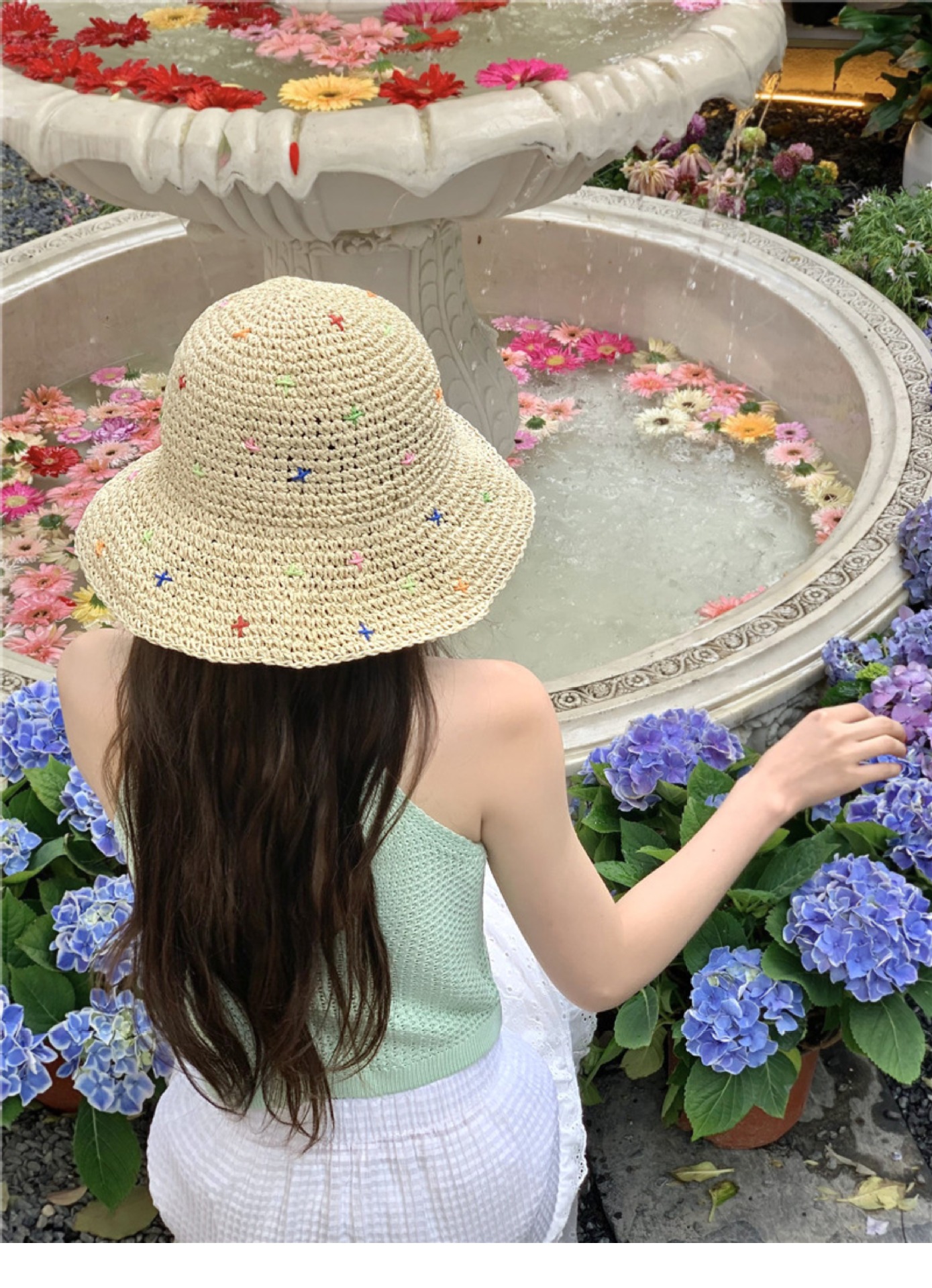彩色甜美编织草帽女夏季海边沙滩镂空钩针防晒帽度假大帽檐遮阳帽