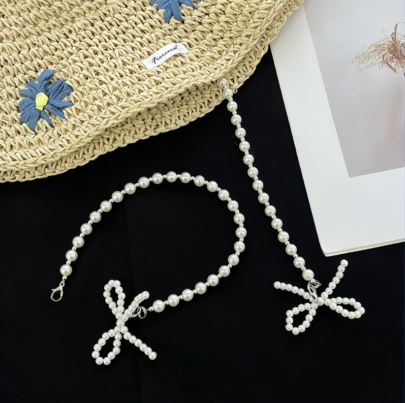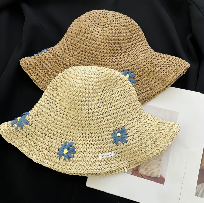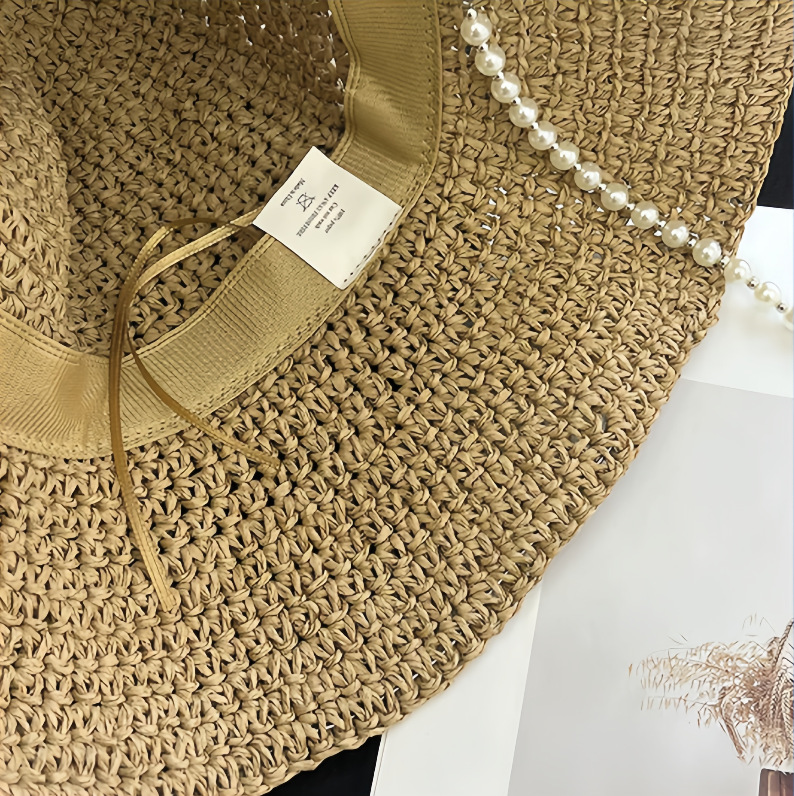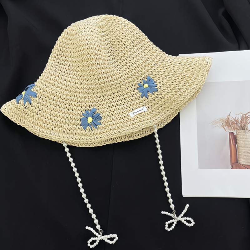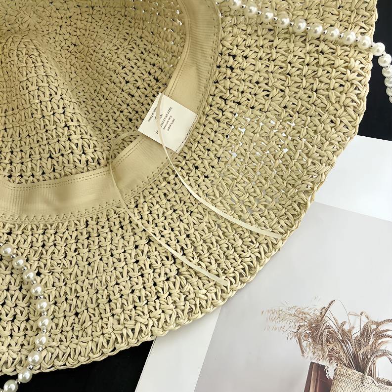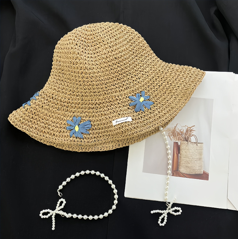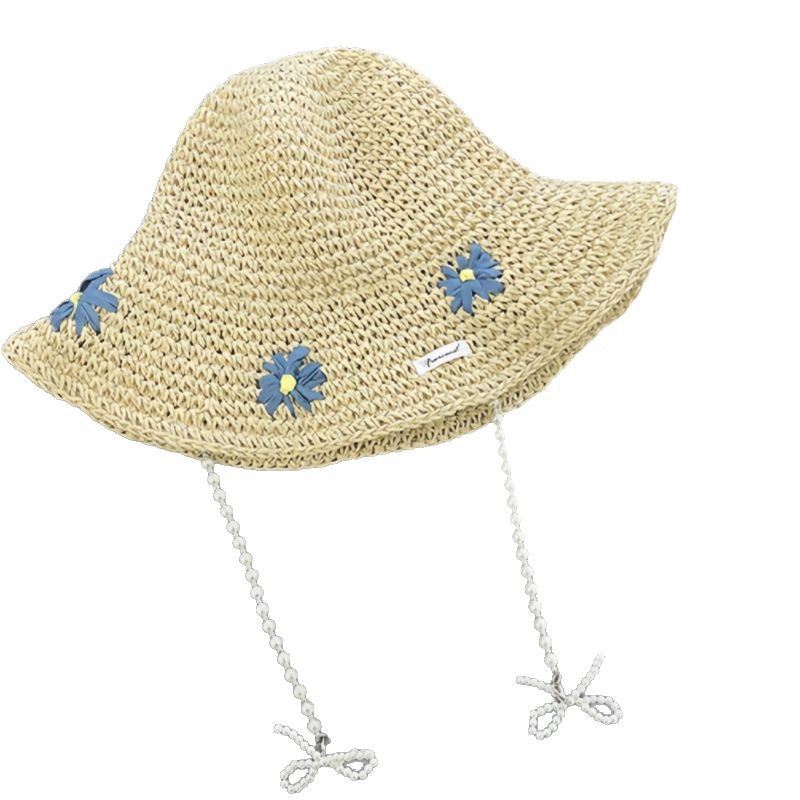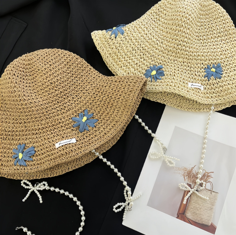 2025新款珍珠链条花朵草编渔夫帽女生夏季镂空海边度假遮阳防晒帽