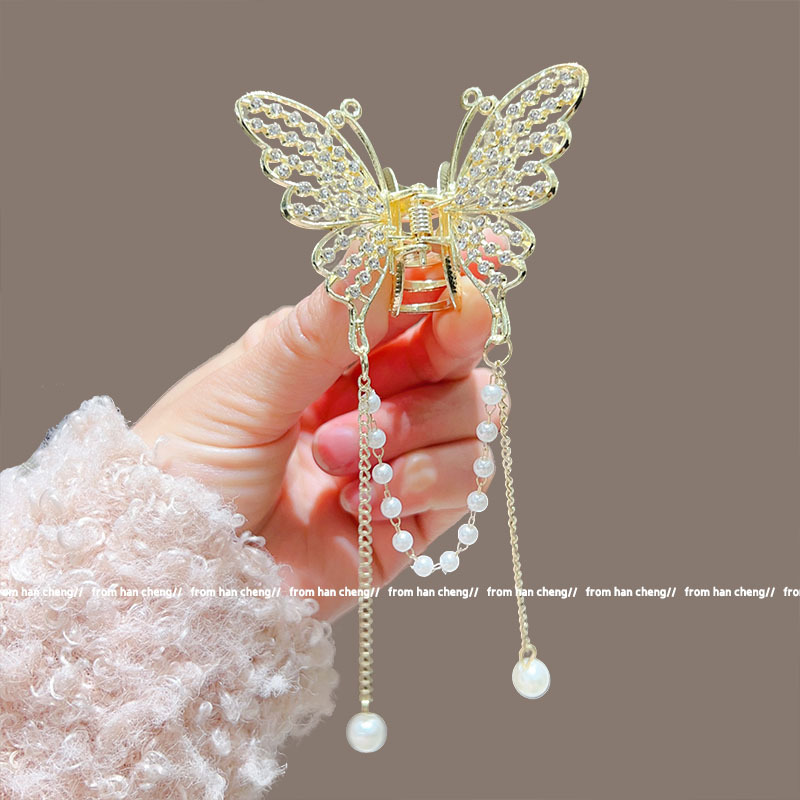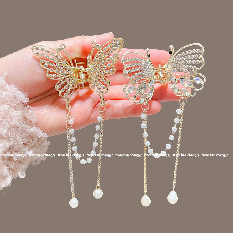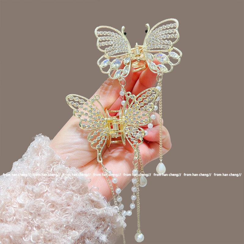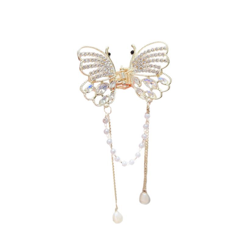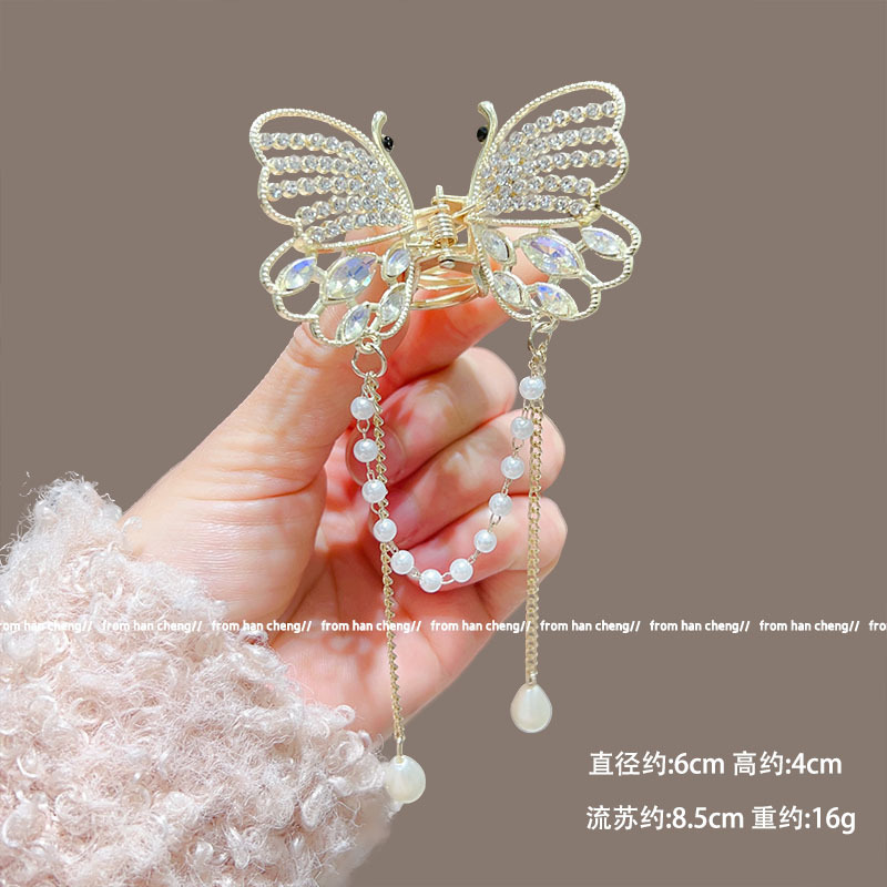 新款水晶蝴蝶珍珠流苏抓夹鲨鱼夹气质高级感半扎发夹头饰品