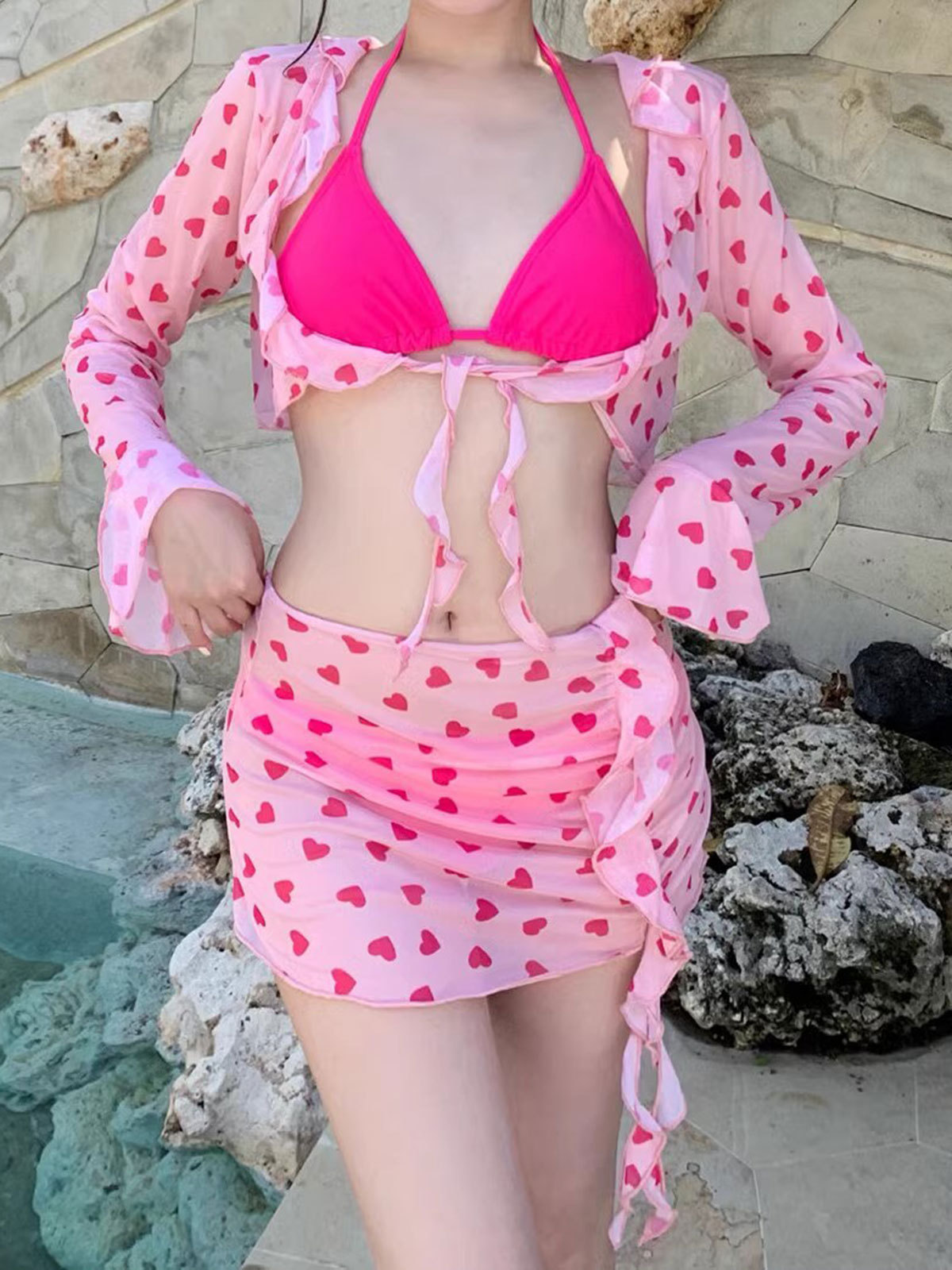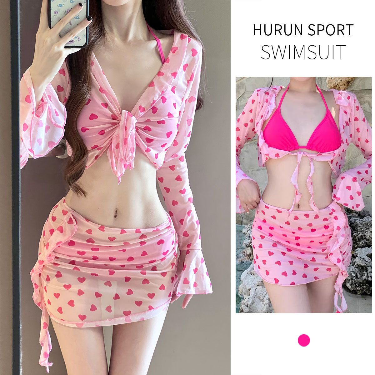 HURUN泳衣女比基尼四件套显瘦性感2024时尚学生少女度假小胸聚拢