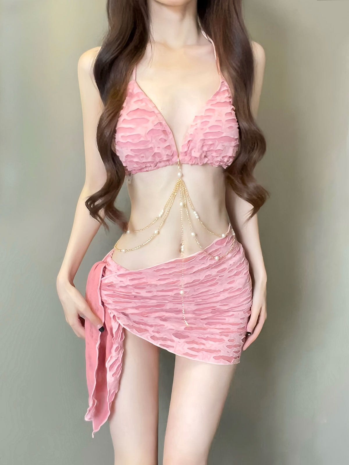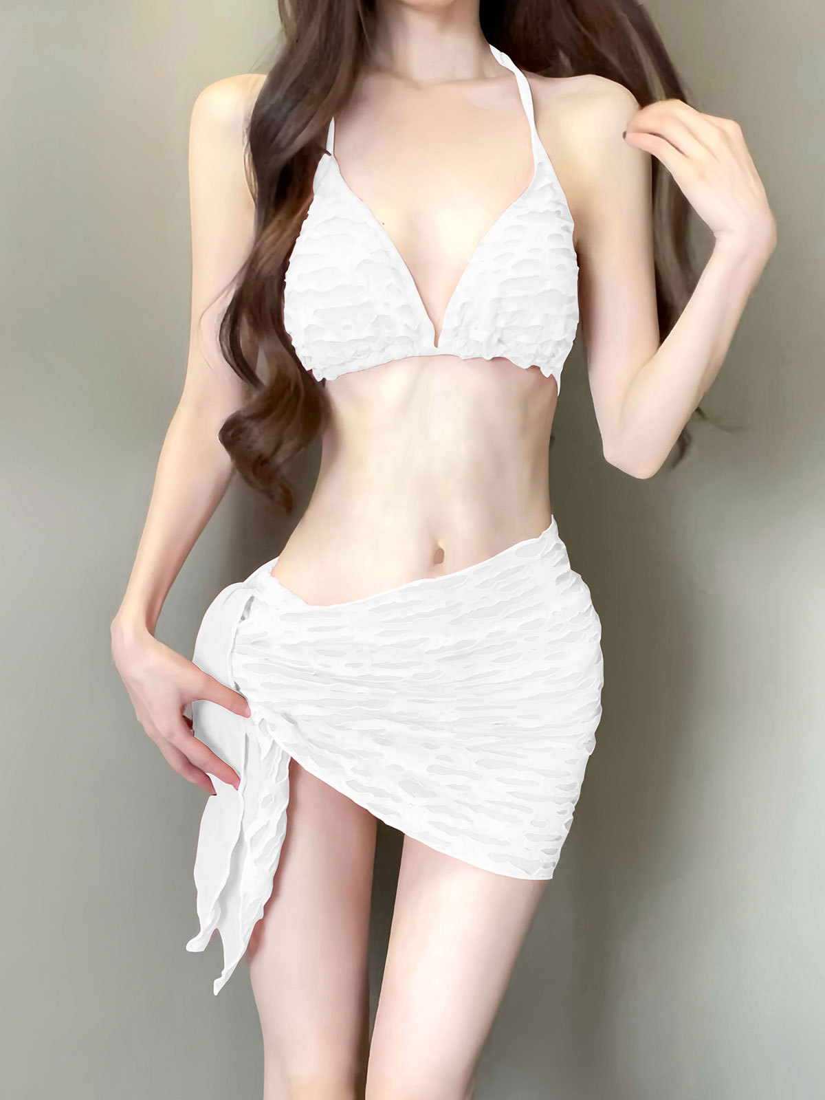 比基尼泳衣女2024新款分体三件套挂脖露背显瘦小胸聚拢性感泡温泉