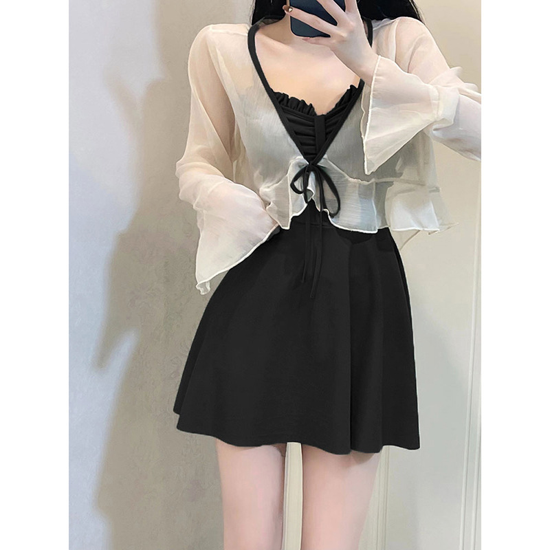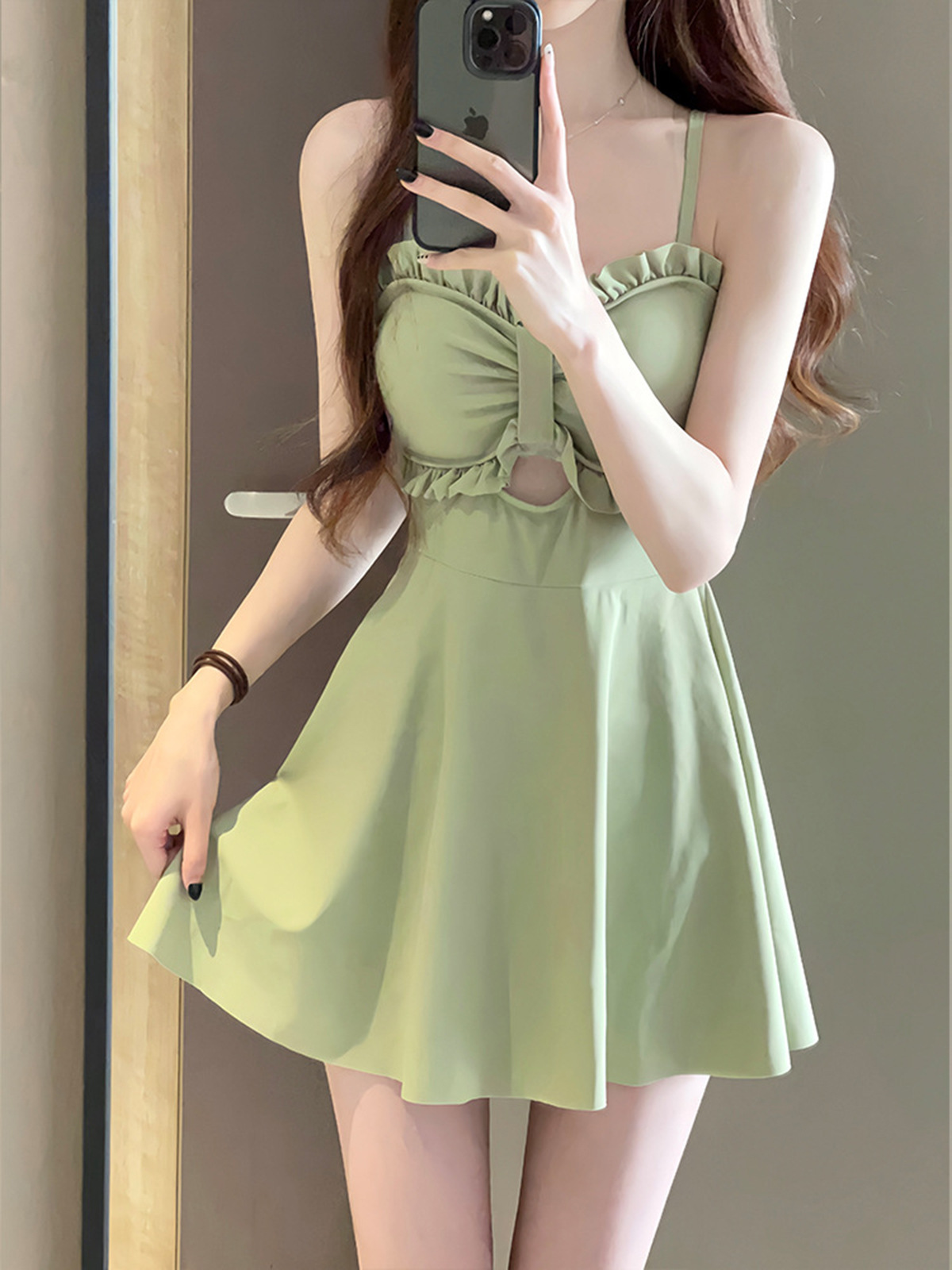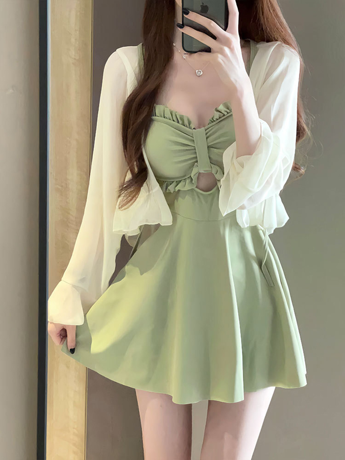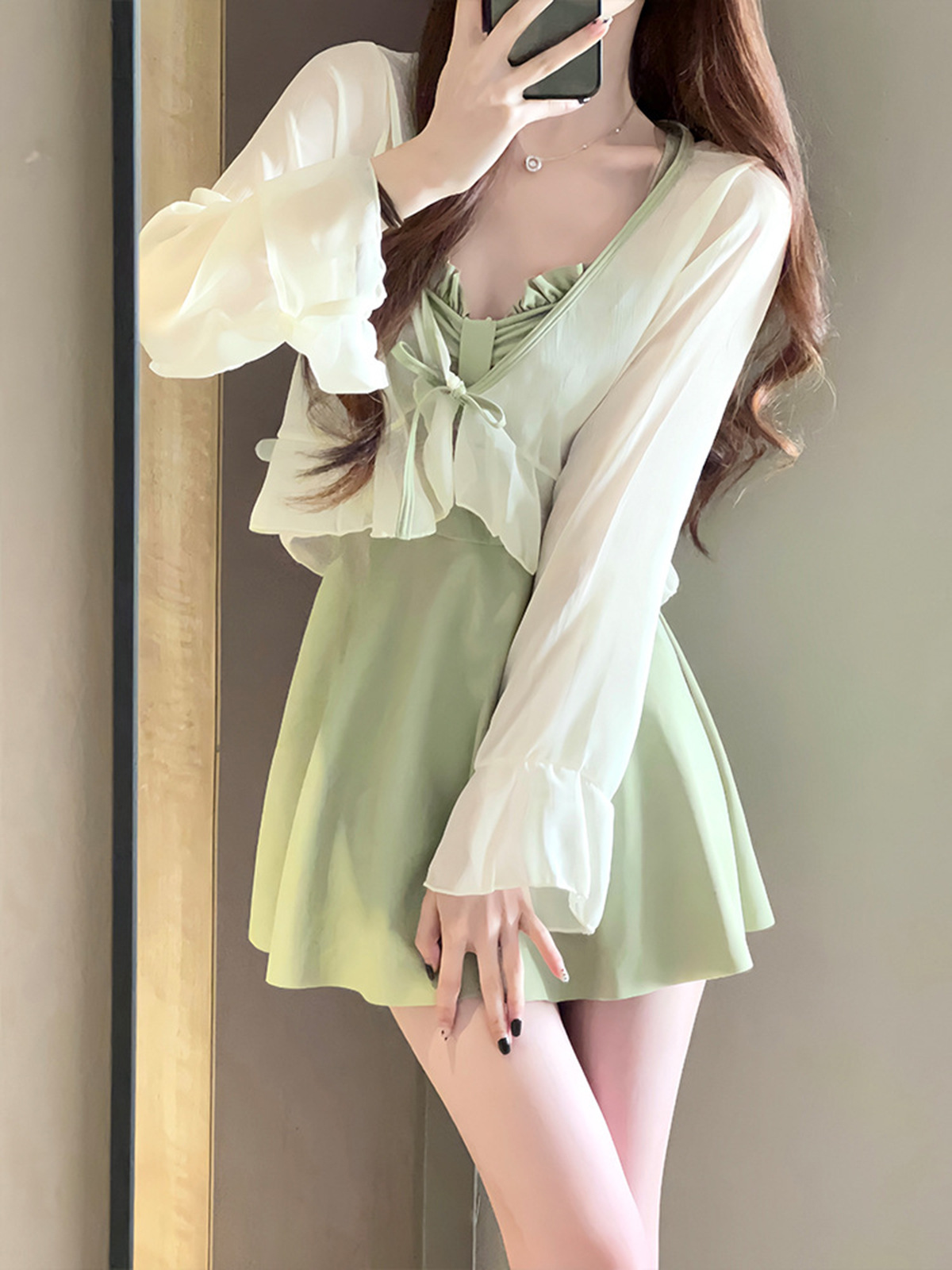 游泳衣女温泉连体保守裙式遮肚显瘦长袖罩衫海滩度假泳装运动连体