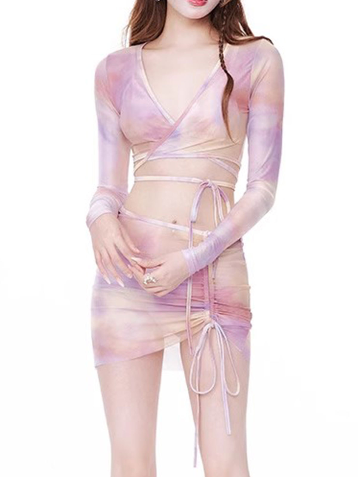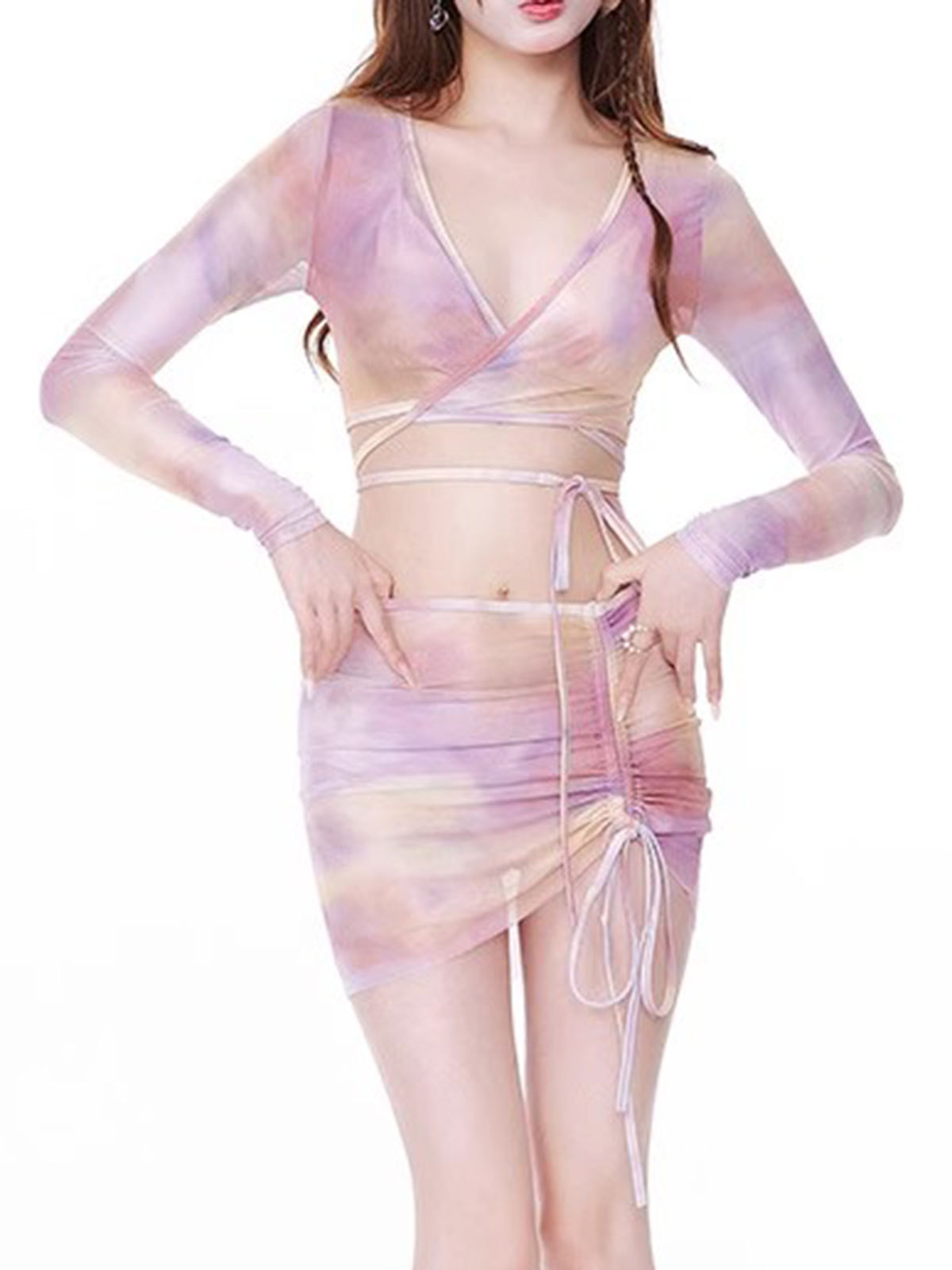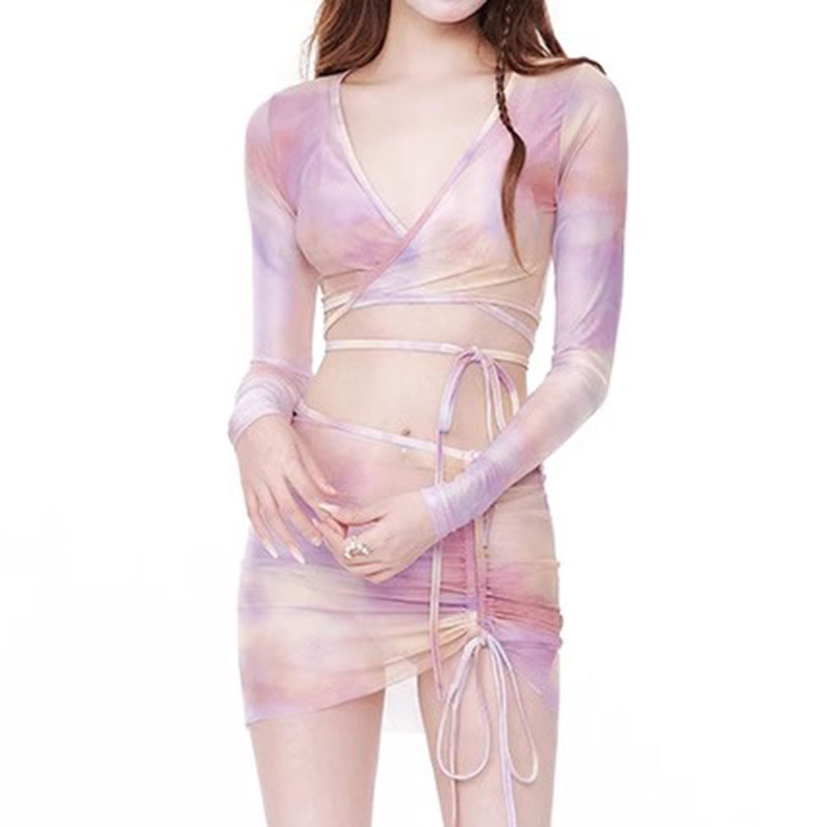 新款泳衣女夏季分体纯欲性感扎染四件套罩衫保守遮肚显瘦度假泳装