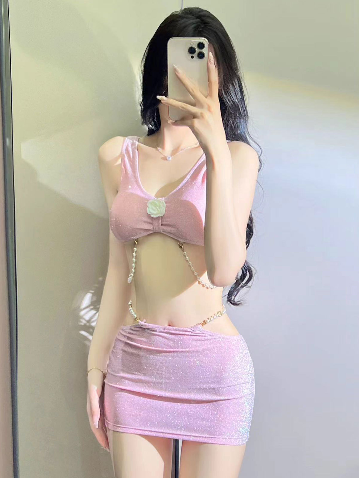 虎润新款甜辣少女粉色花朵珍珠比基尼性感三件套遮肚沙滩度假泳衣