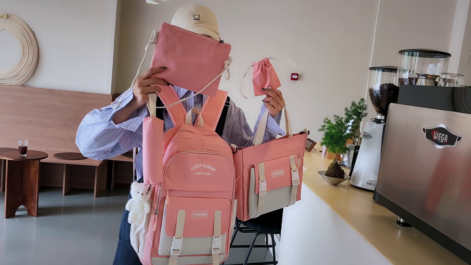 高颜值小众轻便撞色百搭五件套小学生初高中学生大学生双肩背包