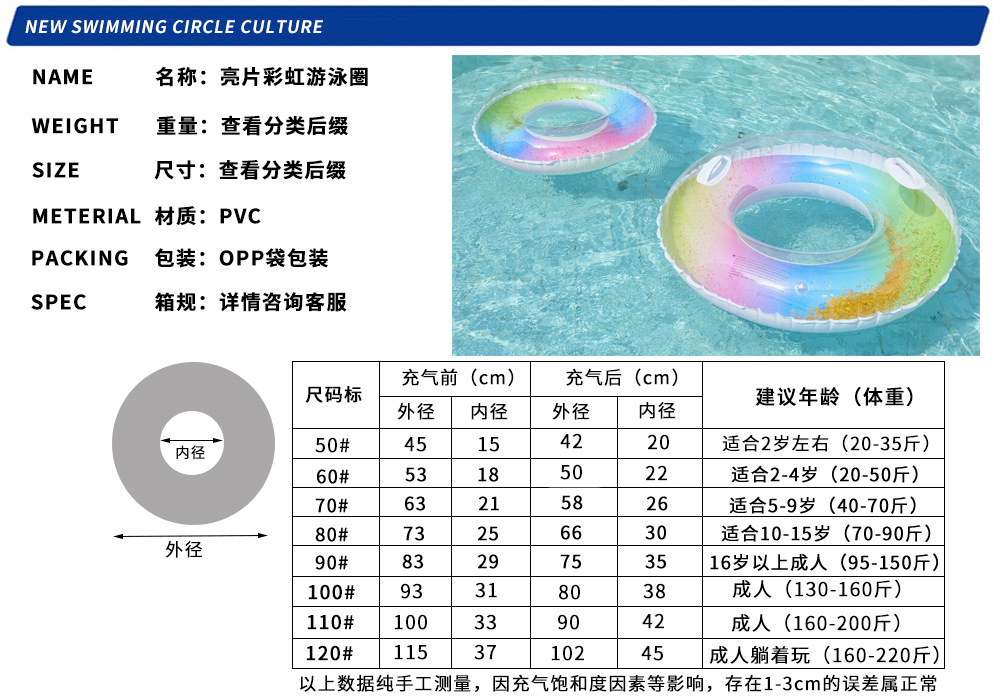 跨境直供 ins网红游泳圈亮片渐变色彩虹游泳圈 加厚半透明水圈