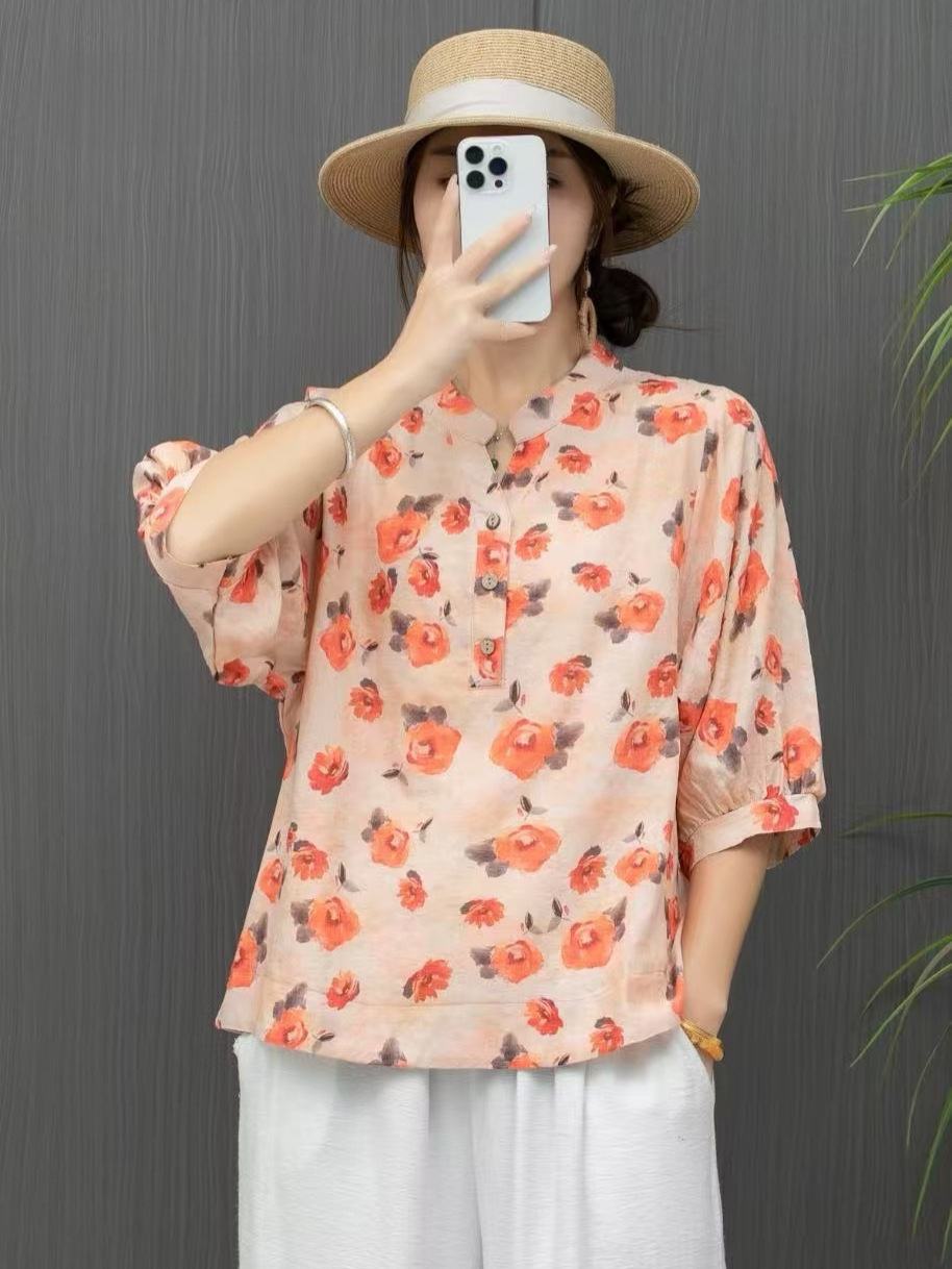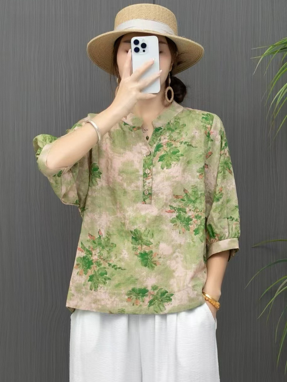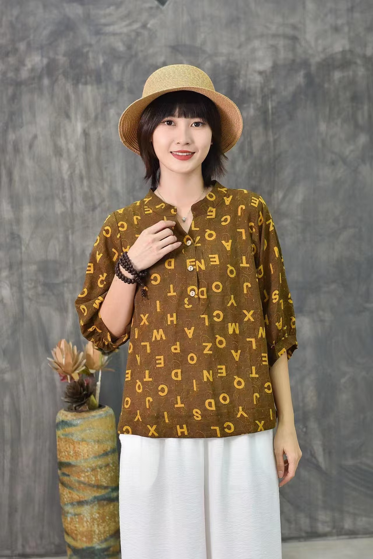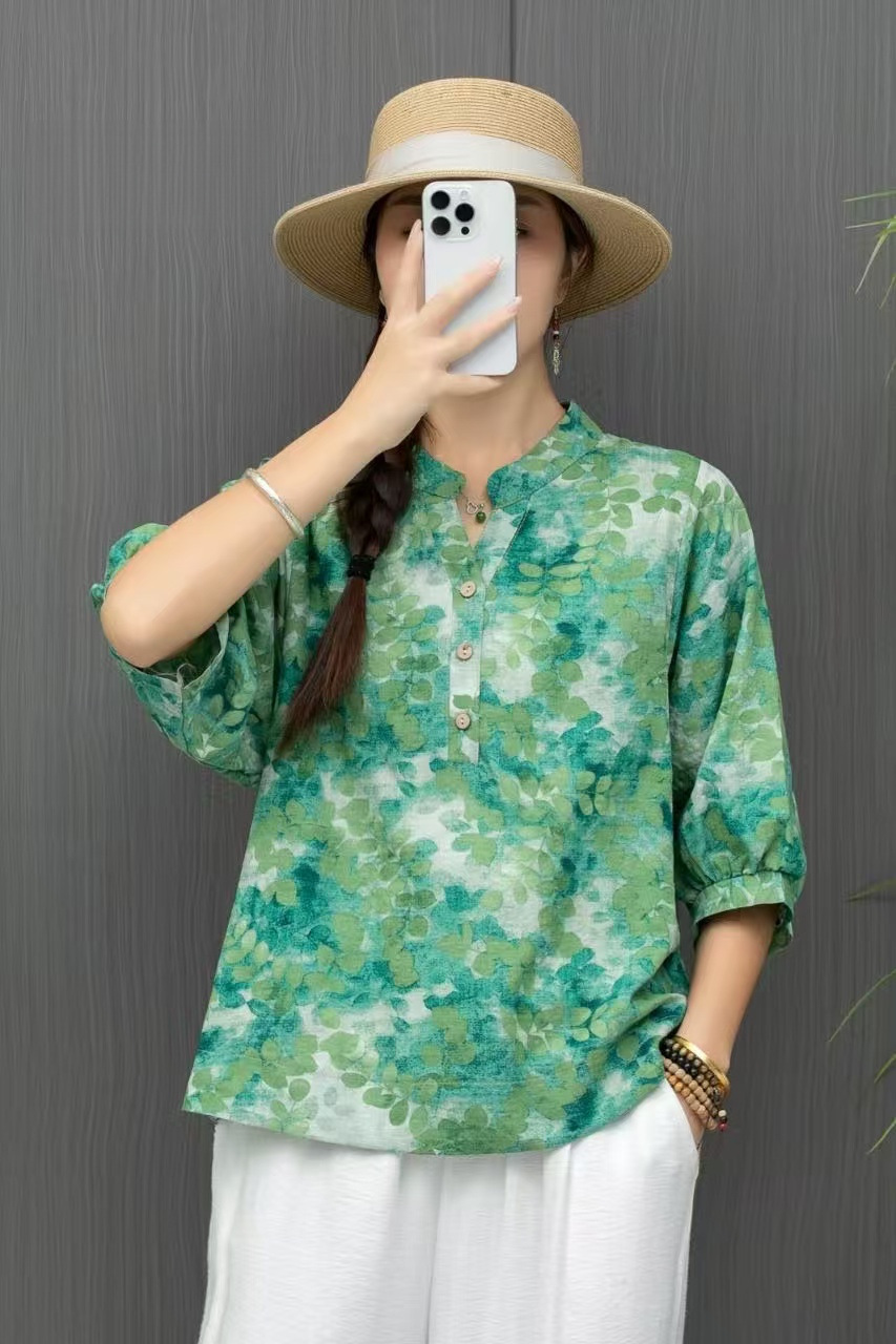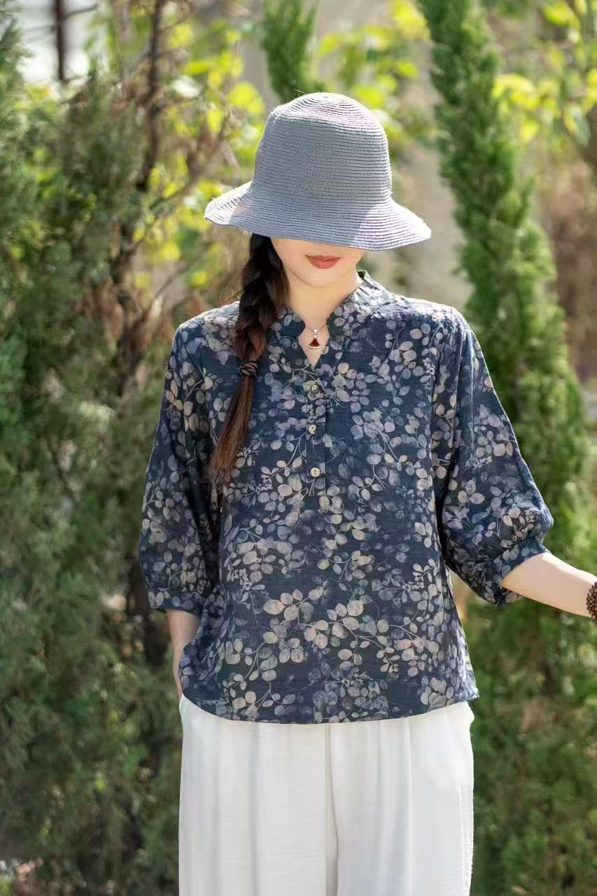 2025夏季新款棉麻碎花小衫女上衣苎麻文艺复古宽松大码妈妈装批发