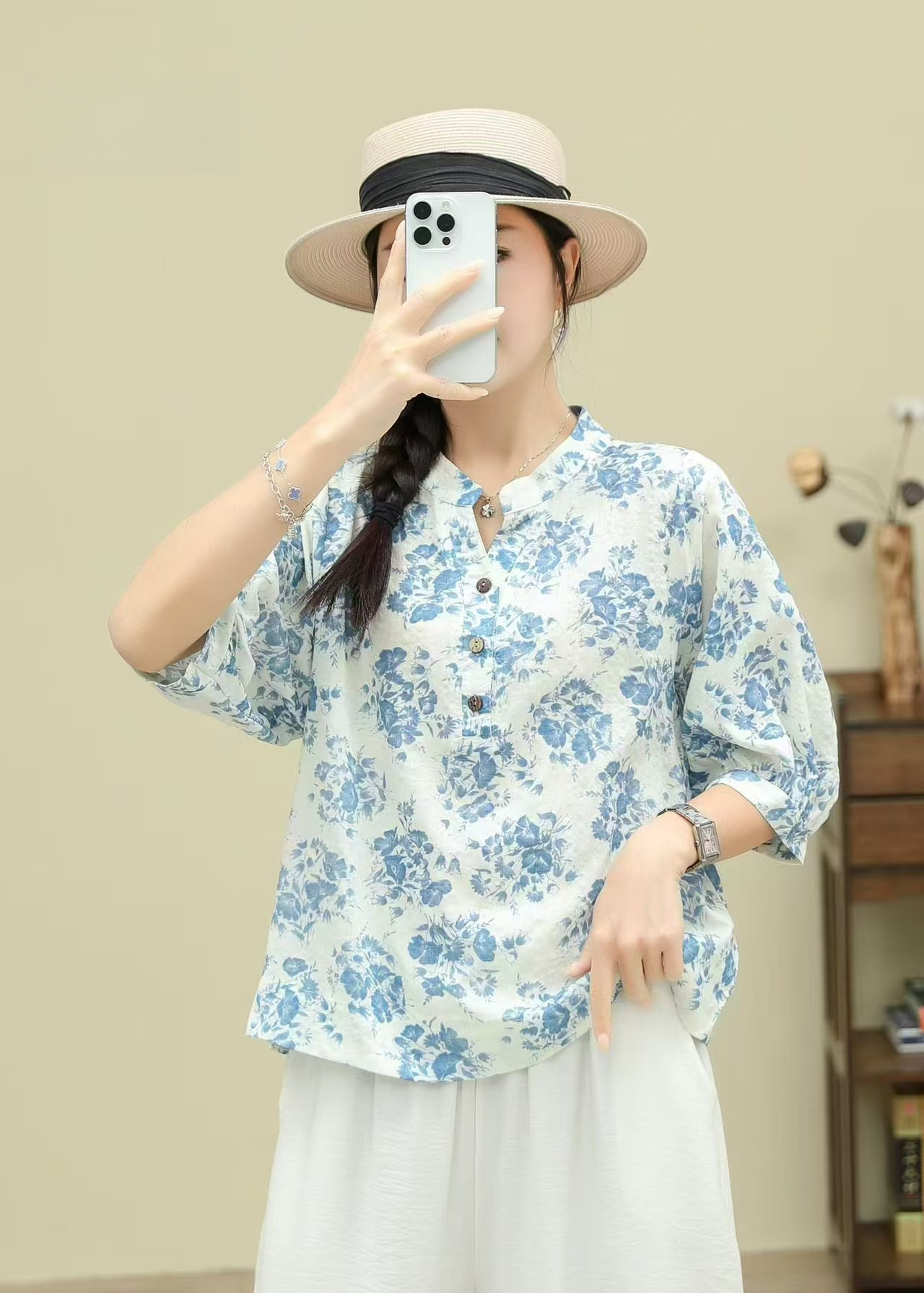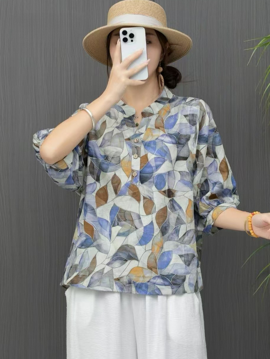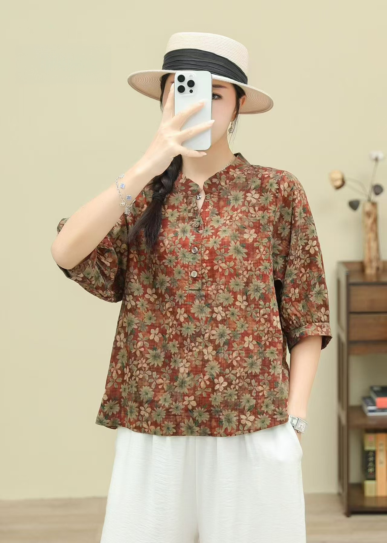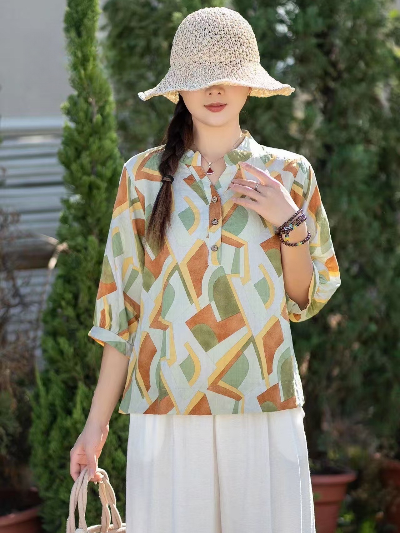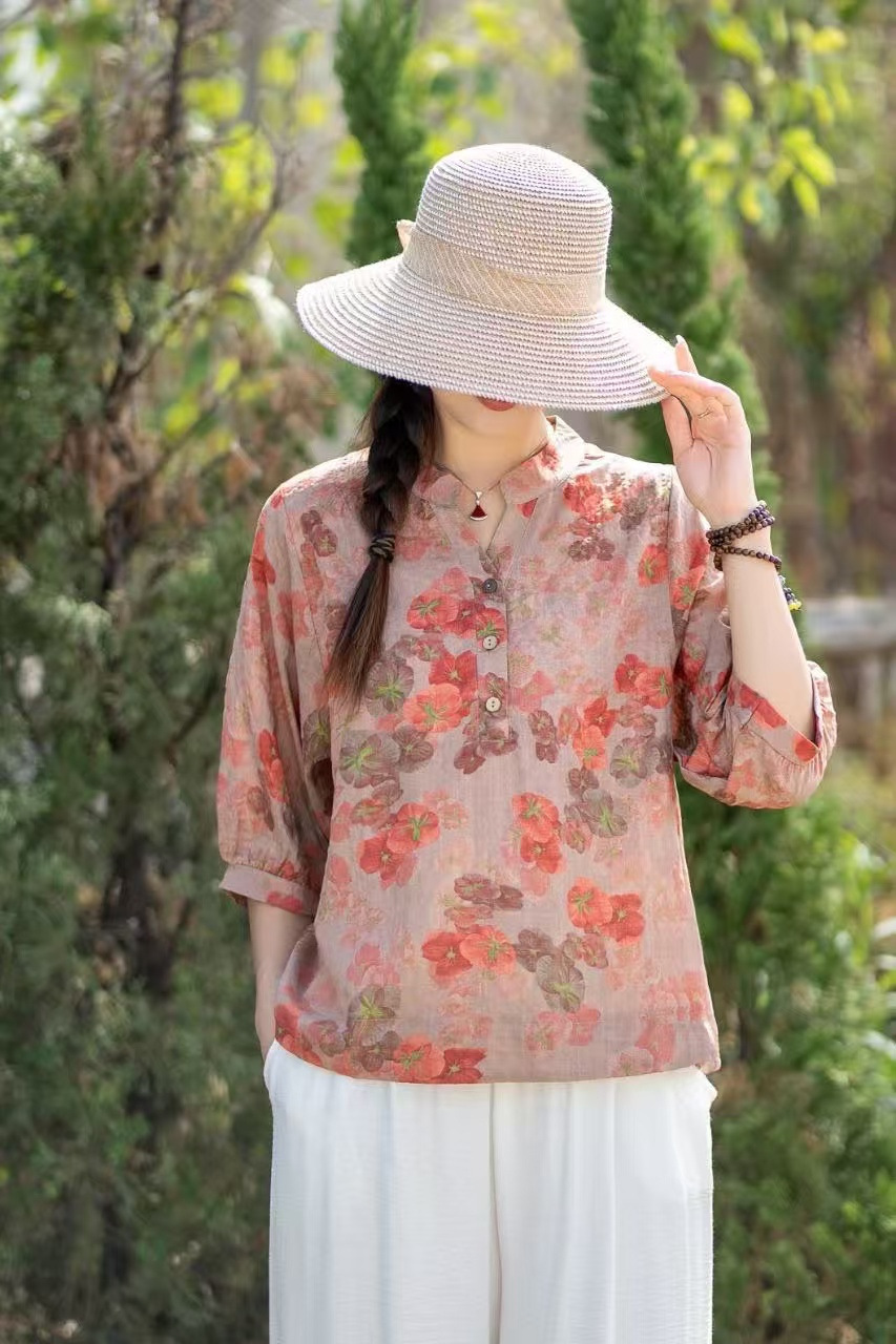 2025夏季新款棉麻碎花小衫女上衣苎麻文艺复古宽松大码妈妈装批发