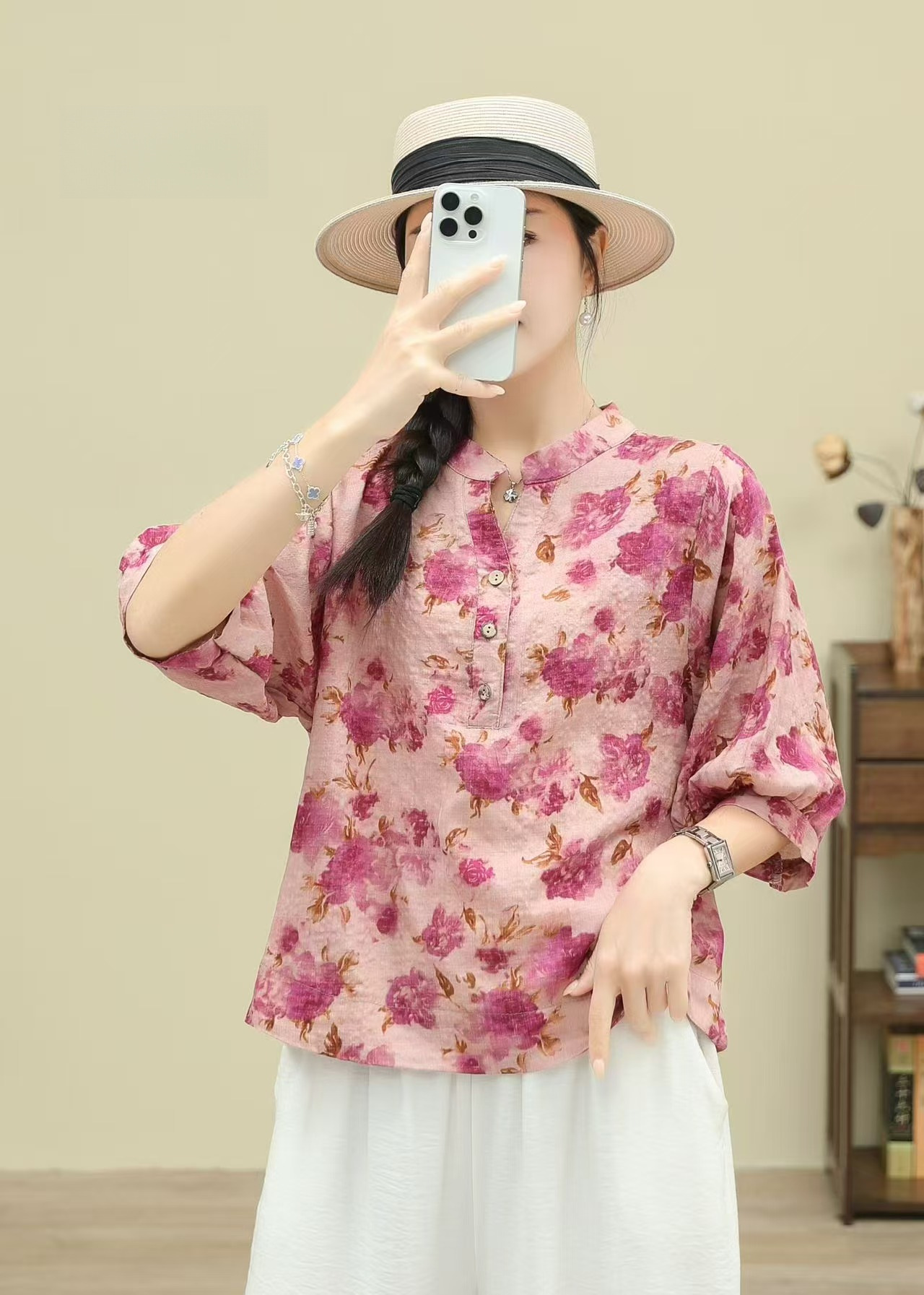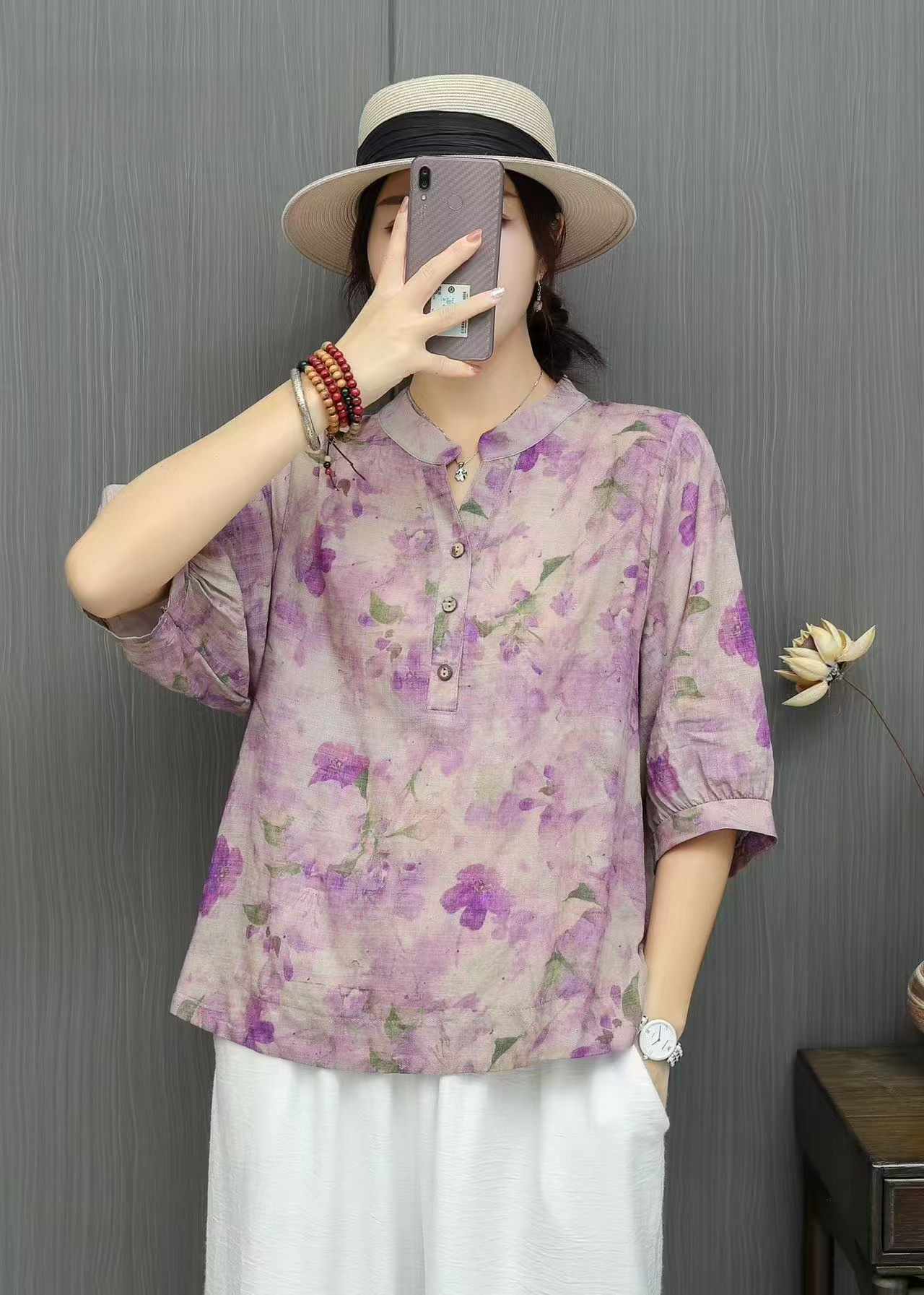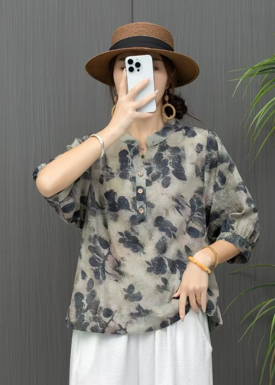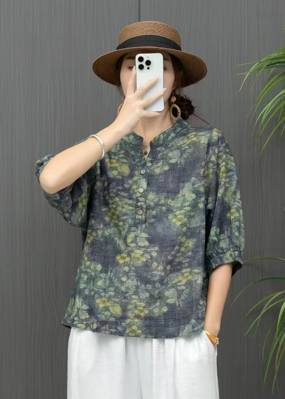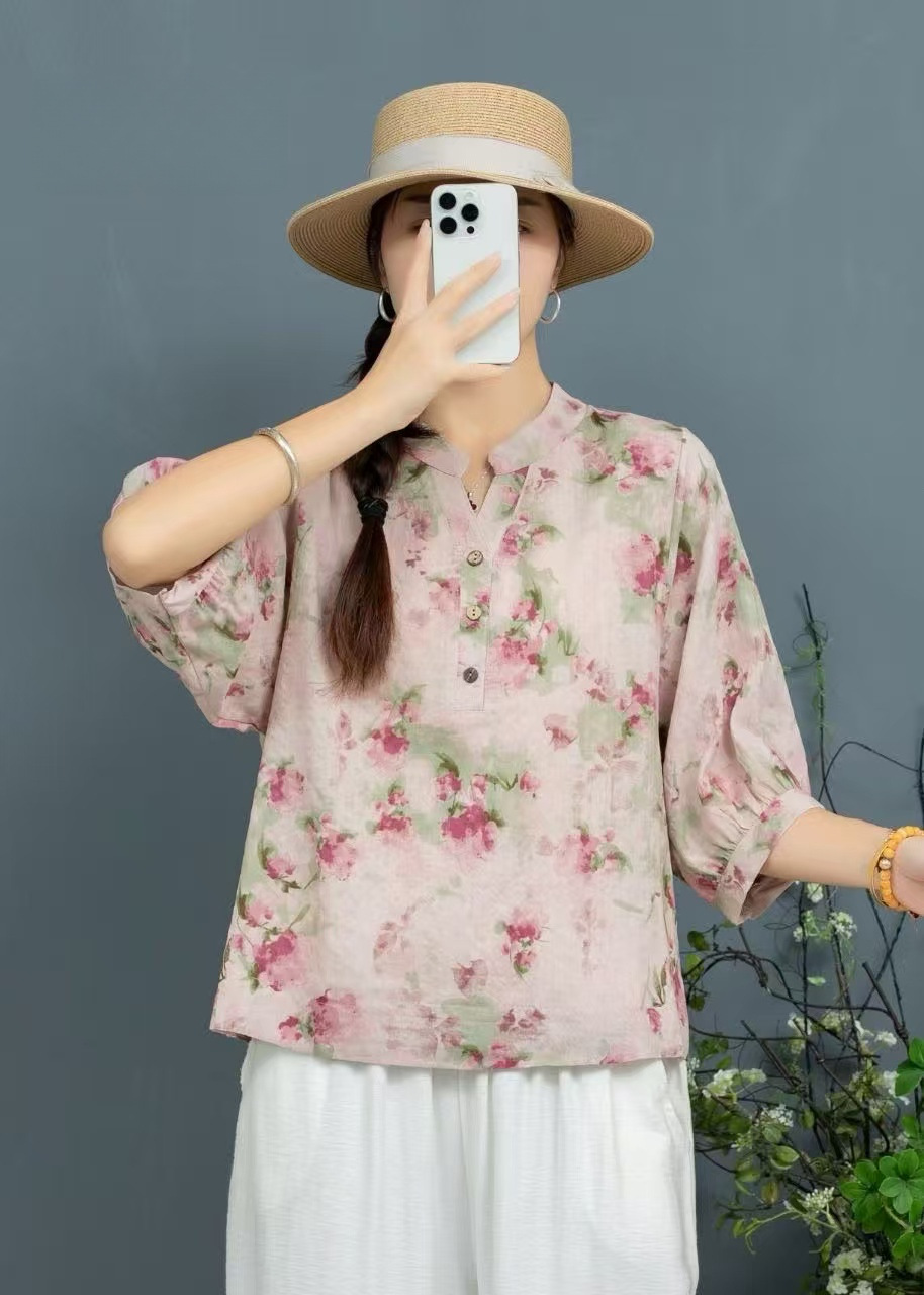 2025夏季新款棉麻碎花小衫女上衣苎麻文艺复古宽松大码妈妈装批发