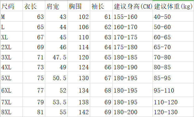 | 6xl (about 100.00 kg-105.00 kg)(6XL(200-210斤左右)) | USD $0.0 | 8888 piece available |
