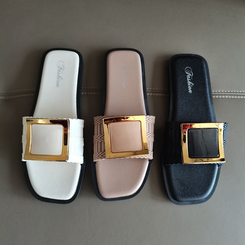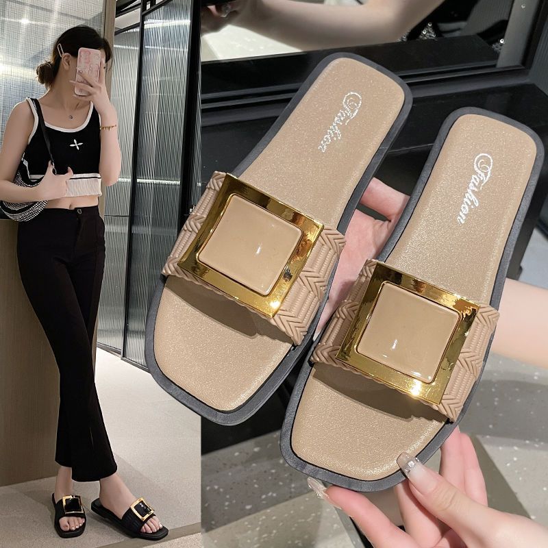 新款方扣拖鞋女夏季外穿软底家用防滑学生时尚平底一字拖跨境外贸