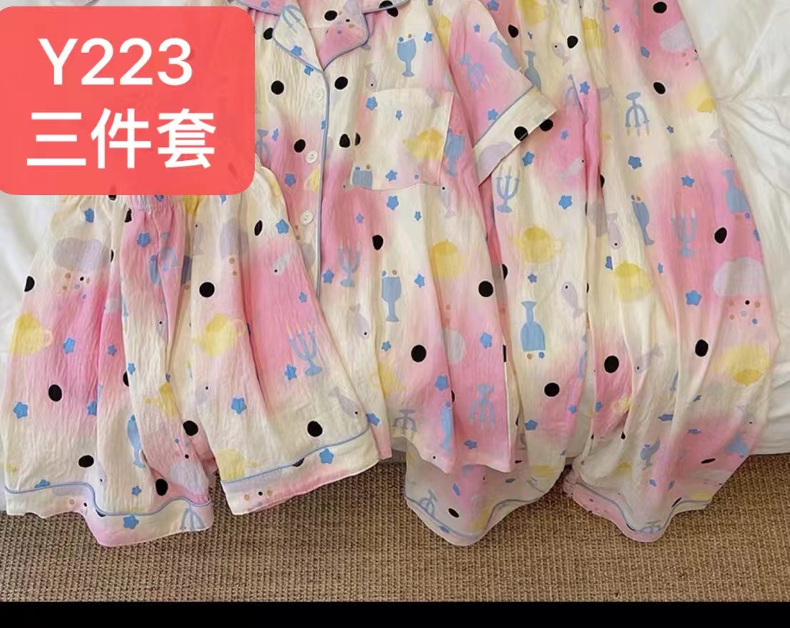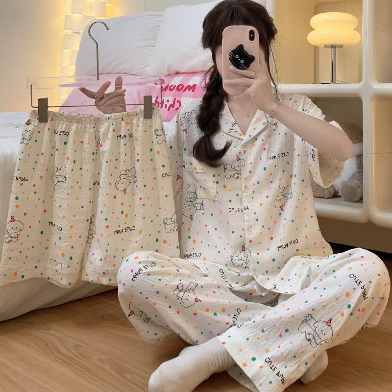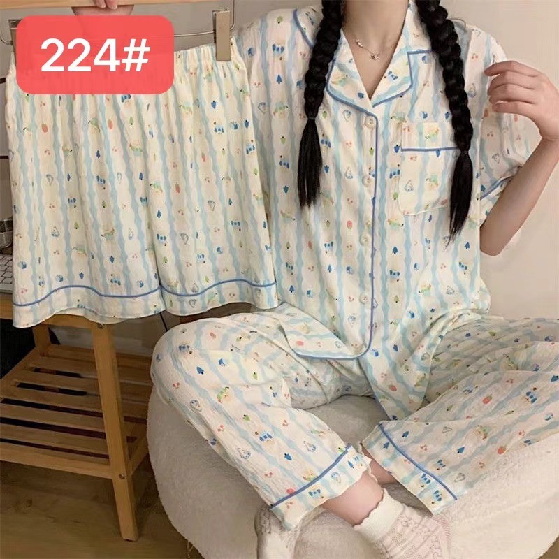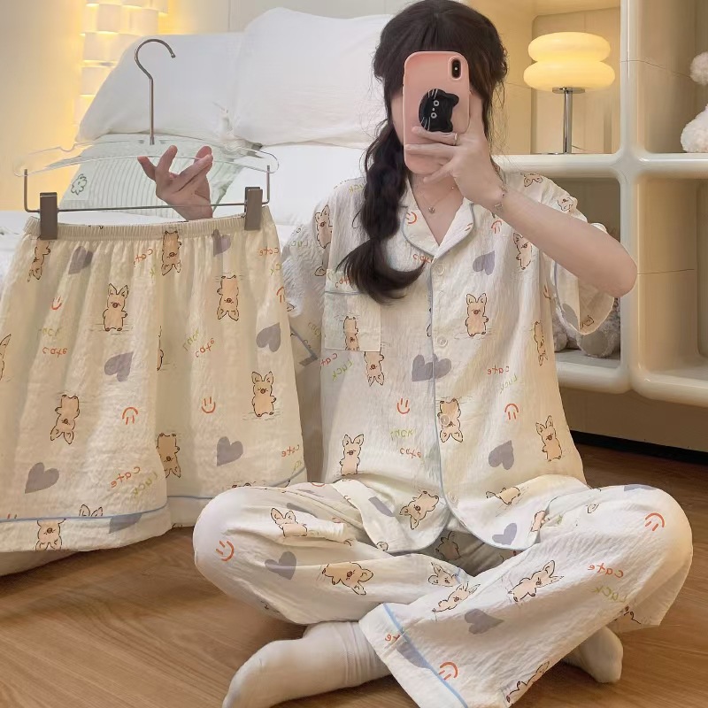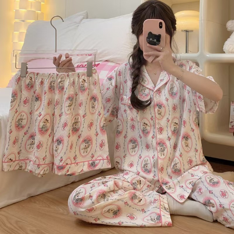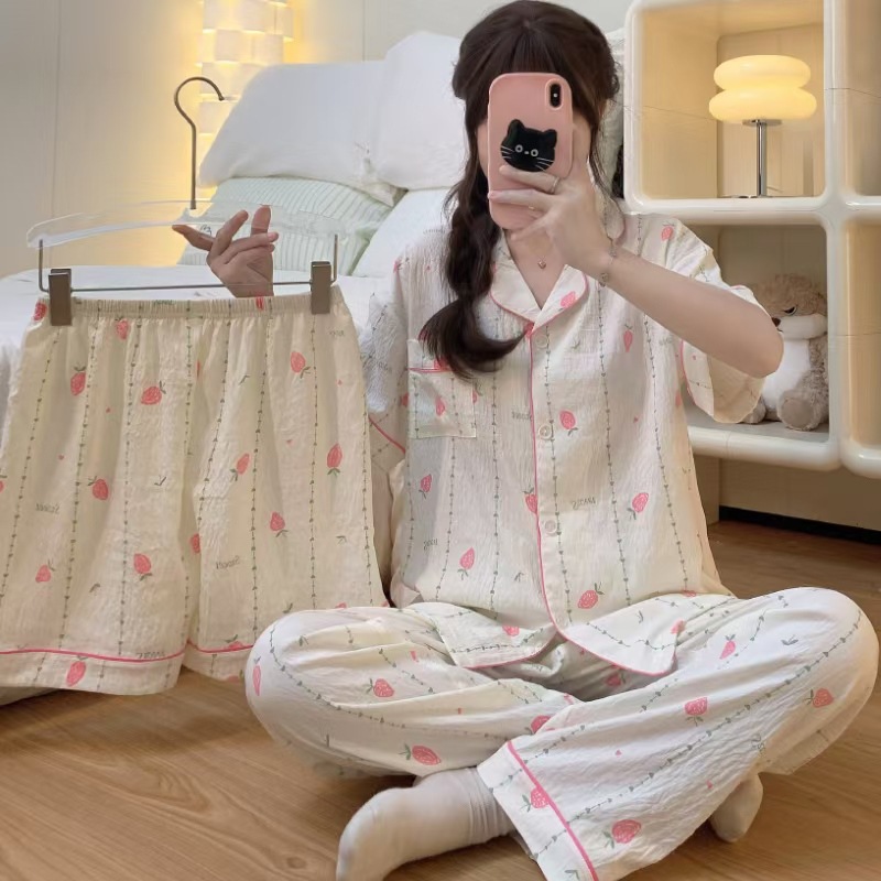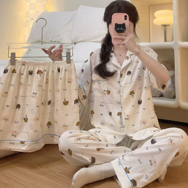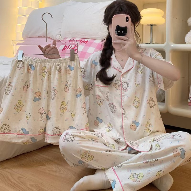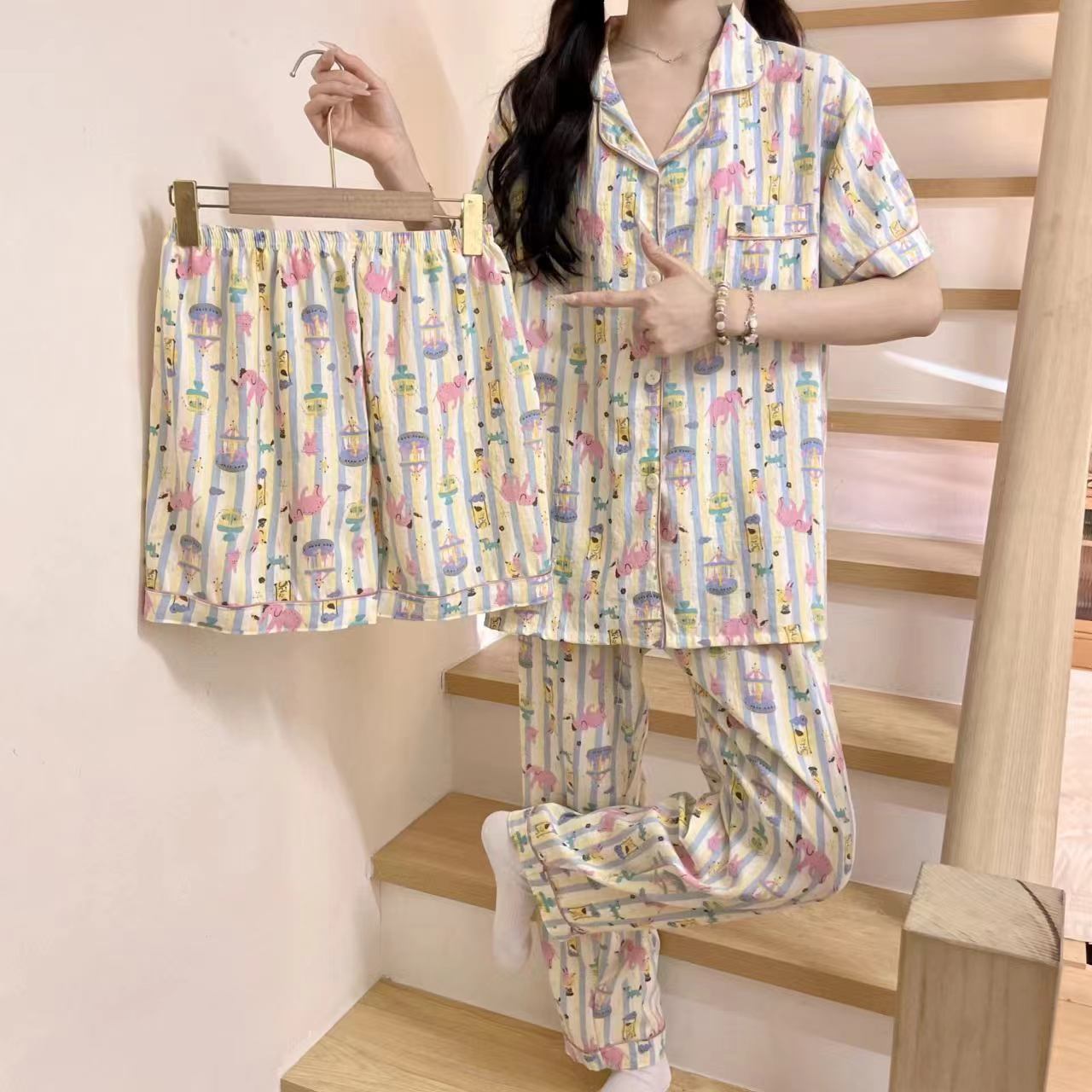 新款云朵棉睡衣女开衫夏季2024新款短袖短裤三件套薄款家居服