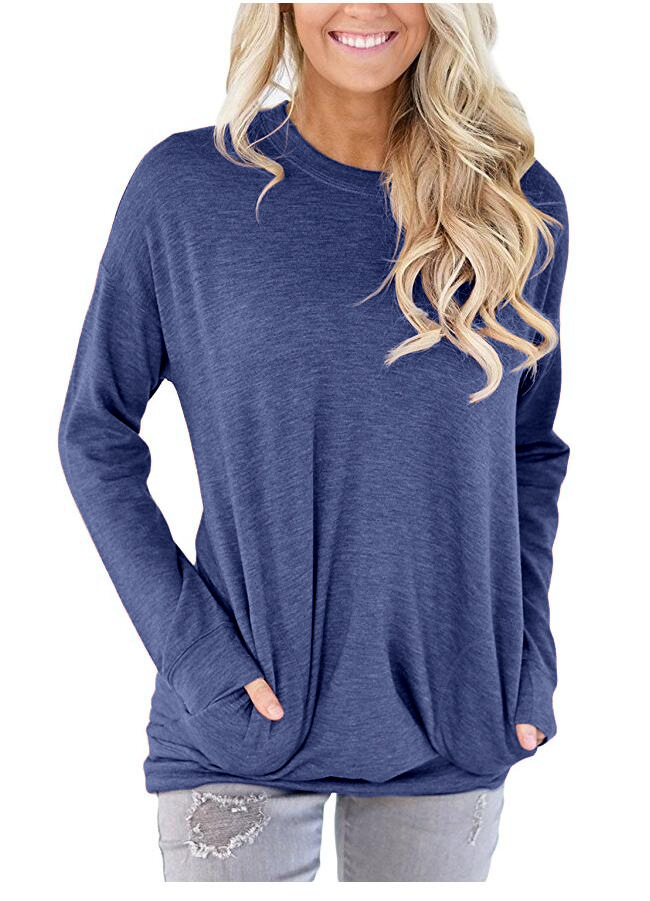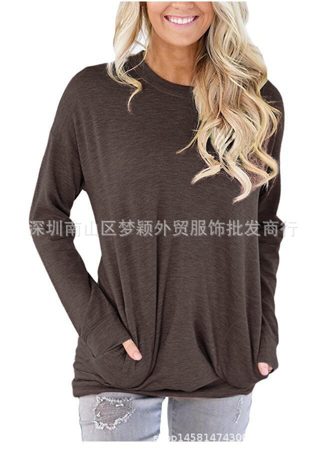 亚马逊独立站爆款跨境欧美外贸秋季新款圆领蝙蝠长袖口袋装饰T恤