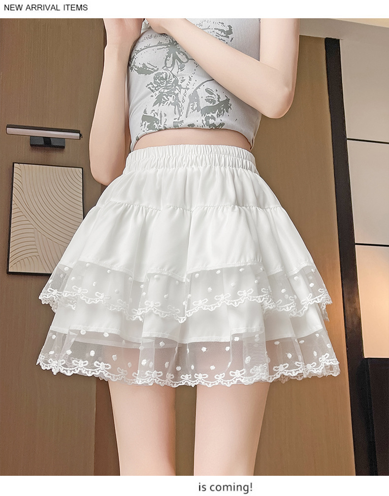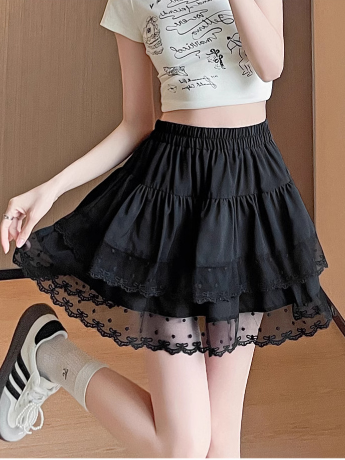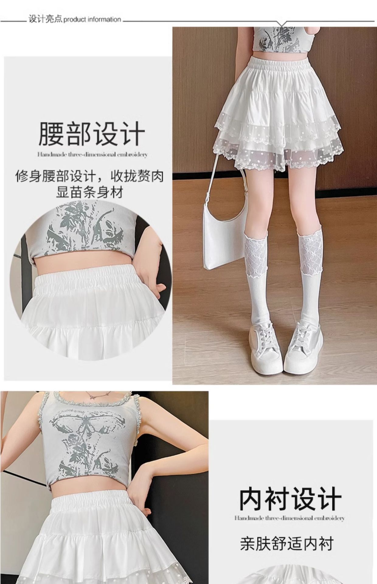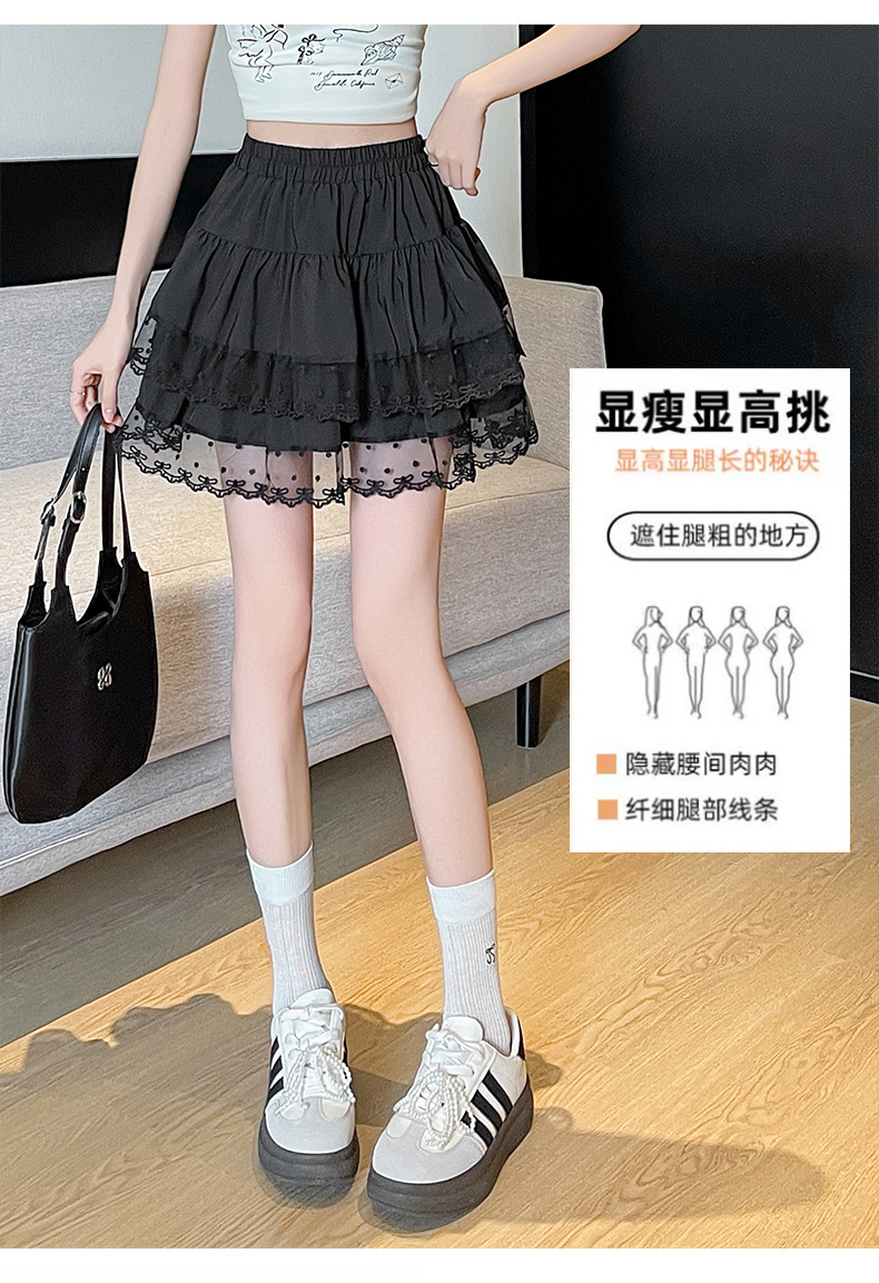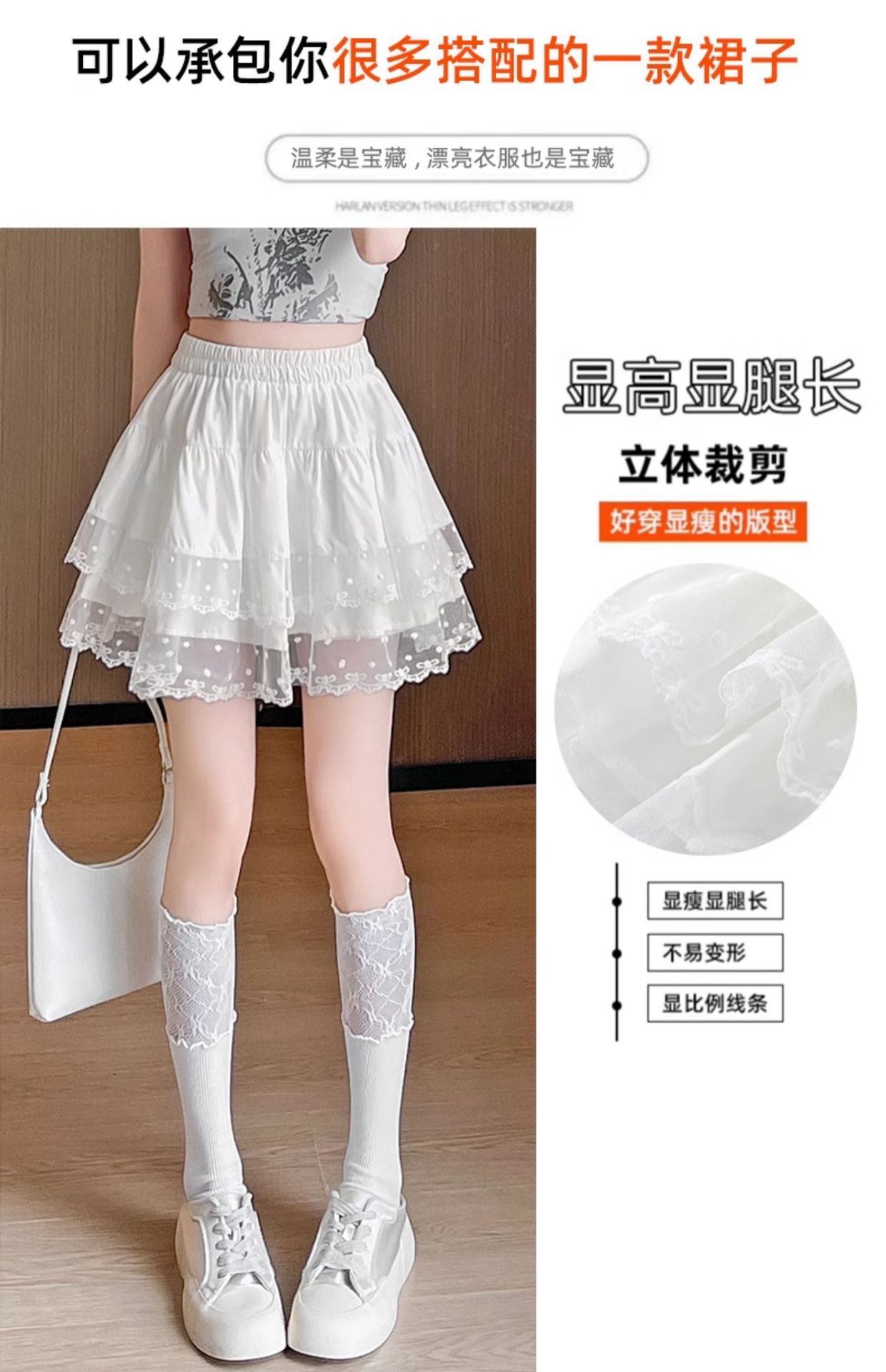 2025年夏季甜美松紧腰褶皱荷叶边短裙蕾丝花边拼接蛋糕半身裙ins
