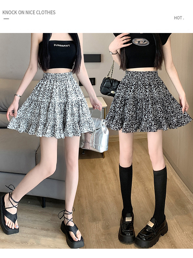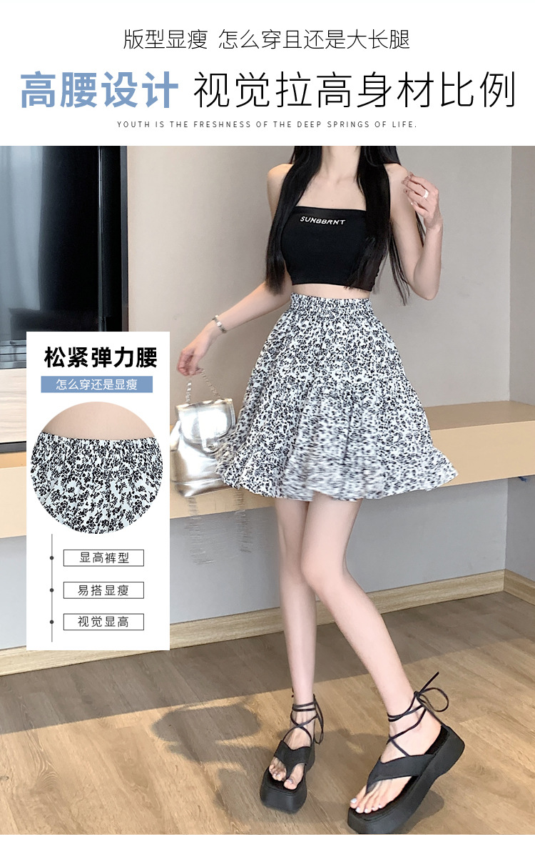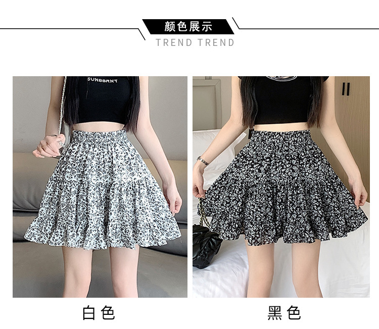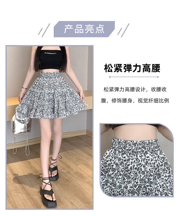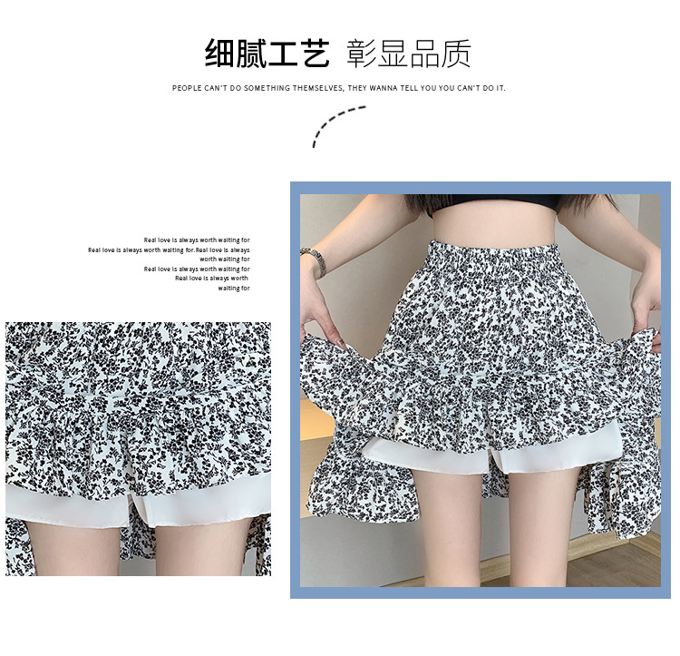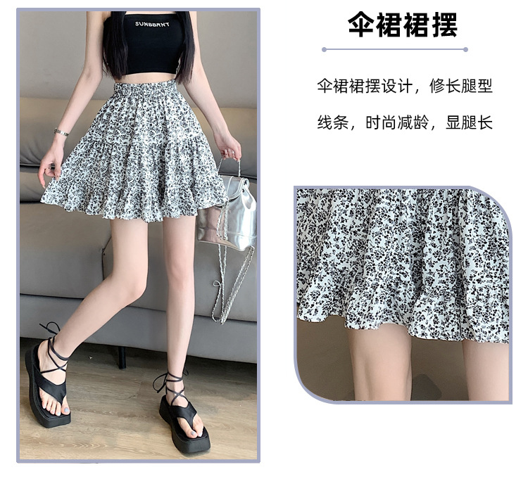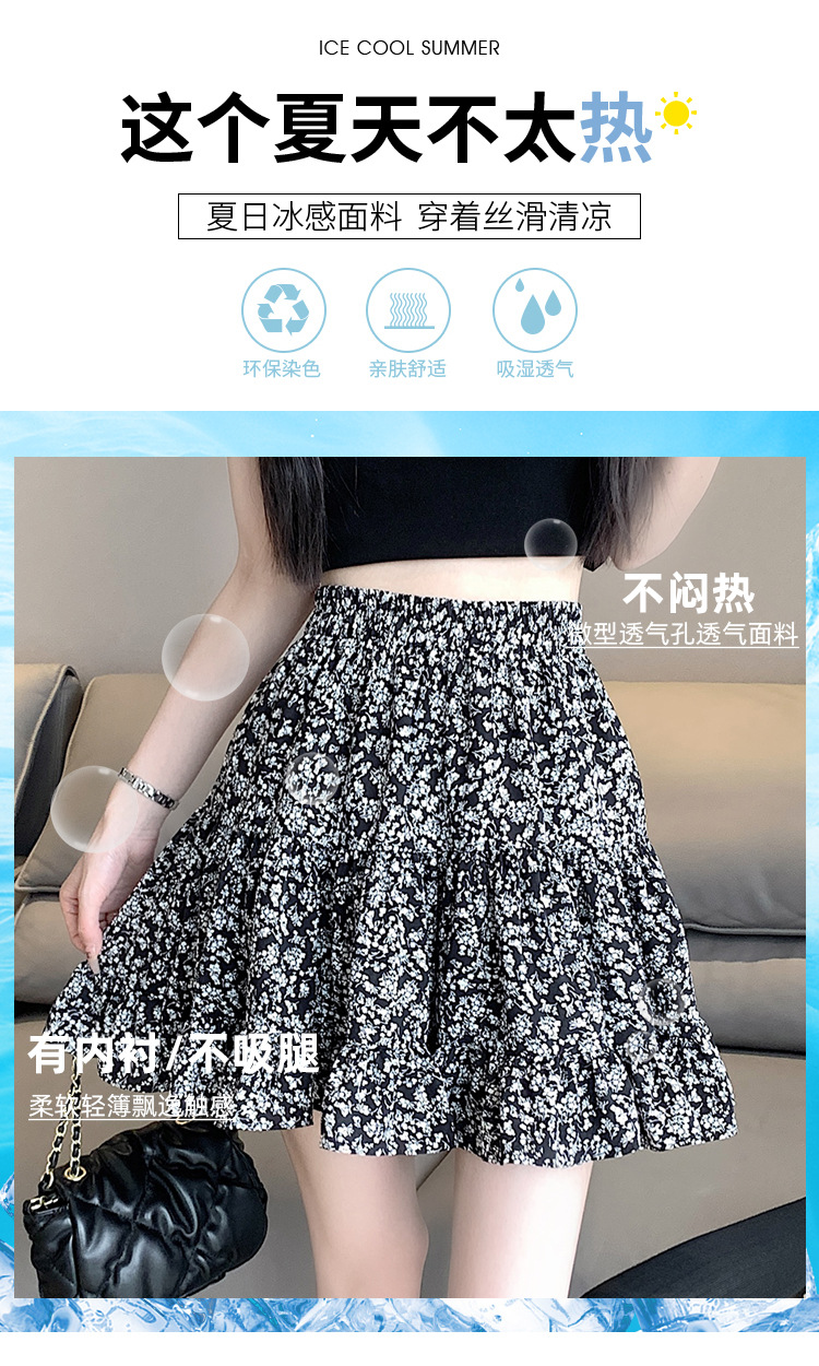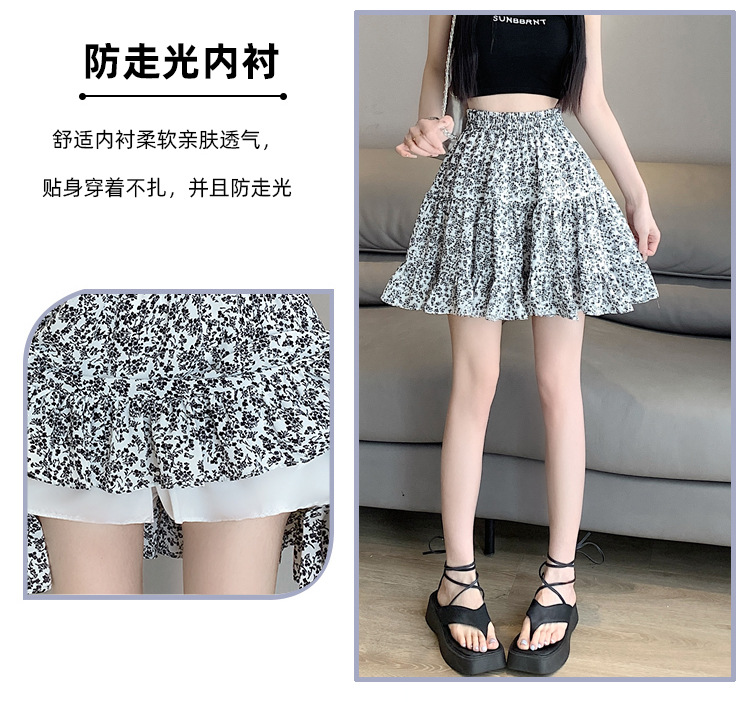 雪纺碎花半身裙女夏季2024新款防走光松紧高腰a字蓬蓬百褶短裙裤