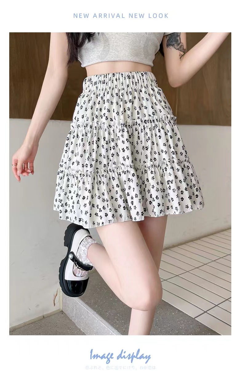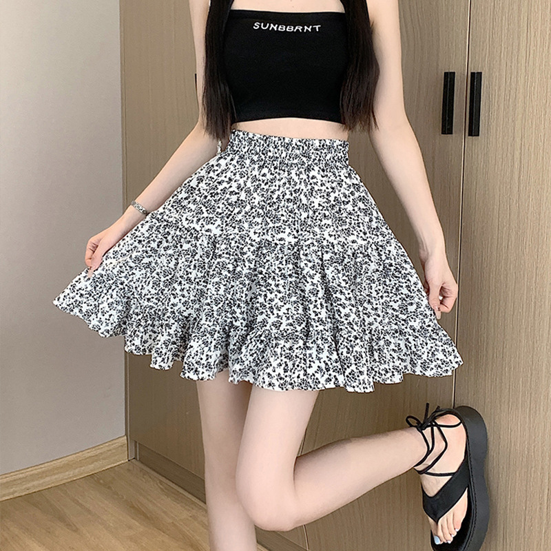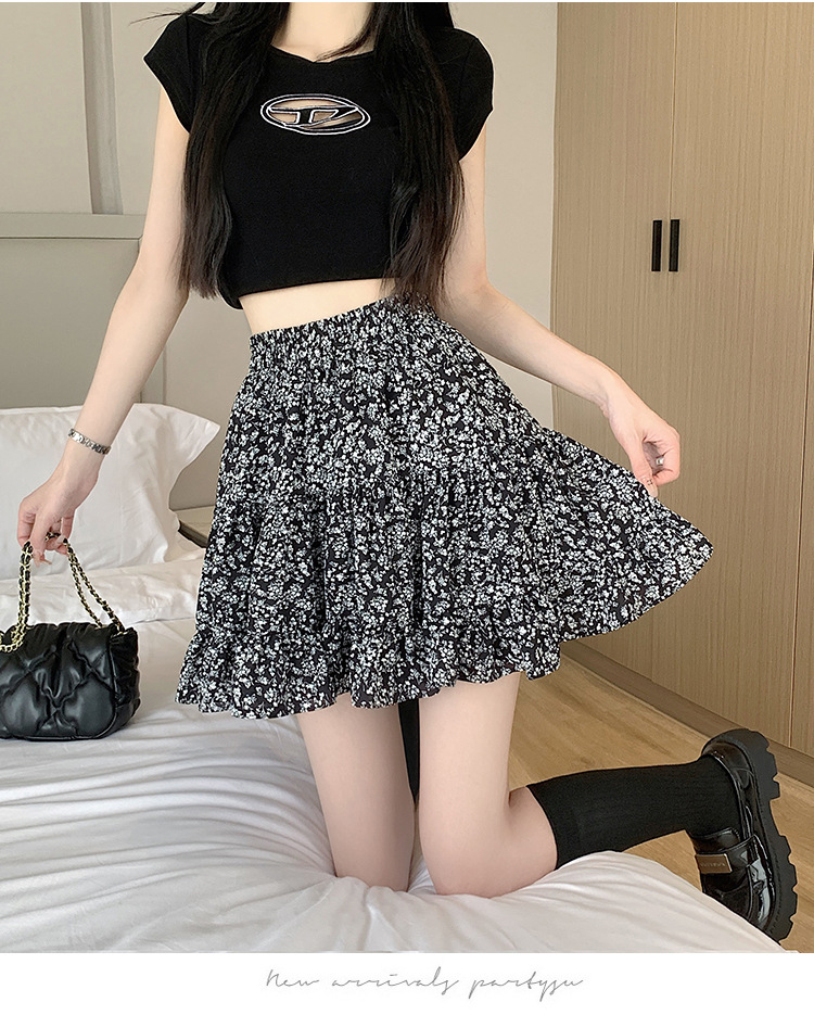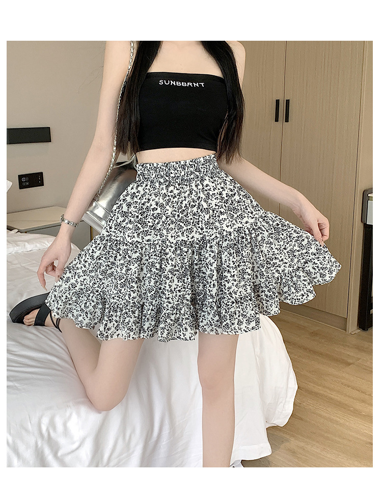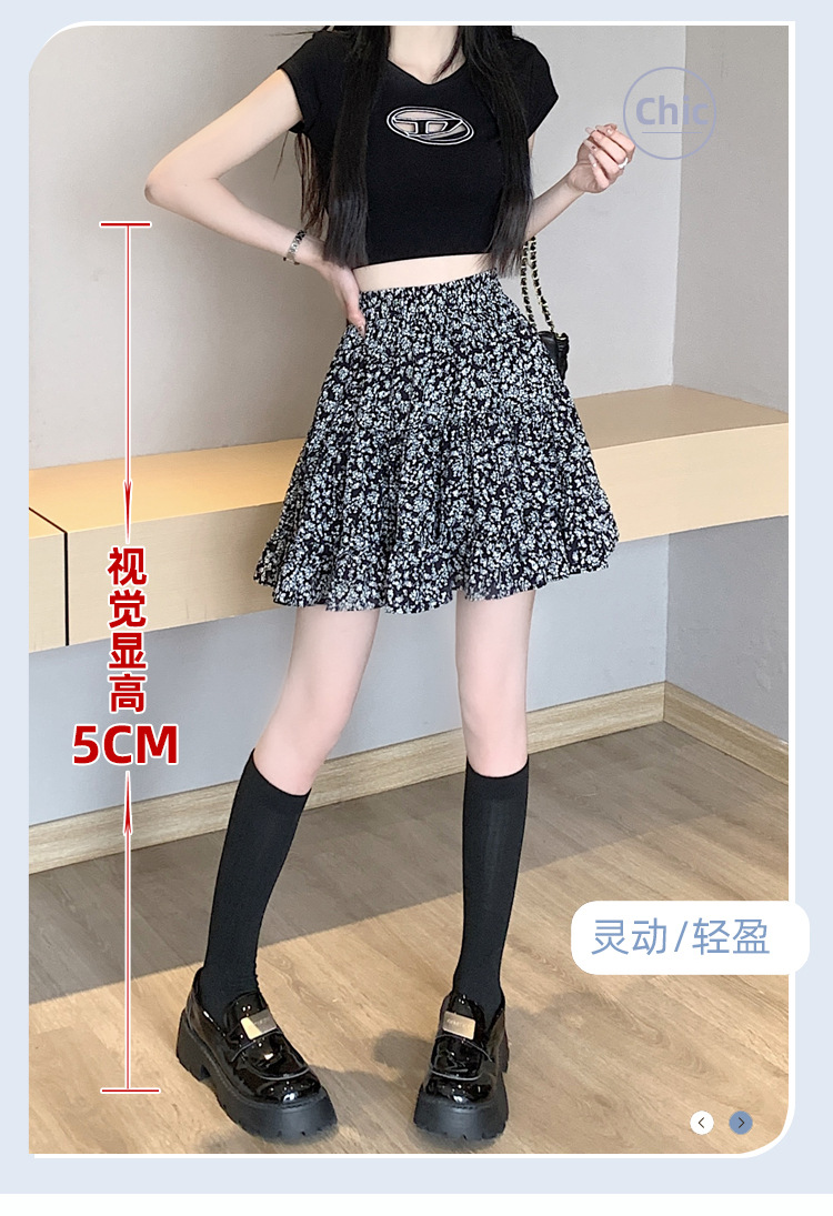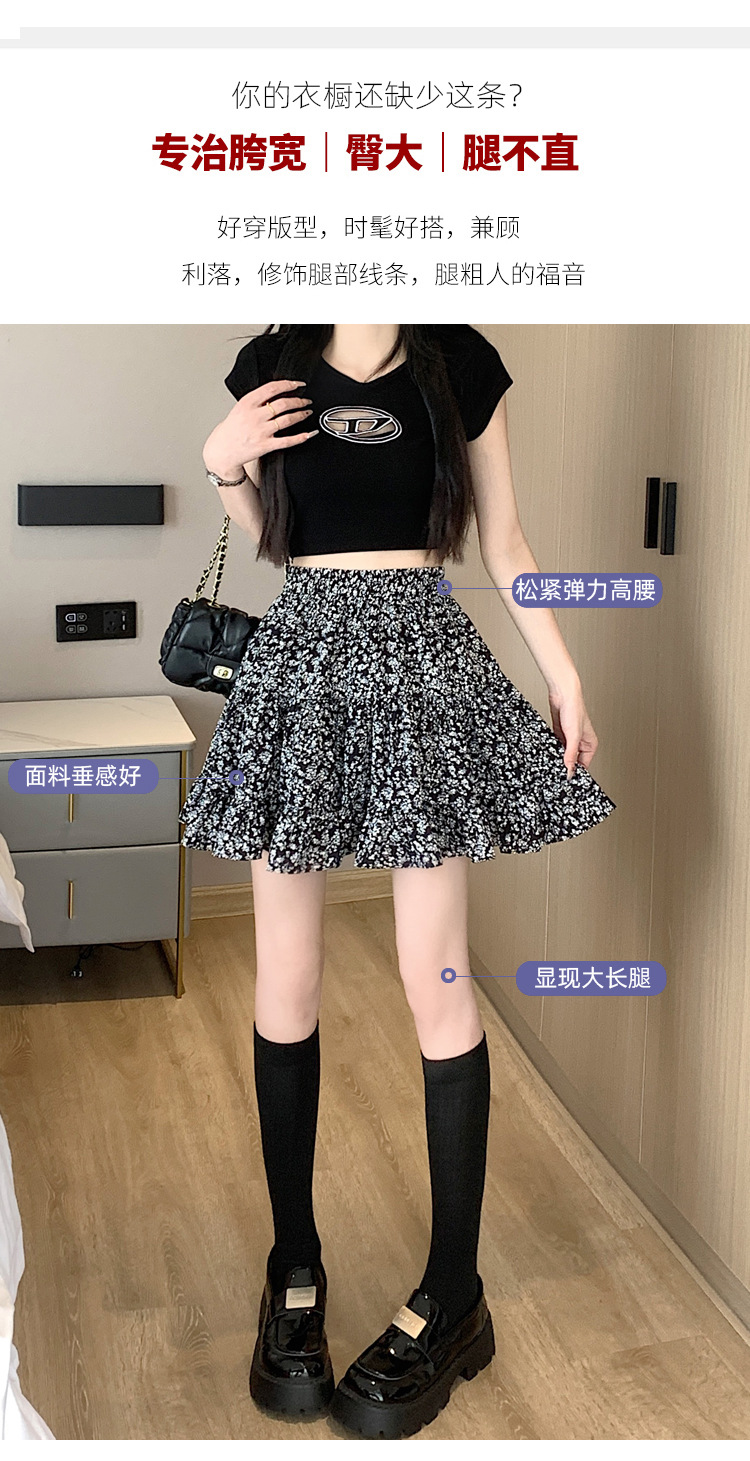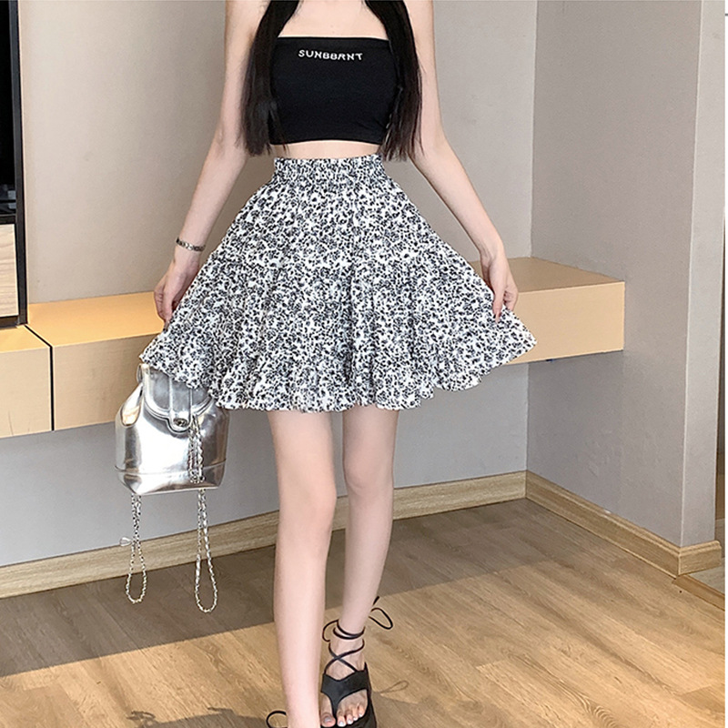 雪纺碎花半身裙女夏季2024新款防走光松紧高腰a字蓬蓬百褶短裙裤