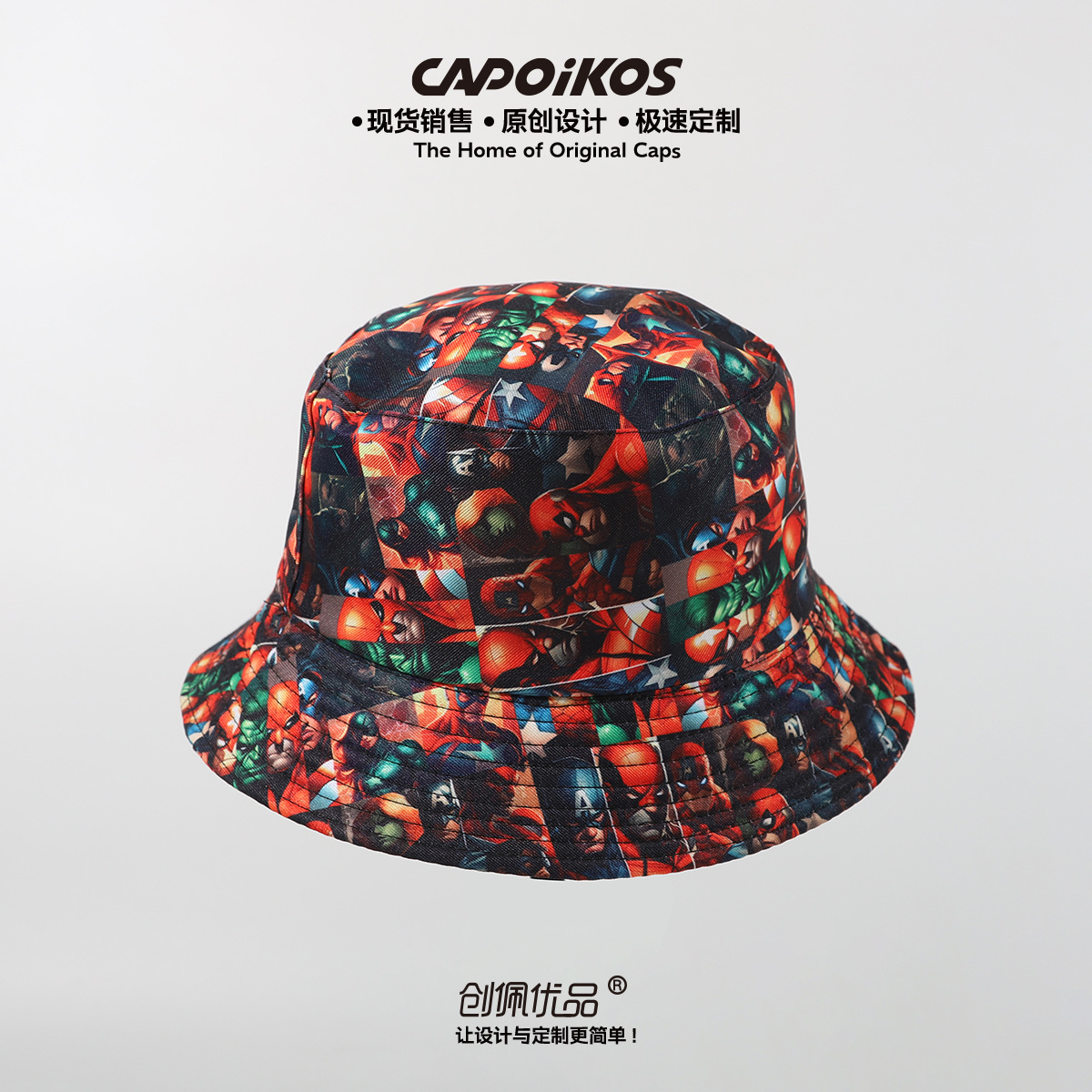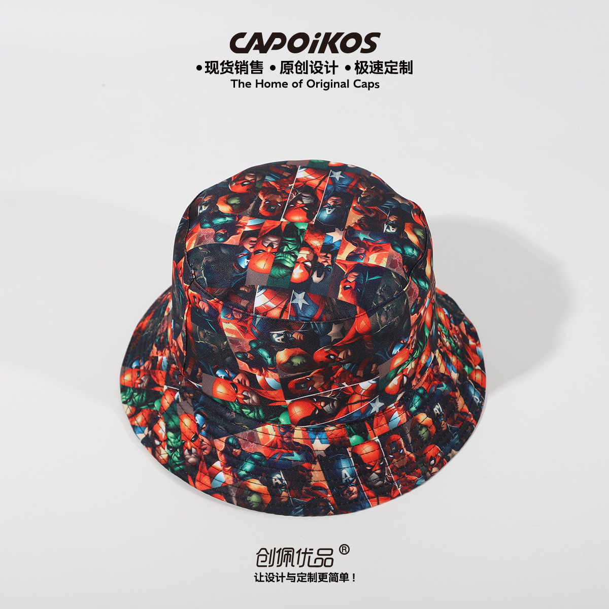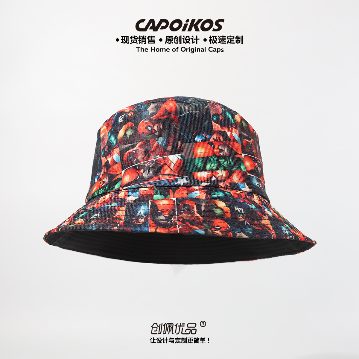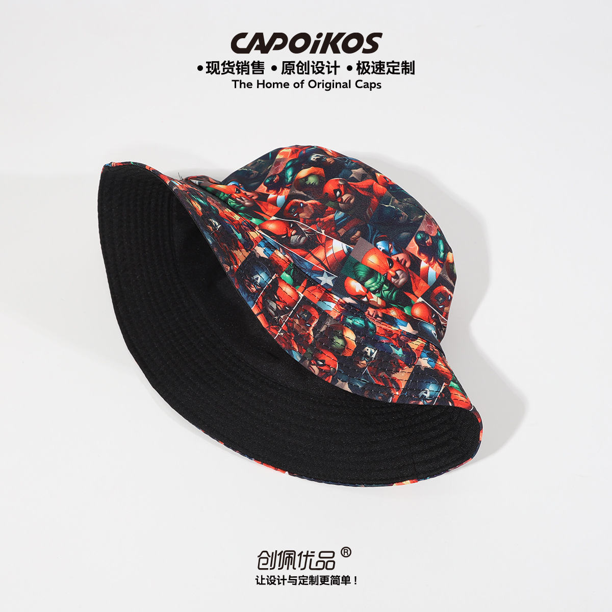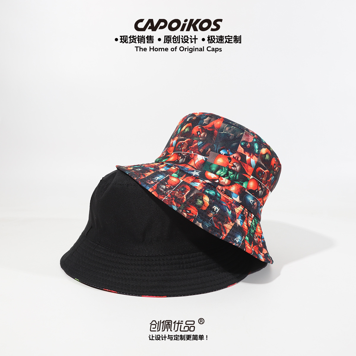 外贸成人渔夫帽跨境欧美英雄系列数码印花双面戴盆帽沙滩遮阳帽