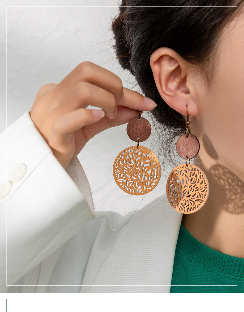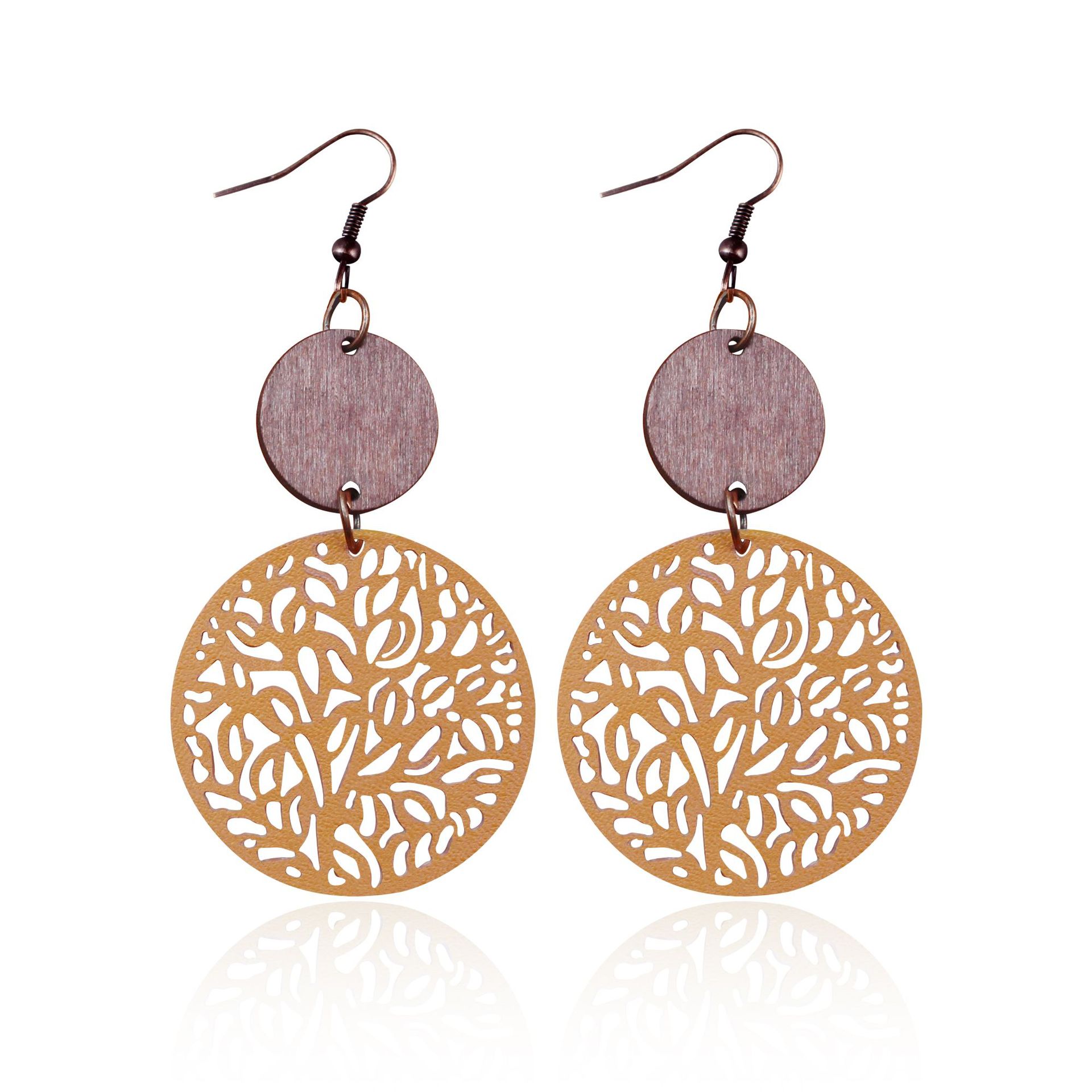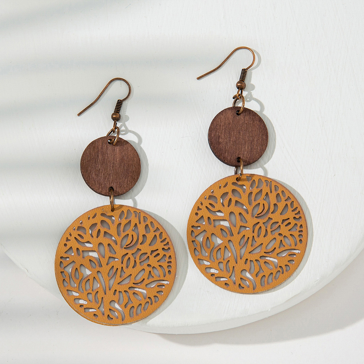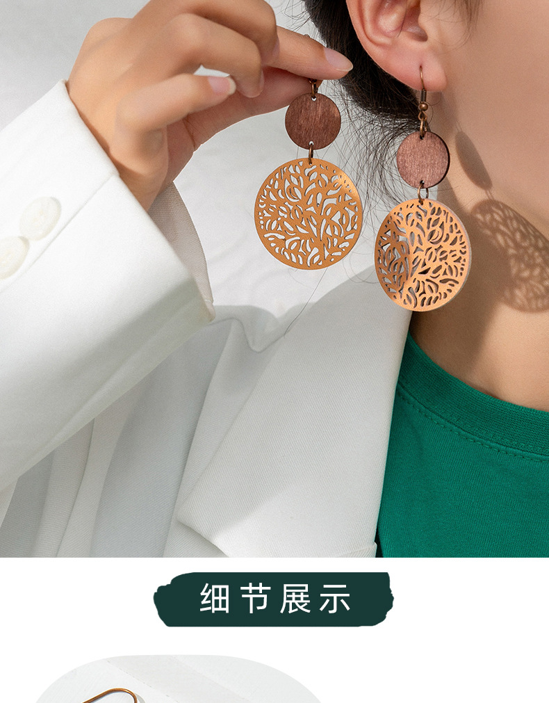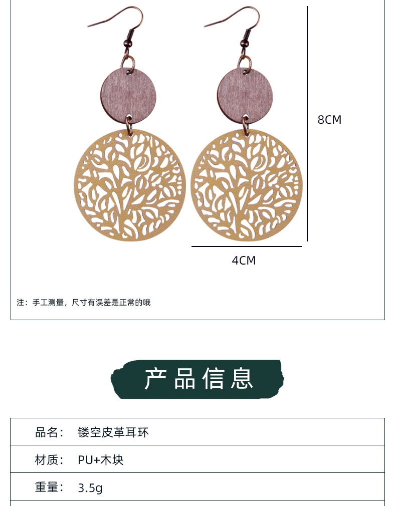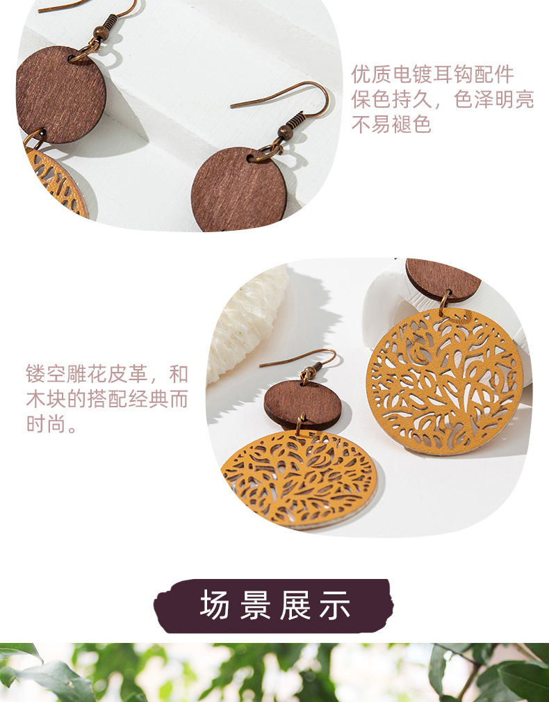 镂空雕花金色皮革圆形木片组合耳环耳坠跨境亚马逊耳饰