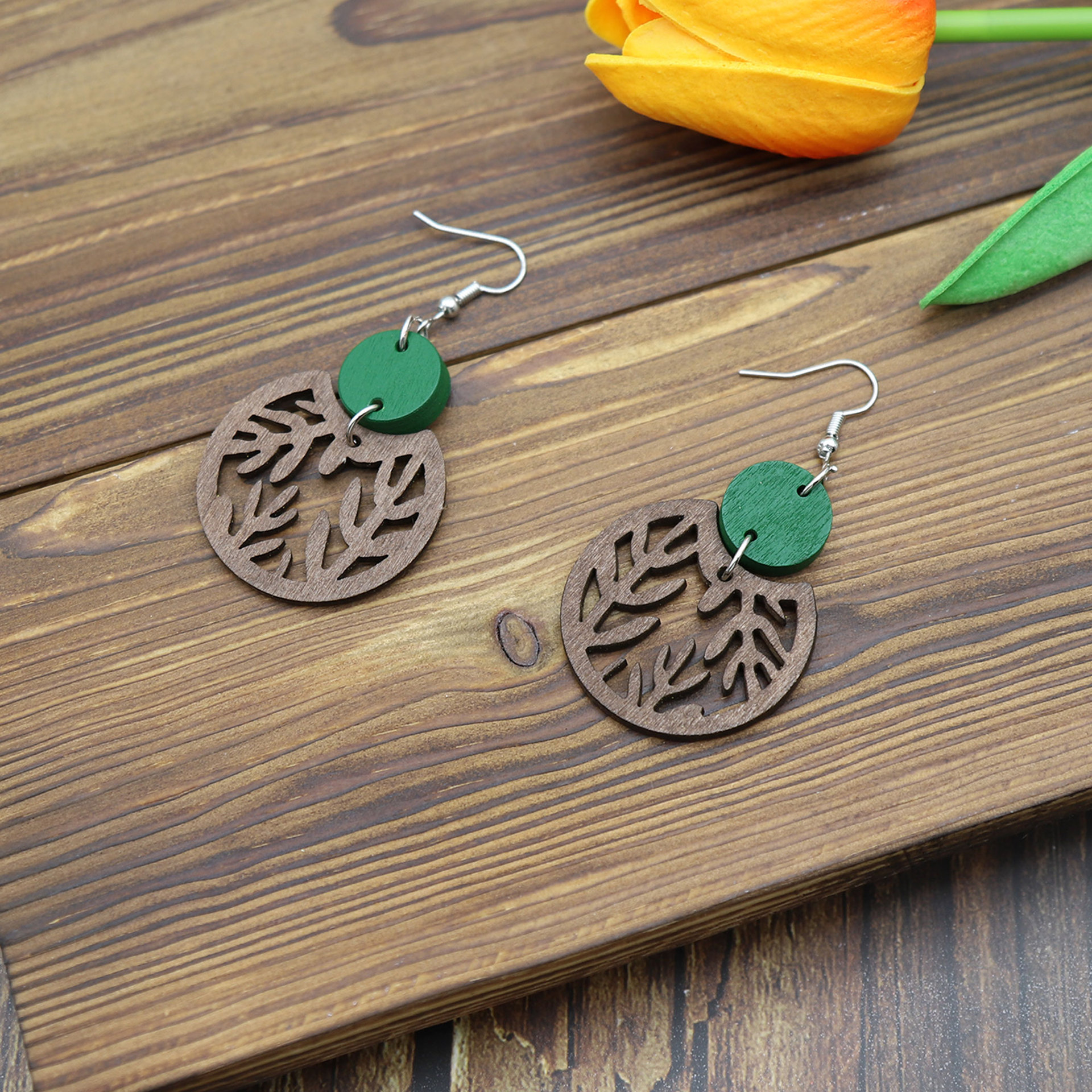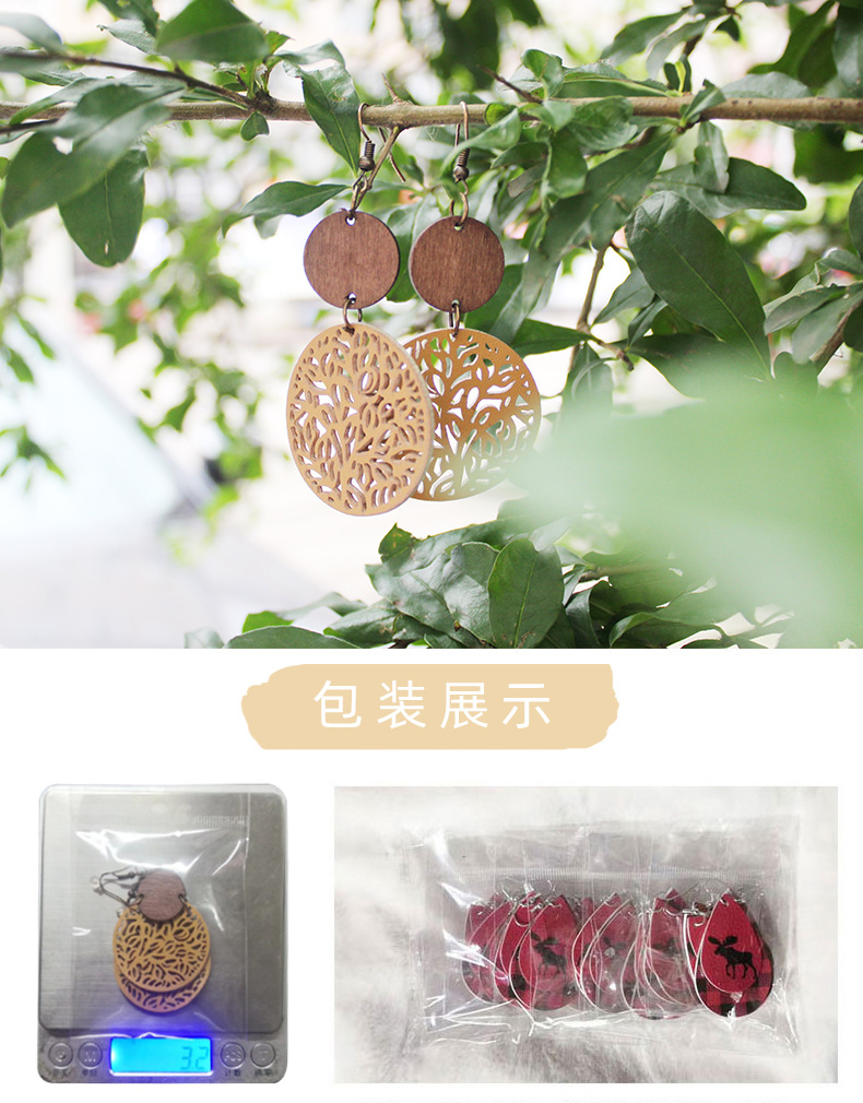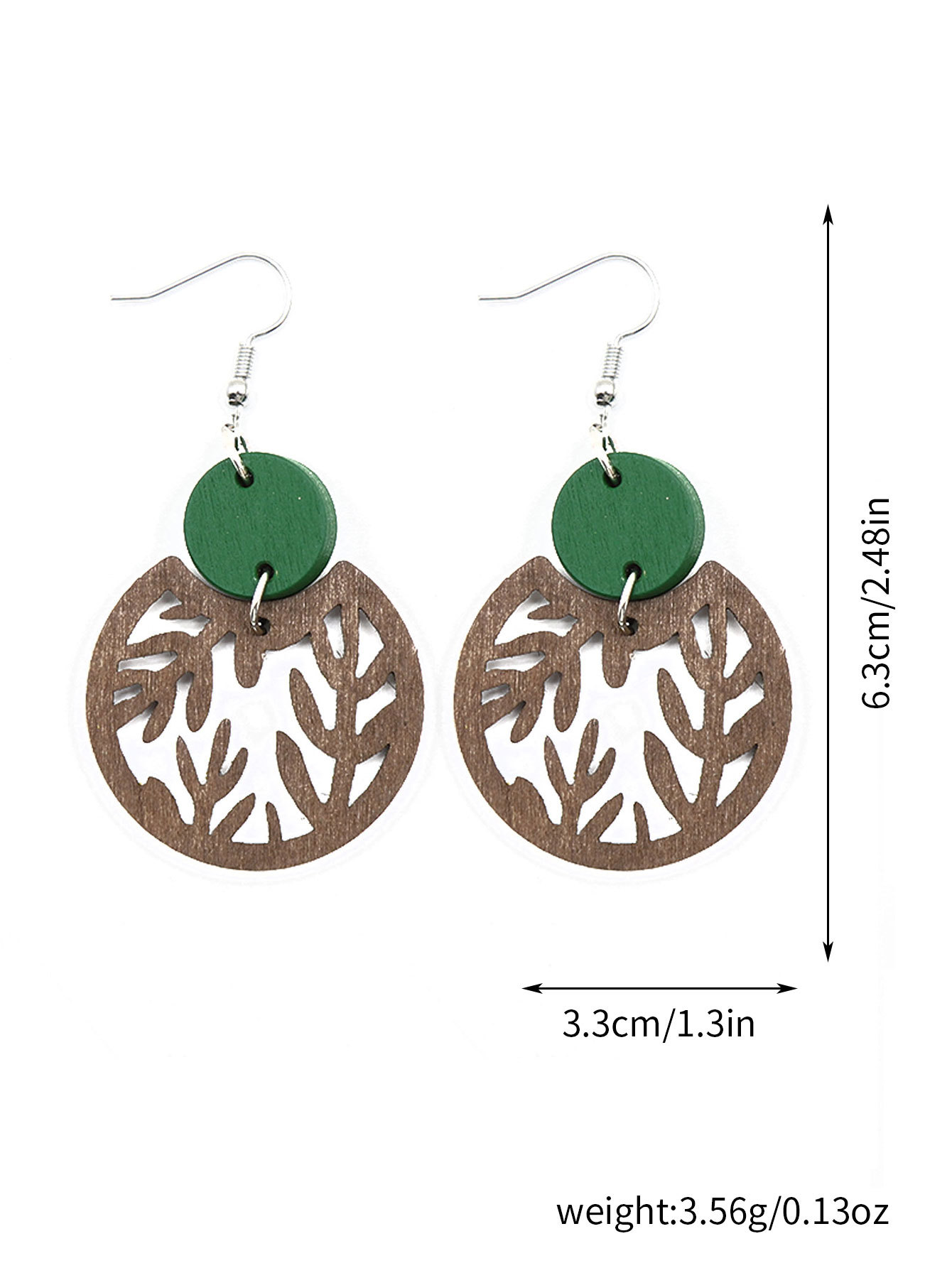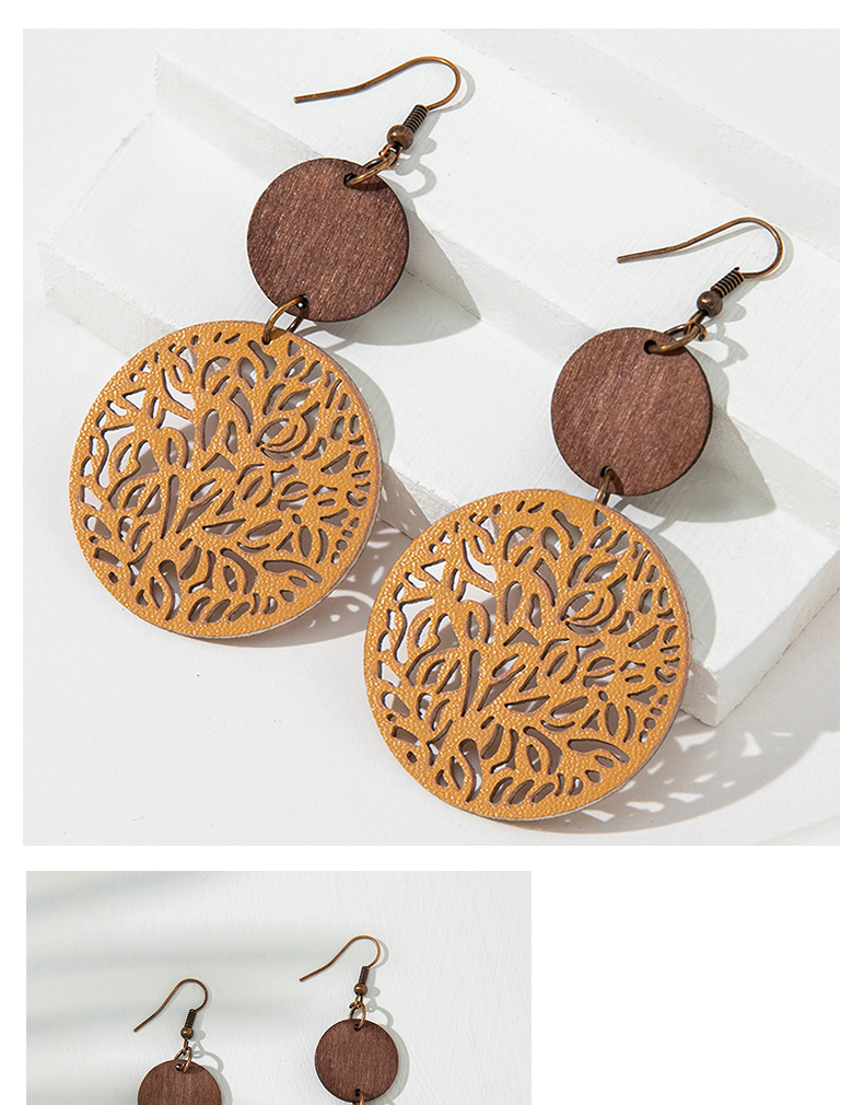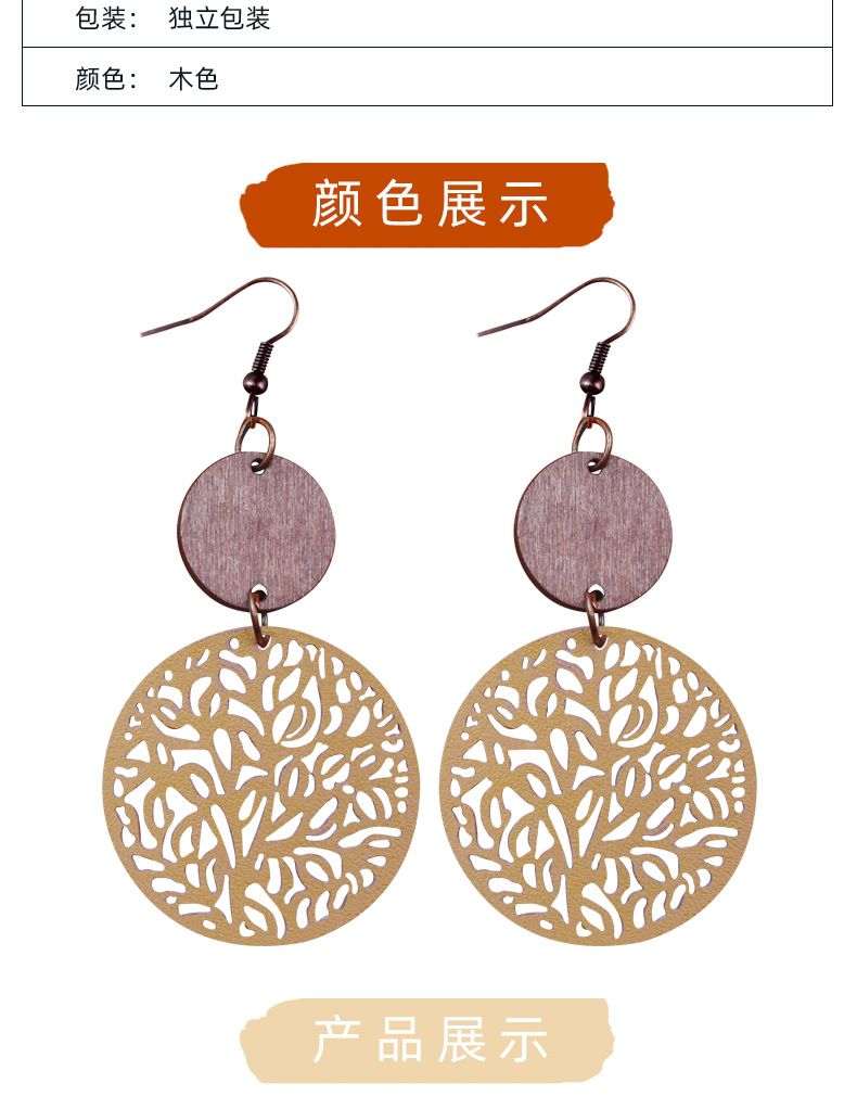 镂空雕花金色皮革圆形木片组合耳环耳坠跨境亚马逊耳饰