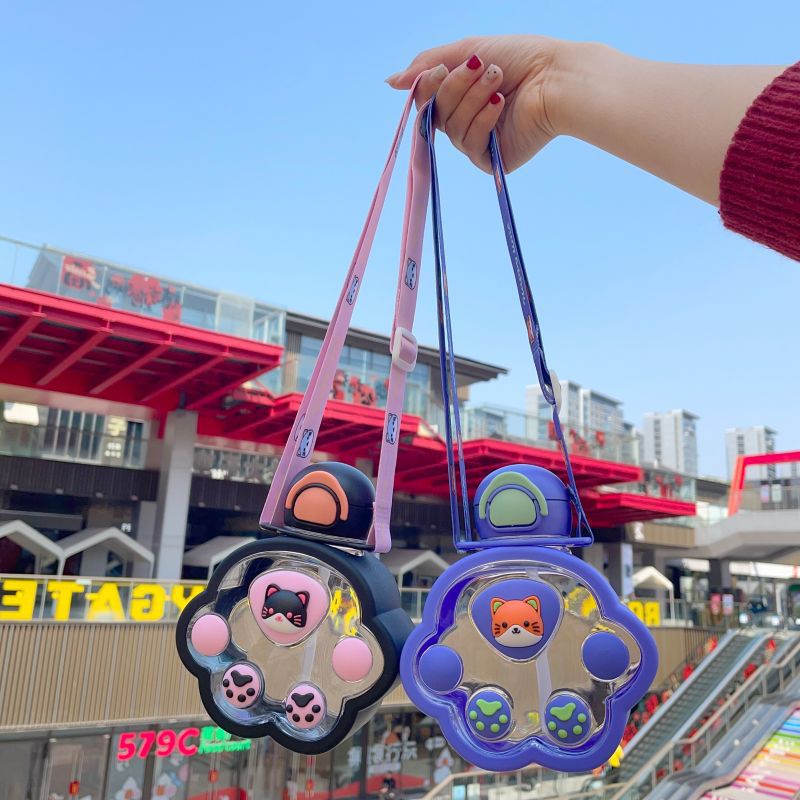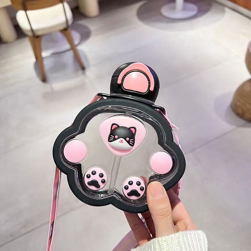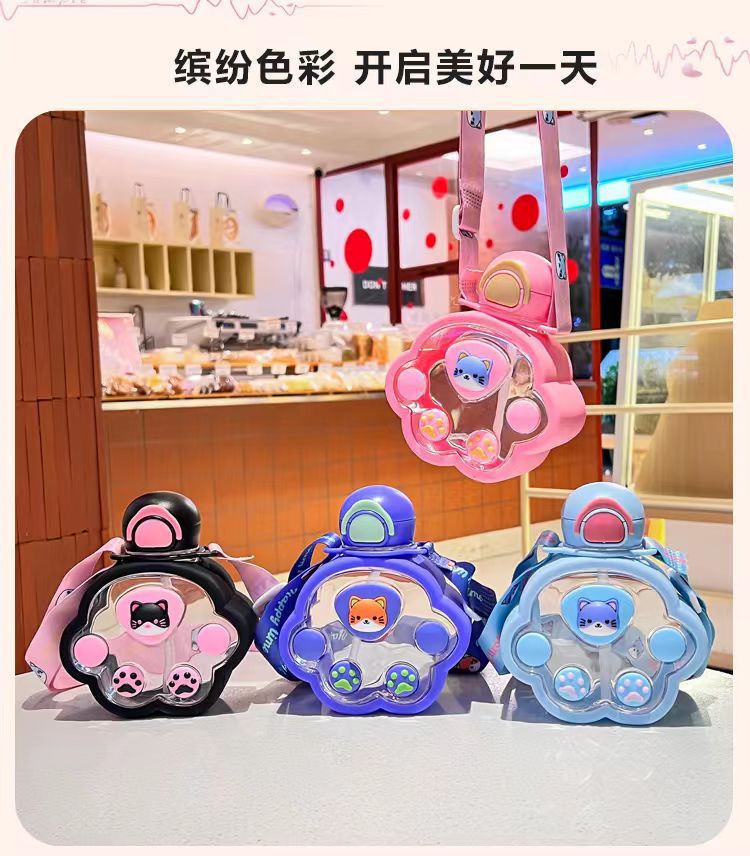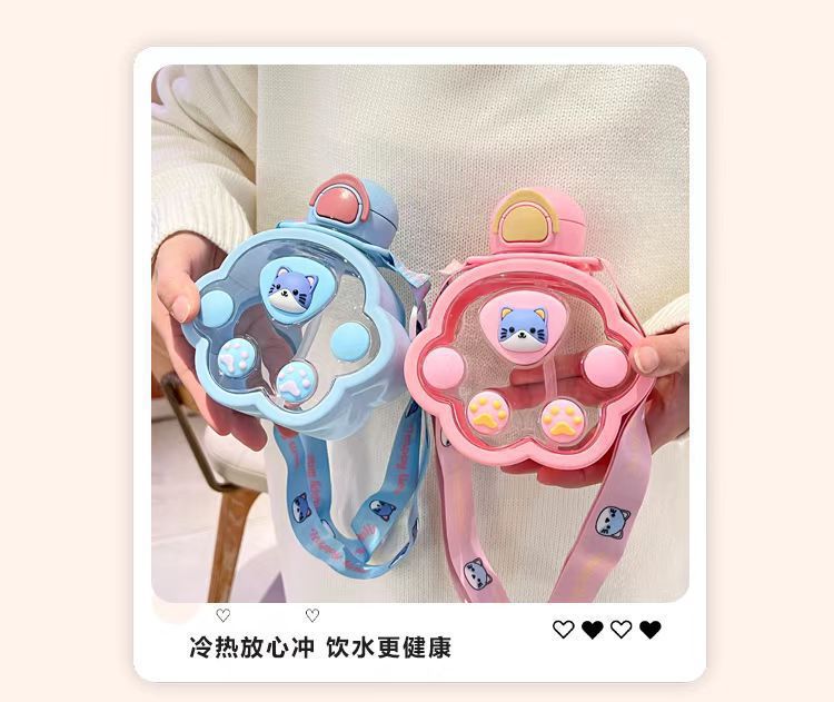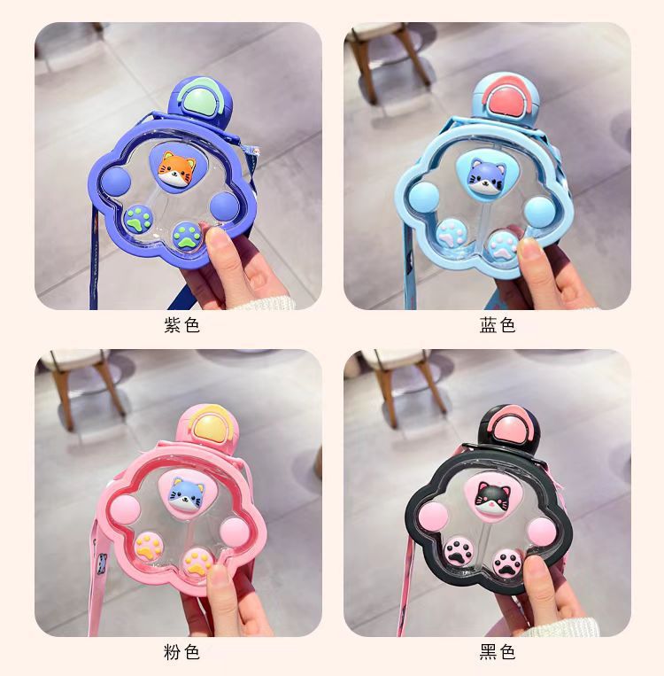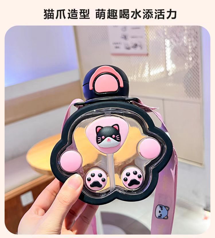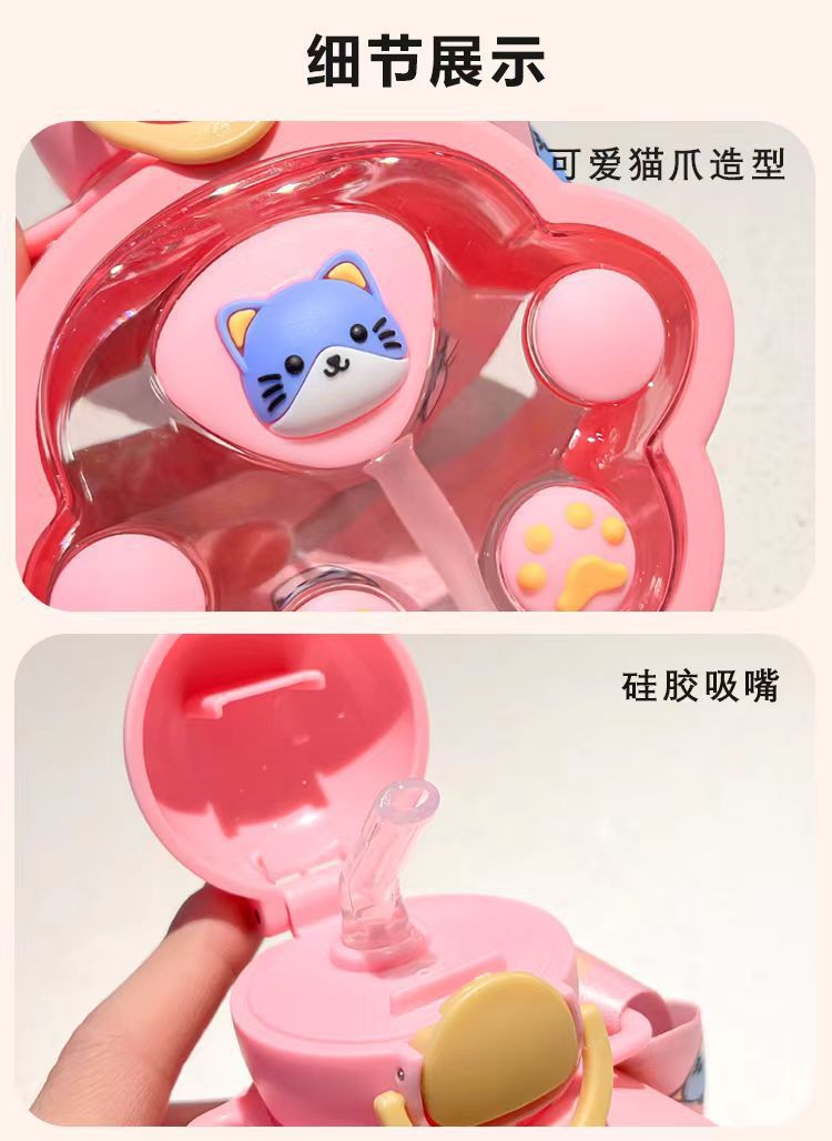 新款儿童猫爪塑料杯卡通吸管水杯创意男女学生背带便携大容量杯子